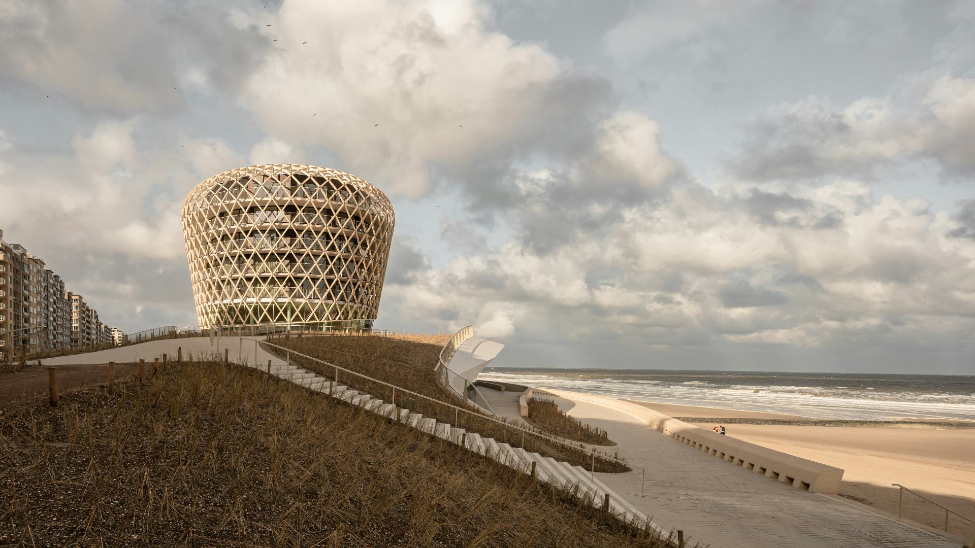 Het hotel, verbonden aan het evenementengebouw, siert de kustlijn met zijn raadselachtige, sculpturale silhouet. Een ingetogen, markant gebouw met een open raster van gekromde balken van Accoya hout. Dat straalt niet alleen de verbinding met de omgeving maar ook duurzaamheid uit. Want ook dat staat even zo zeer als veiligheid, functionaliteit, esthetiek en economische waarde centraal in het ontwerp. Gestreefd is naar een optimale energievoorziening, afvalverwerking en productieprocessen.