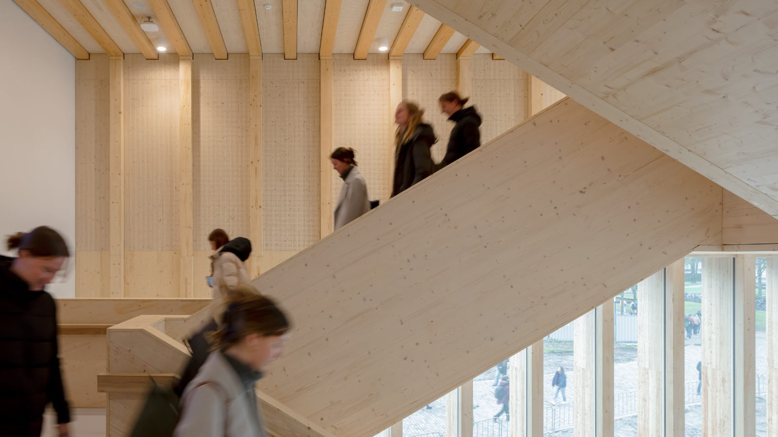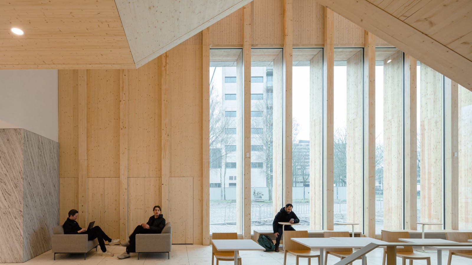 De circulaire ambities zijn weerspiegeld in het hernieuwbare karakter van de houten constructie, wanden, vloeren, trappen, kozijnen en afwerkingen. Het team heeft een uniek droogbouwsysteem toegepast. Deze houten ribbenvloeren – CTL-vloeren die versterkt zijn met balkjes – maken het mogelijk grote vrije overspanningen te maken die voldoen aan de hoge akoestische eisen die nodig zijn voor het programma.