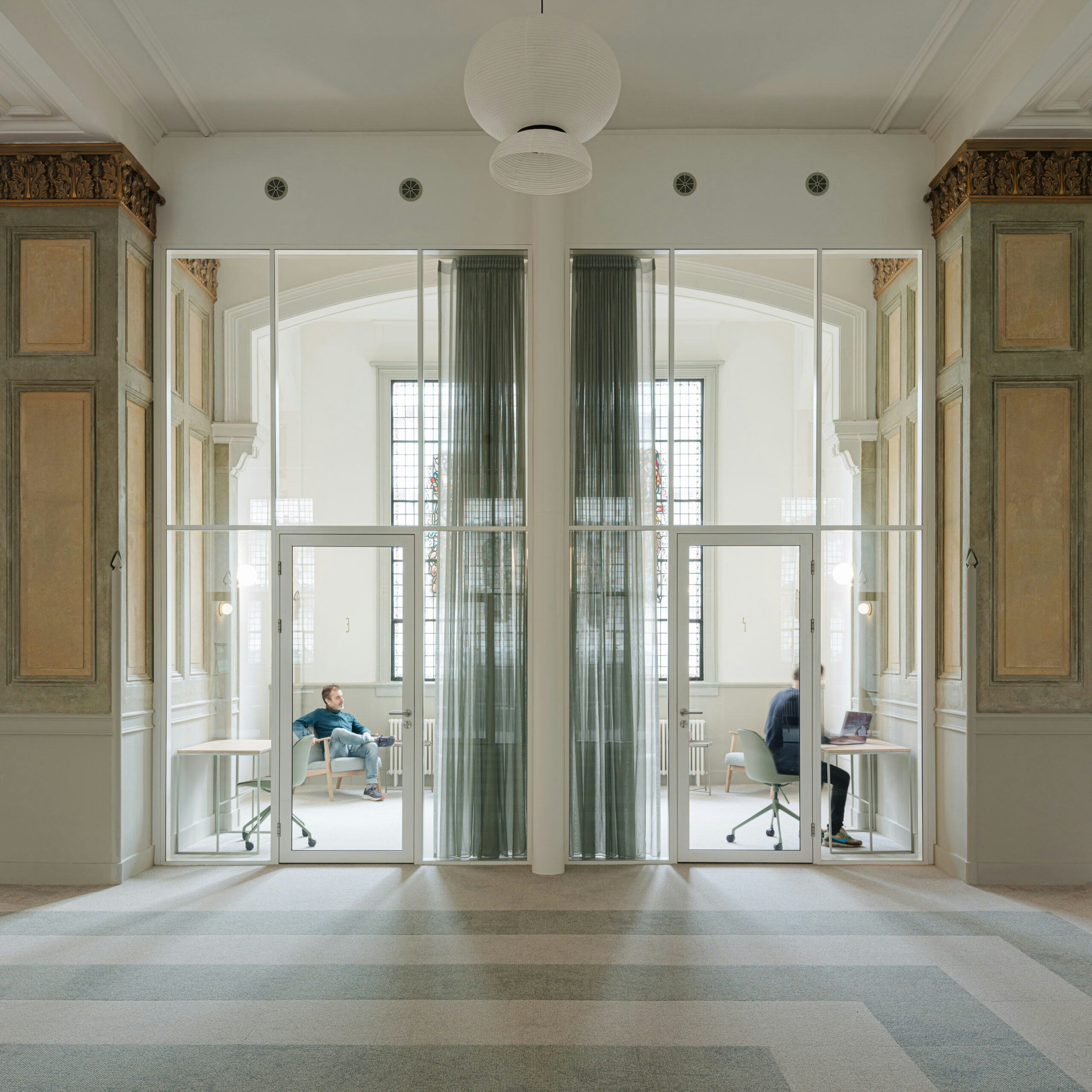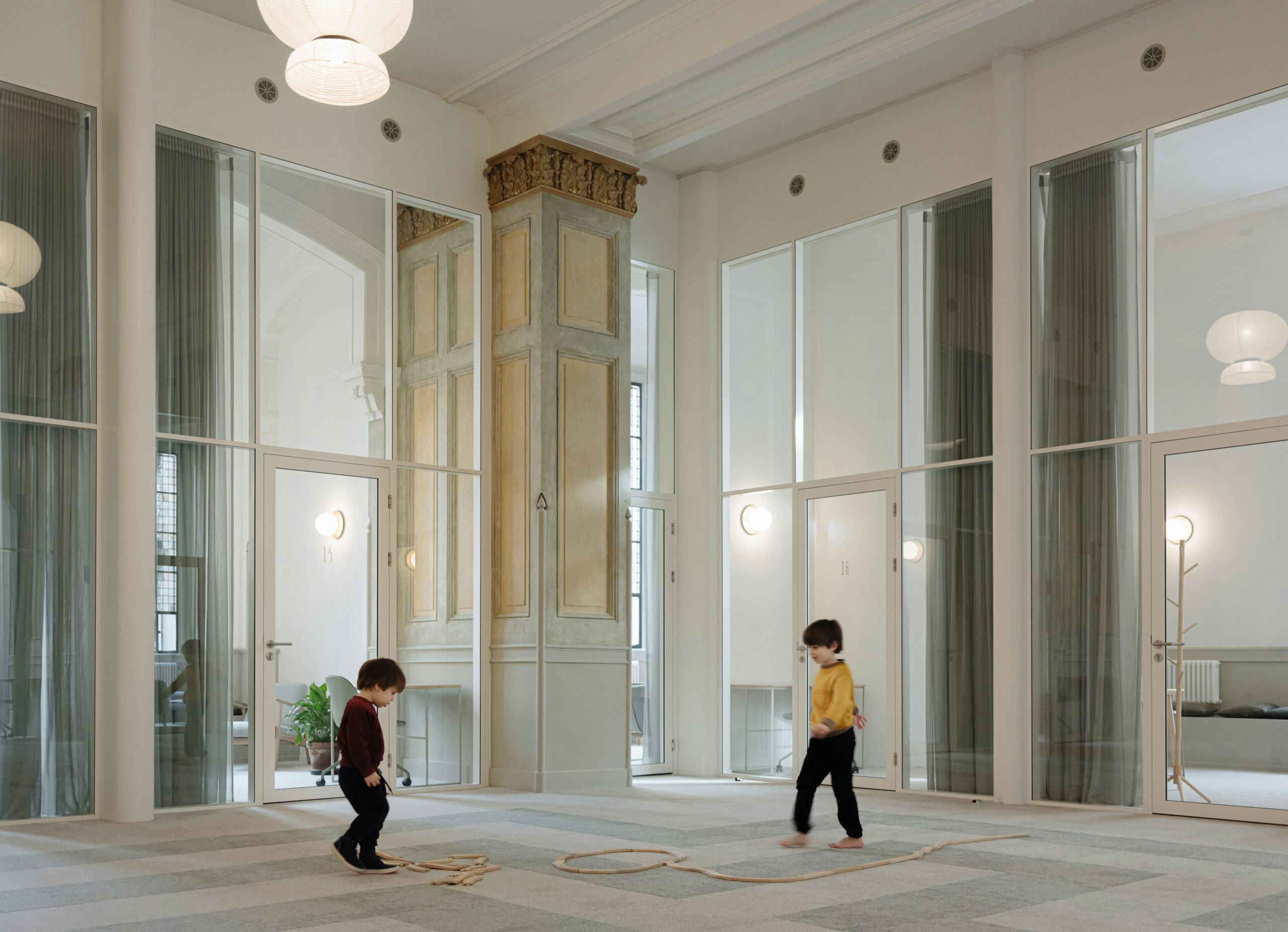 Zowel vanuit het personeel als vanuit de cliënten was de uitdrukkelijke wens om een interieur te maken dat welkom maar ook veilig zou voelen. Dit was mede de reden om kamers te creëren waarin de kwaliteit van de bestaande kapel voelbaar was en visueel verbonden zou zijn met de centrale schepen. Hierdoor heeft elke kamer zijn ‘eigen’ glas-in-loodraam en dringt het daglicht door tot het hart van de schepen. Door deze ruimtelijke opzet is er vanuit veiligheidsoogpunt goed overzicht op alle ruimtes. In het hart van het gebouw bevindt zich de kantoorruimte inclusief lunchruimte en keuken voor het personeel. Met de transparante opzet en het subtiele gebruik van groengrijze kleuren creëert het nieuwe ontwerp een harmonieuze en gastvrije sfeer waarin de rijke historie van het monument wordt gerespecteerd, omarmt en toch voelbaar.