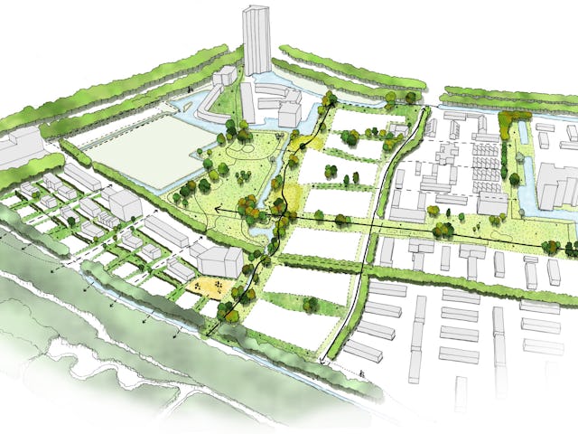 Het grote oppervlak openbaar groen in dit plan (circa 35%) maakt de buurt klimaatrobuust: het zorgt voor verkoeling, schaduw en infiltratie. Met behulp van ondergrondse waterkratten wordt het water zoveel mogelijk in het park behouden. Regenwater loopt via de vaste plantenbakken naar openbaar groen en wadi’s.