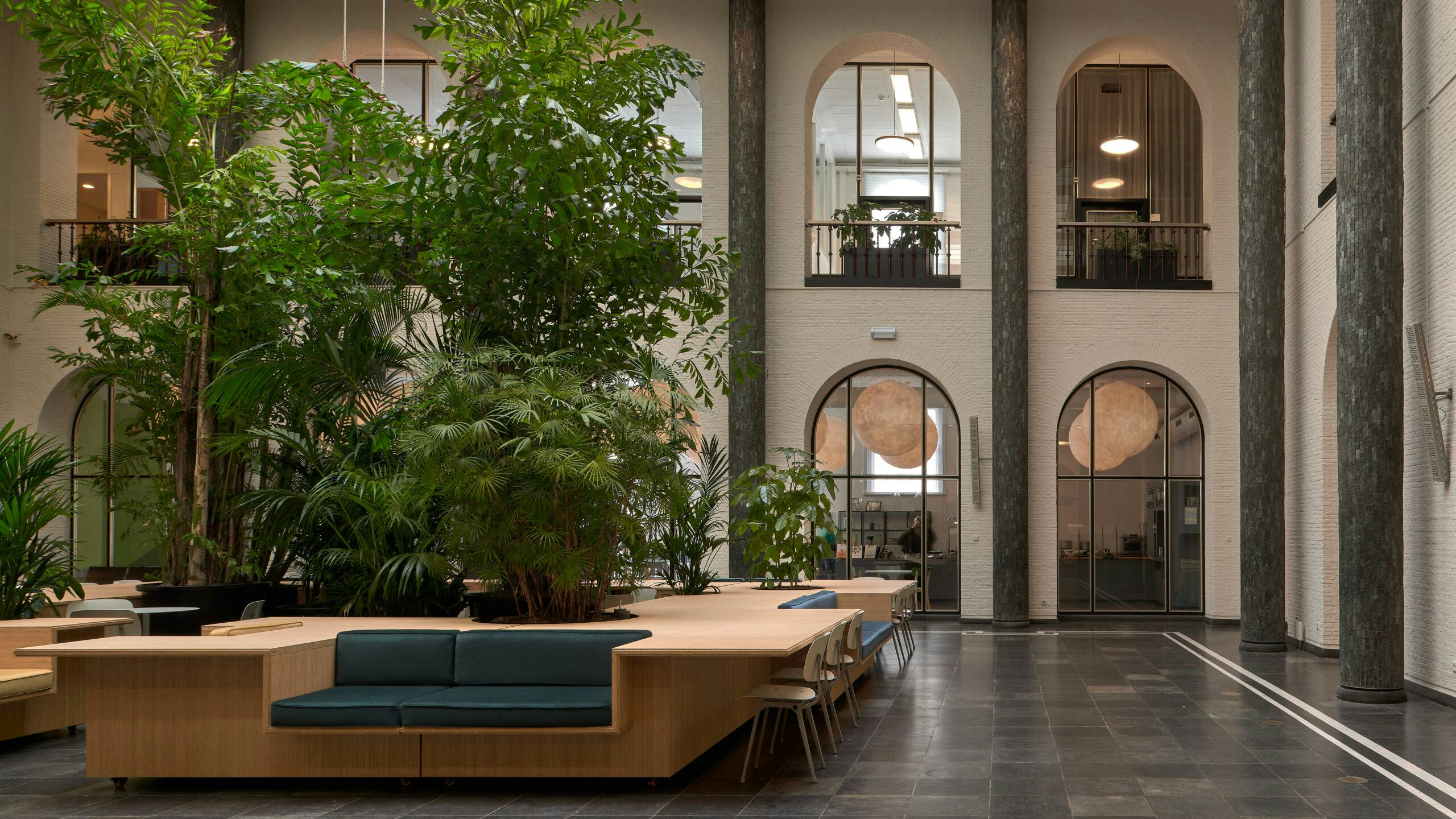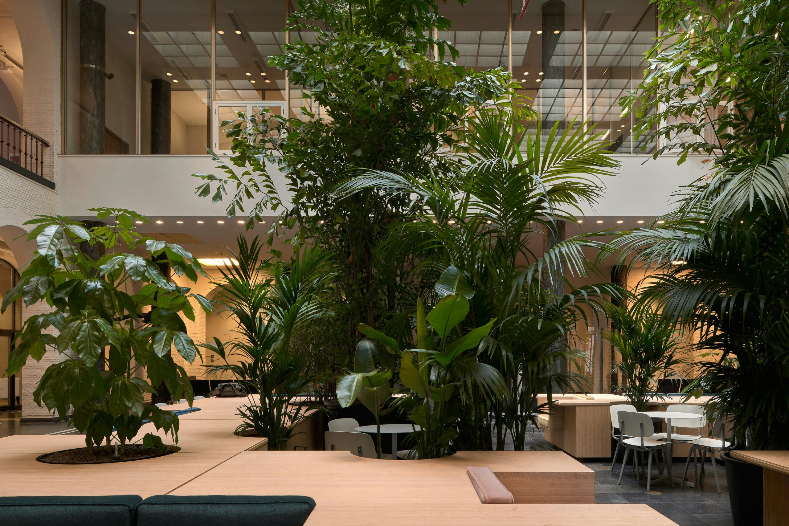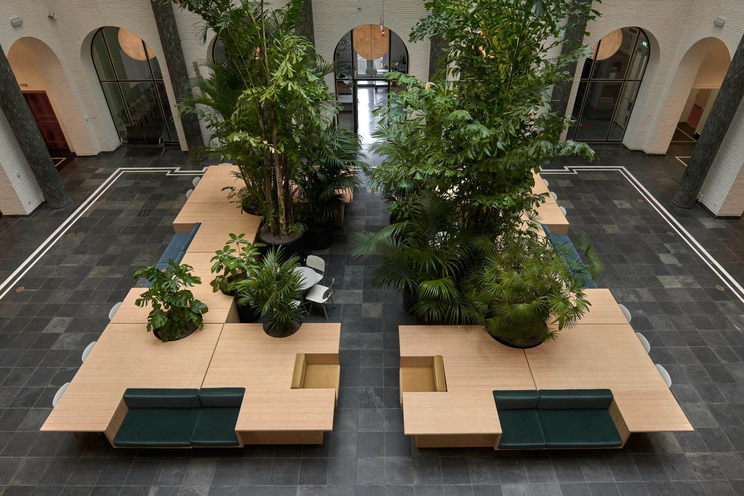 In gesprekken ontstond het idee om van de doorloop ruimte in de hal een binnentuin te maken met overleg en werkplekken tussen het groen. Tegelijkertijd moet de hal moeiteloos leeg gemaakt kunnen worden bij een evenement. Het landschap, twaalf verrijdbare eilanden, kan tussen de kolommen worden geparkeerd. De hal heeft zo twee uitersten indelingen: een lege vloer en een landschap met overleg en werkplekken. Het hoge groen geeft beschutting in de hal en vanaf de omloop op de verdiepingen.