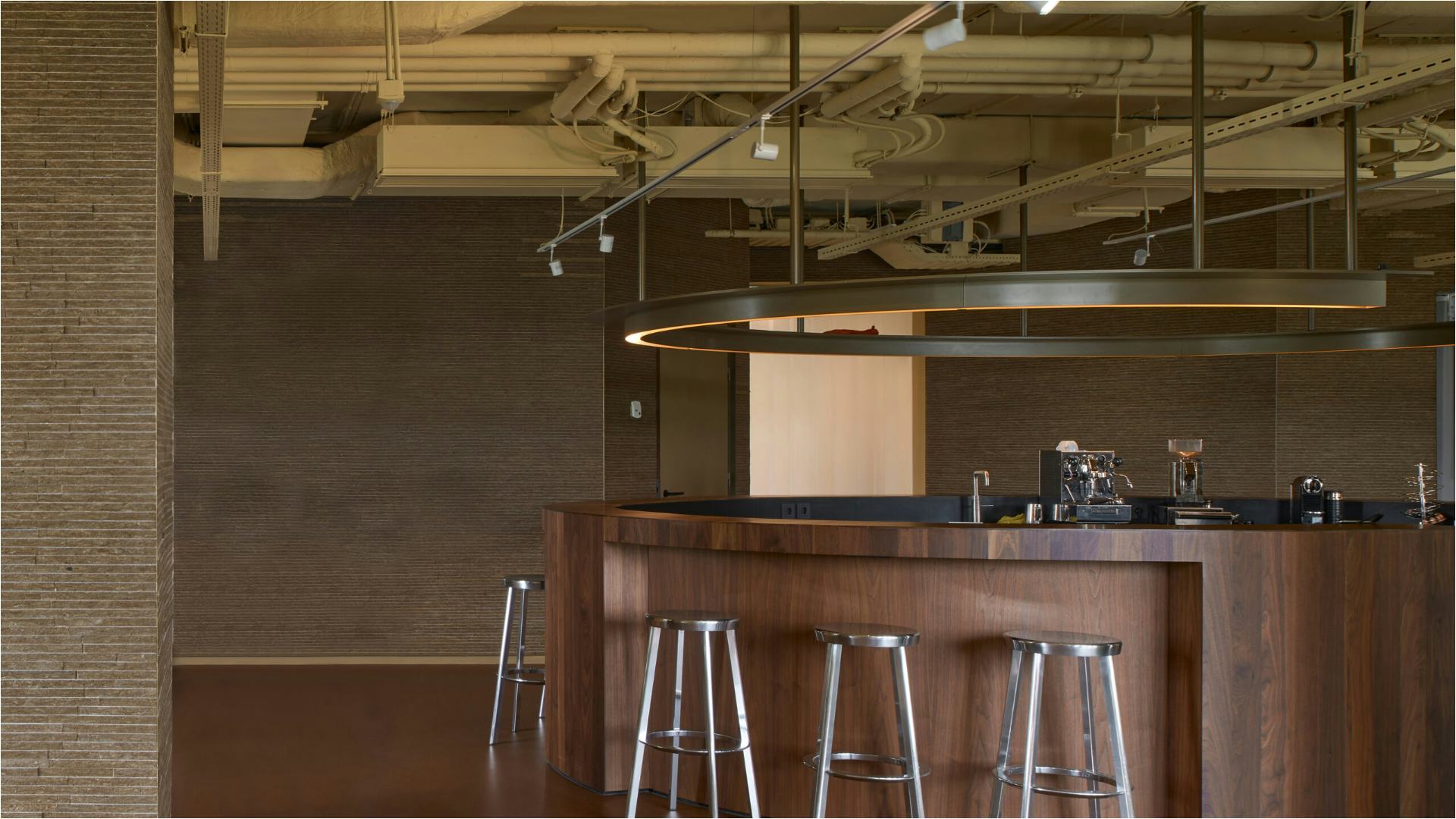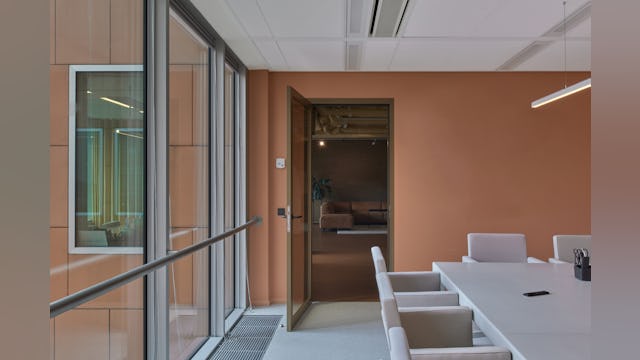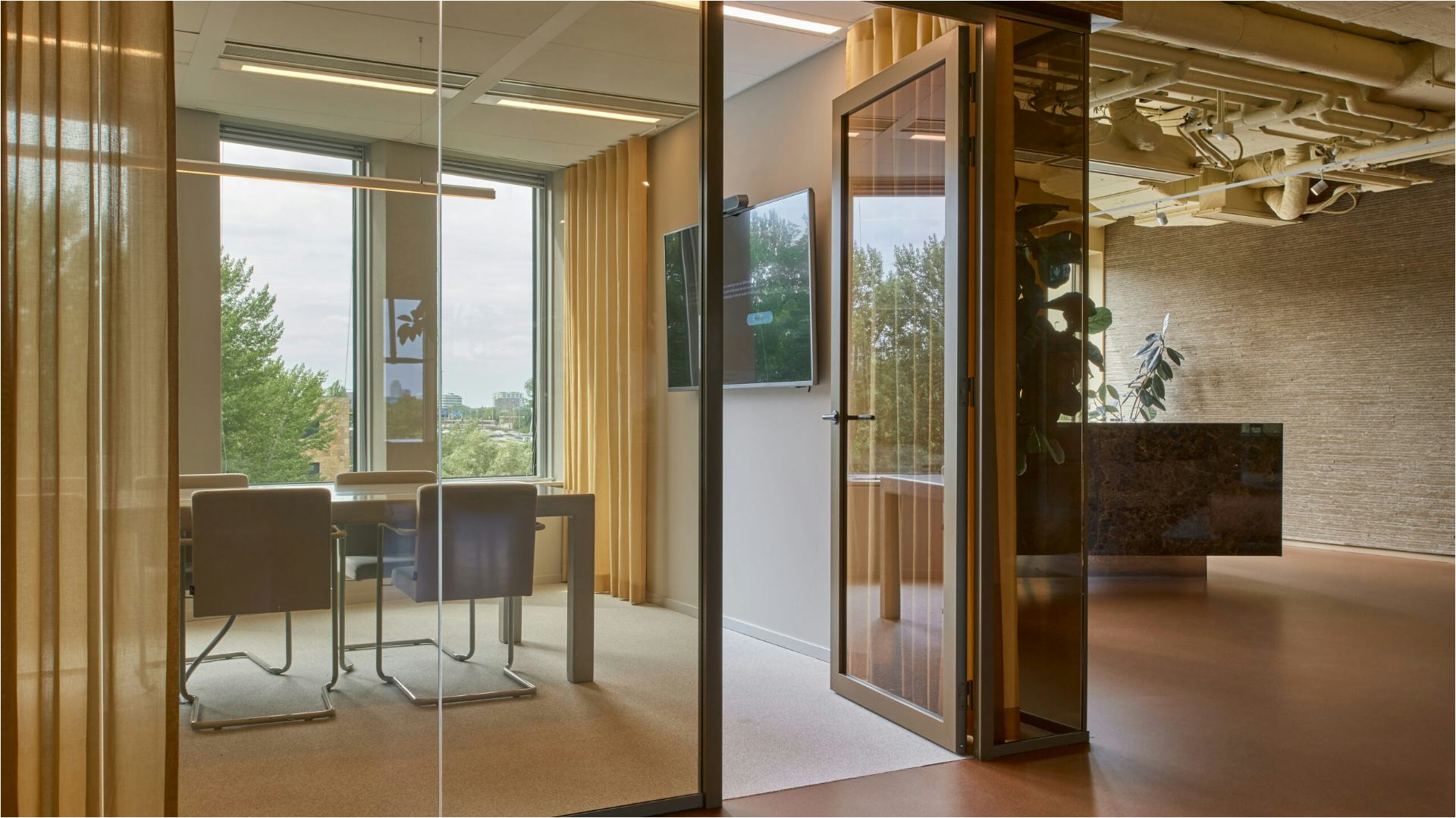 Het bestaande kantoorpand was van behoorlijke kwaliteit: er kwam voldoende licht binnen, vanuit verschillende oriëntaties, en de opdeling in drie geschakelde bouwvolumes leverde verrassende doorzichten en een zekere natuurlijke hiërarchie op die we hebben versterkt door ieder bouwvolume een eigen thema te geven: entree/bar, vergaderen/ontmoeten, en geconcentreerd werken. De overgang naar de stiltegbieden hebben we fysiek voelbaar gemaakt met kunststof stroken, met verlichting erachter.