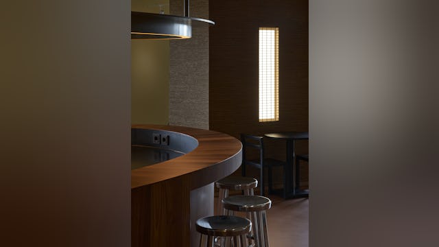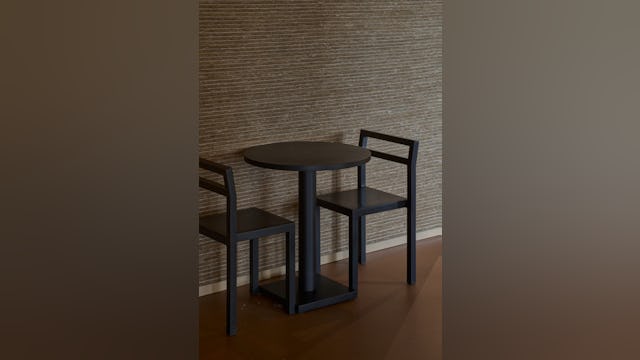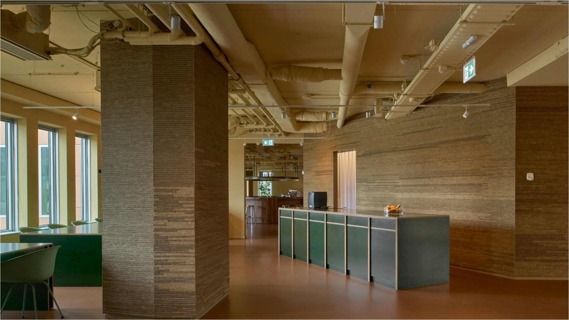 Naast de plafondplaten die zijn hergebruikt als wandbekleding hebben we ook al het losse én het maatwerkmeubilair volledig hergebruikt uit hun vorige interieur: de groene betonplex tafels en keuken, de driehoekige natuurstenen DJ booth, TV meubel van kurk en de strokengordijnen. Nieuw toegevoegde materialen zoals het akoestisch spuitwerk en het tapijt zijn cradle 2 cradle, de gietvloer is van duurzaam gietkurk en er is geen mdf gebruikt. Daarnaast heeft het interieur een BREEAM excellent score.