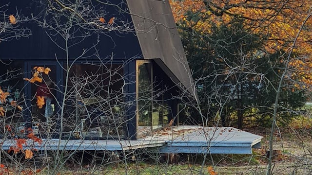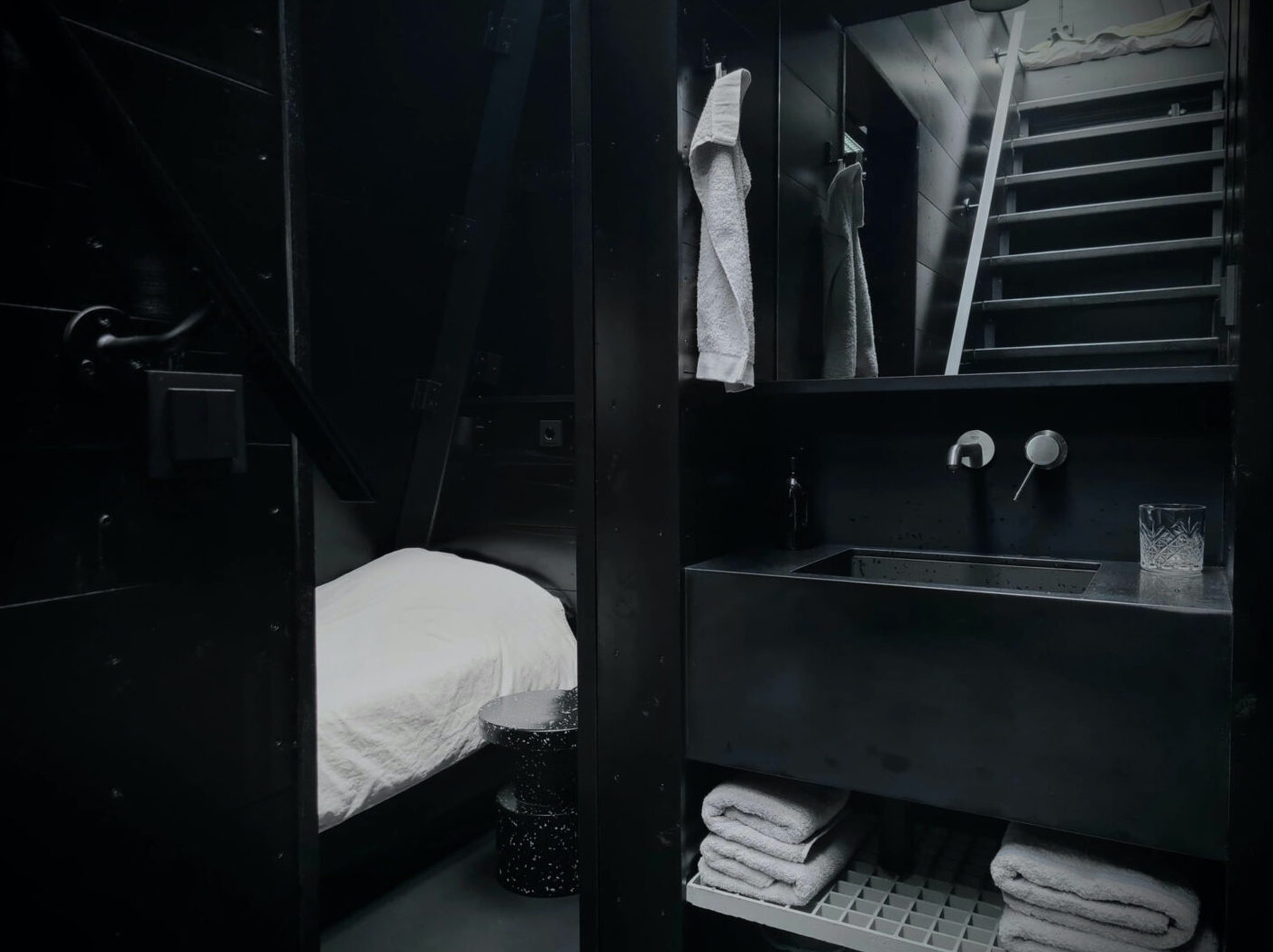 De zwarte gevel is opgetild, waardoor er op maaiveldniveau rondom zicht is op de omgeving. Het donkere interieur richt de blik sterk op de omgeving. Boven zijn de slaapplaatsen. Hier ben je volledig 'binnen', als in een scheepsinterieur. Het dak wordt gevormd door een groot raam dat spectaculair zicht biedt op de sterrenhemel.