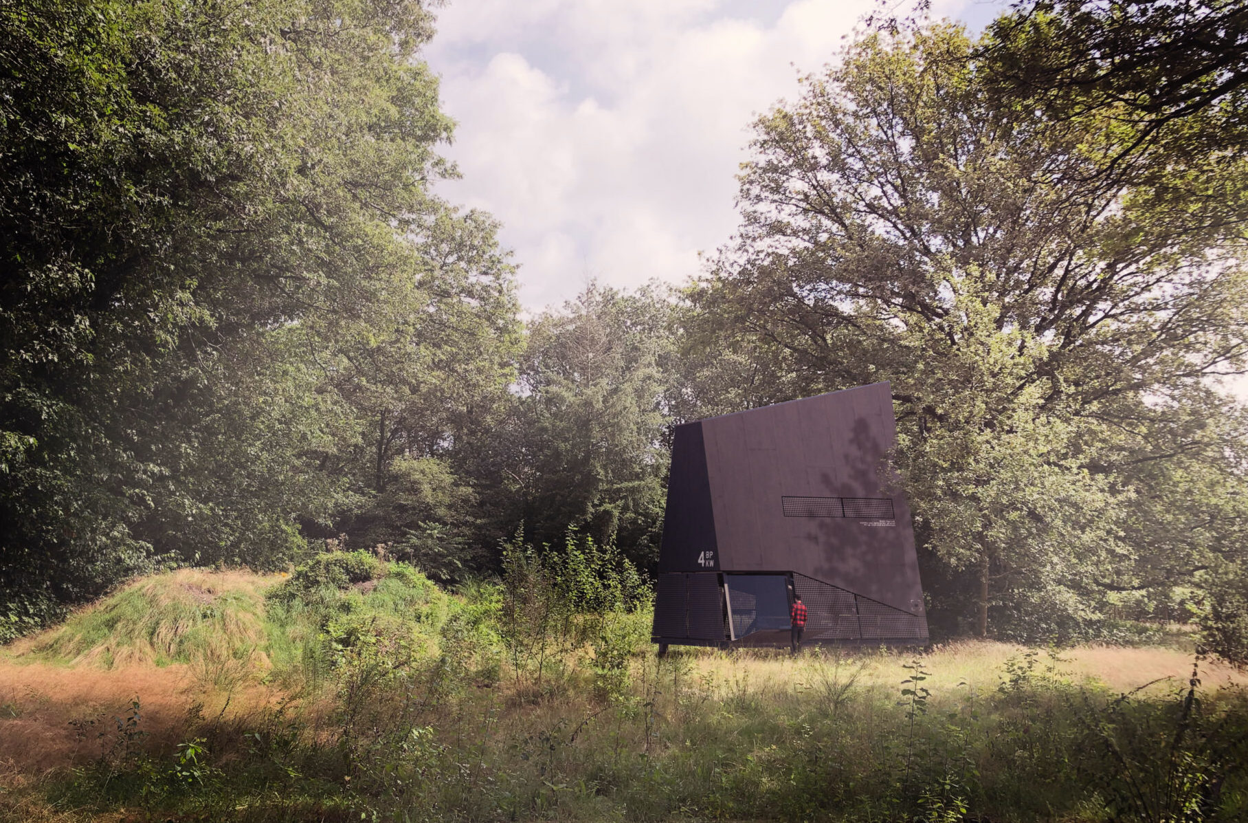 Het verblijf neemt op bescheiden manier plaats in bos. Het verblijf staat met zijn rug naar de naastgelegen oude eik gekeerd. Op die manier is er minimale verstoring van het leven in en rond de boom, zowel qua activiteit als qua licht. Met zijn lichte constructie, fundering op schroefpalen en opgetilde roostervlonders blijft het gebouw zoveel mogelijk los van de bosbodem. Het wekt de indruk zojuist geland te zijn en zo weer op te kunnen stijgen.