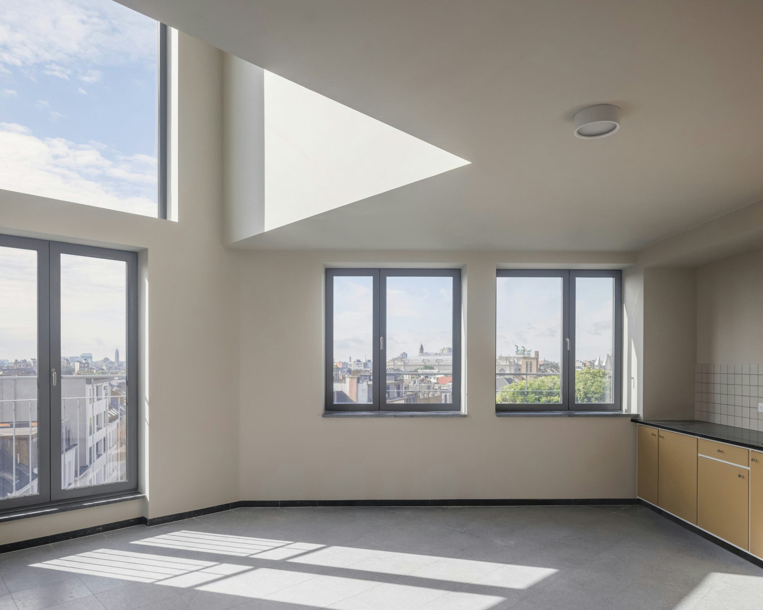 Het plan bouwt voort op de aantoonbaar duurzame materialiteit voor de lange duur. Zowel van binnen als van buiten is met eenzelfde zorg als Fierens aan de materialiteit gewerkt. We deden bijvoorbeeld uitgebreid onderzoek naar het kleurgebruik en brachten de polychromie van Fierens terug. Elke woning heeft een nieuwe Fierenstegelvloer en typische Fierenskeuken gekregen.