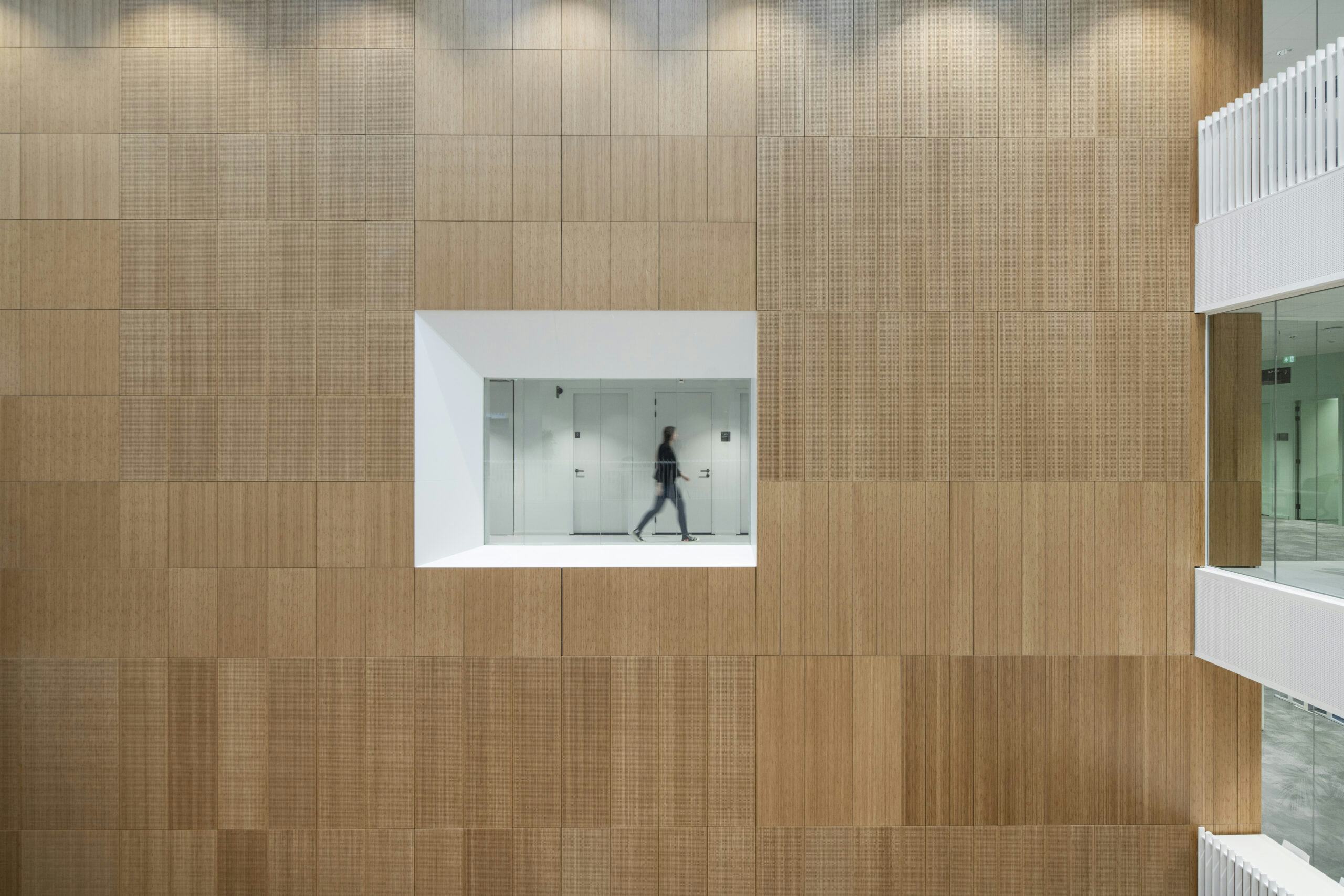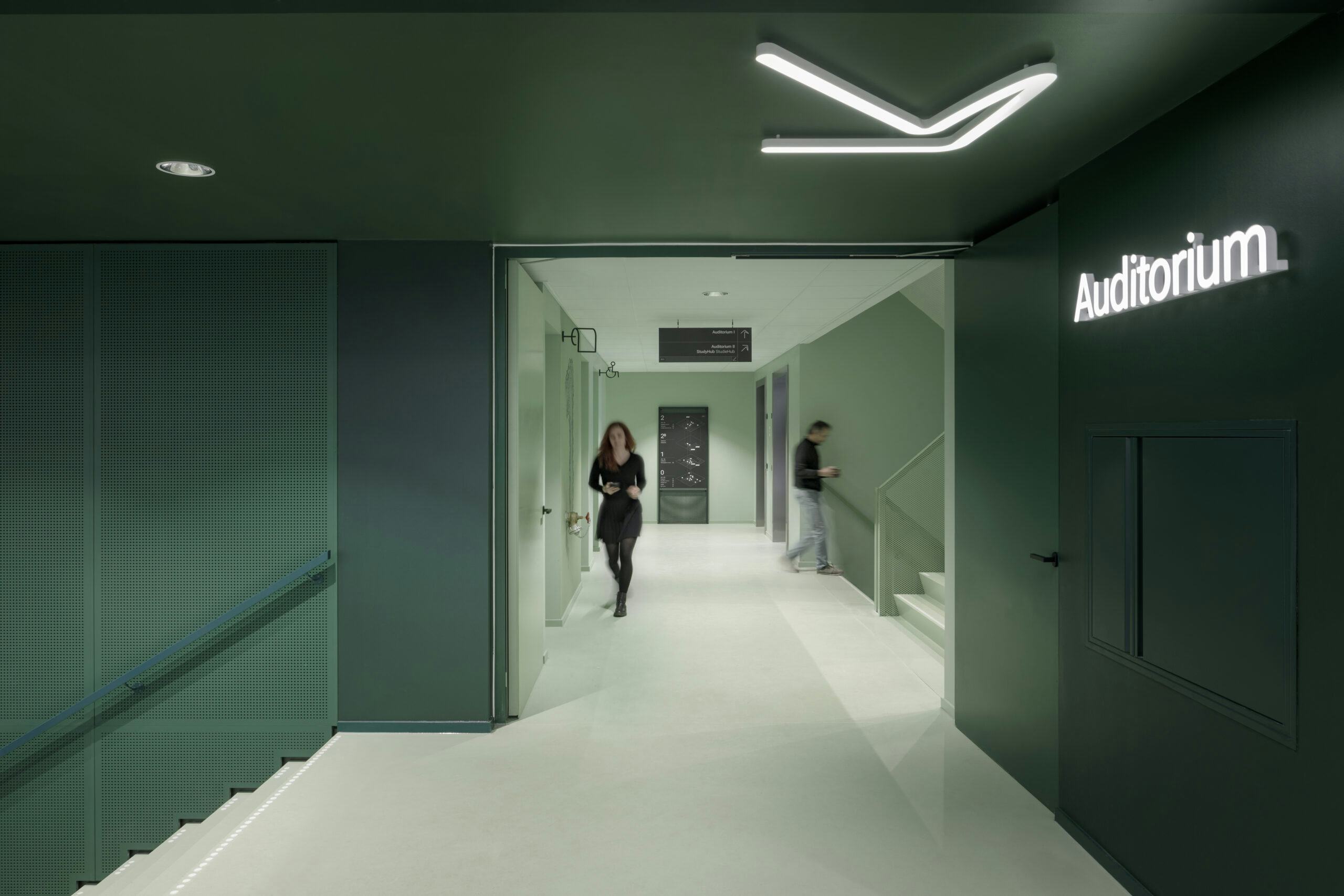 Akoestische oplossingen zijn geïntegreerd in het interieur: geperforeerde wanden vormen voor alle drie de gebouwen een zichtbaar en grafisch element, passend in het ontwerp. Perforaties en geluidsabsorberend materiaal zijn verwerkt in en achter monolithische groene, witte en uit bamboe gematerialiseerde wanden. Bestaand meubilair is hergebruikt, aanvullend nieuw meubilair werd passend bij het bestaande geselecteerd – naast eisen op vlek-, kras- en slijtvastheid.
