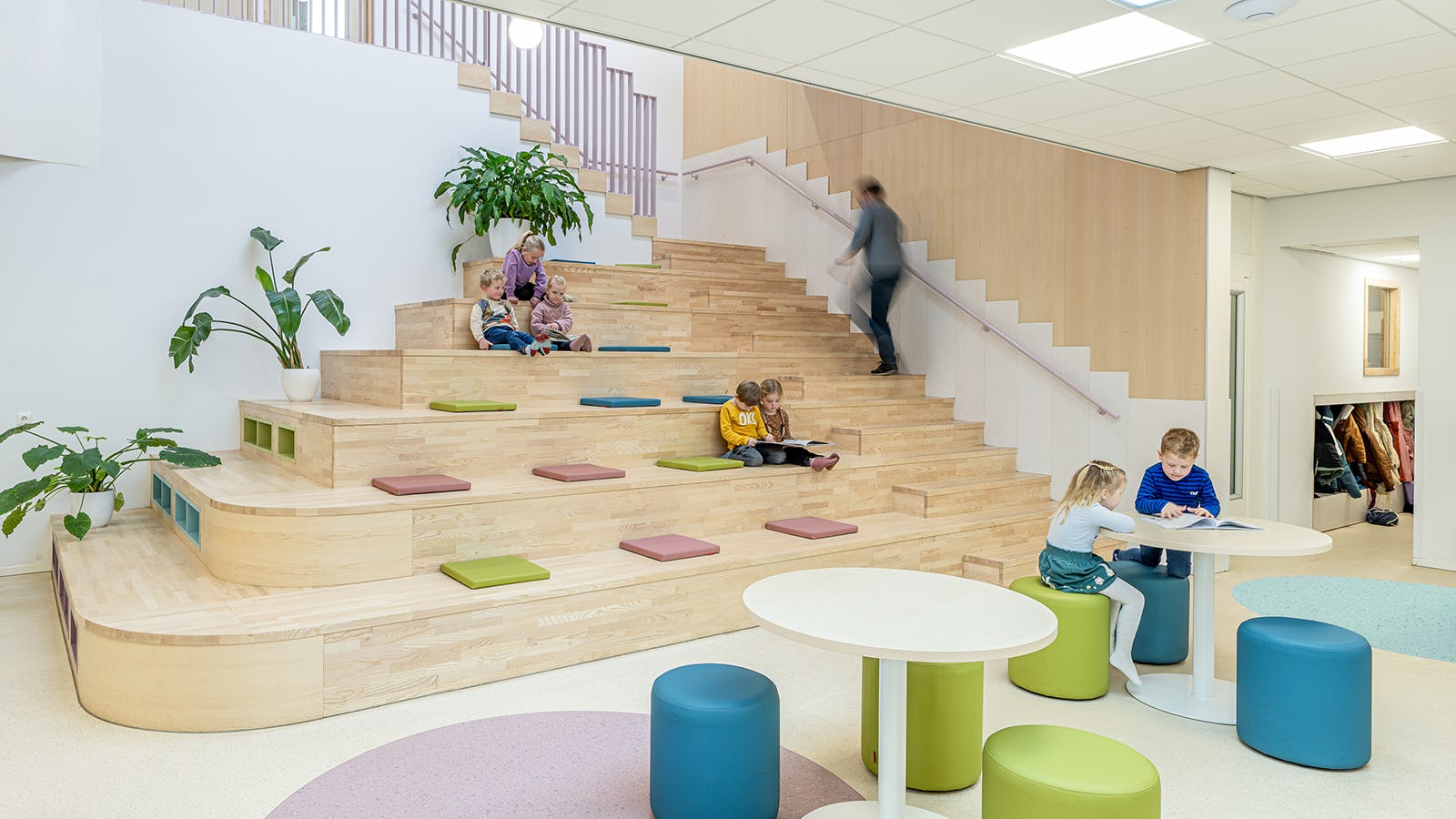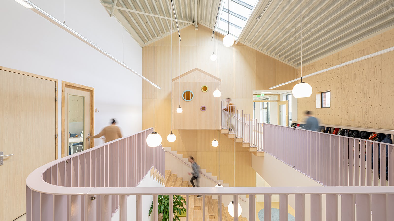 De bijzondere architectuur met kenmerkende houten accenten en huiselijke details, creëren een stimulerende omgeving die nieuwsgierigheid en onderzoek aanmoedigt. Met in het bijzonder het ‘zwevende huisje’ boven de tribunetrap. Een beschutte plek, alleen voor kinderen van de school. De zachte kleuren in combinatie met de houten inrichting geven een warme uitstraling. Het interieur weerspiegelt de architectonische stijl met houten accenten en huiselijke details, zoals lambrisering en balustrades.
