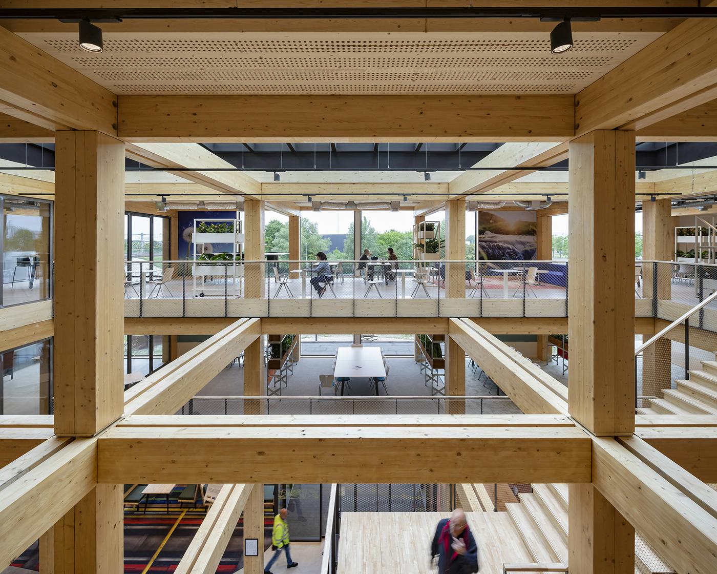 Een belangrijk aandachtspunt was het verbinden van de kantoormedewerkers en collega’s uit de werkplaatsen. De centrale houten trappen in het grote atrium van het kantoorgebouw creëren een omgeving die ontmoetingen en interactie stimuleert. Een unieke ‘zwerftrap’ verbindt elke verdieping op een andere plek en biedt een spannende route door het kantoor. Hierdoor krijgen de blauwe- en witteboorden arbeiders die in de gebouwen gehuisd worden ook de kans om elkaar tegen te komen.