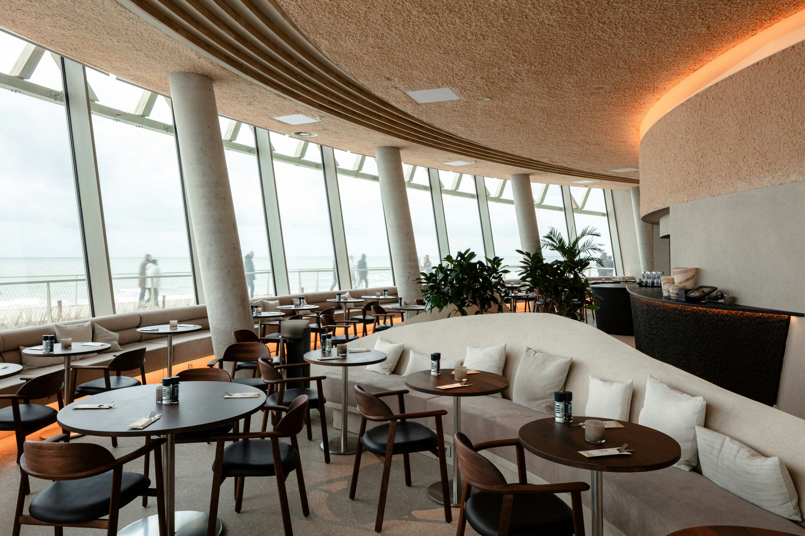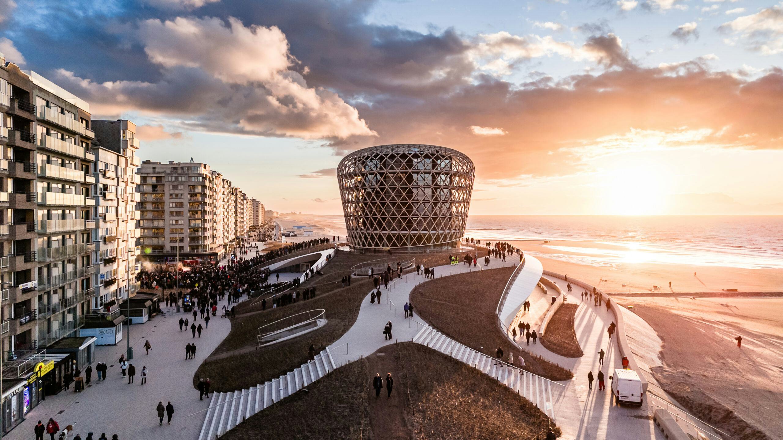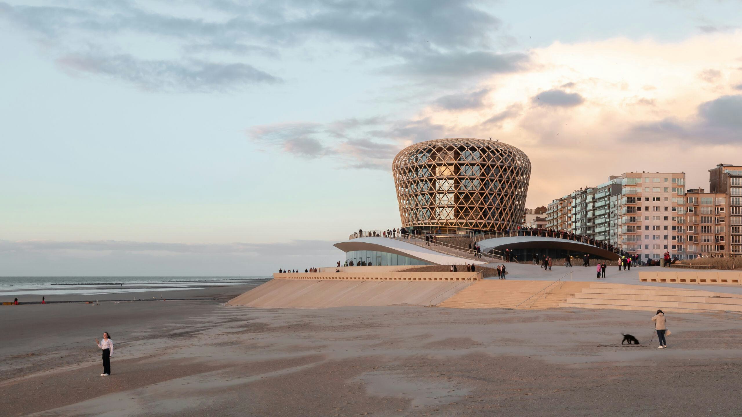 De vloeiende lijnen van het landschap lopen door in de gebogen lijnen van het gebouw. Met zijn ovale vorm heeft het een complexe geometrie, die door ZJA parametrisch is ontworpen. De constructie van de zeewering en het gebouw is van gewapend beton. Voor de afwerking van de gevel is gekozen voor materialen die het zilte kustklimaat goed kunnen doorstaan: keramiek voor de luifels en Accoya hout voor het grid rondom. Beide zijn computergestuurd geproduceerd.