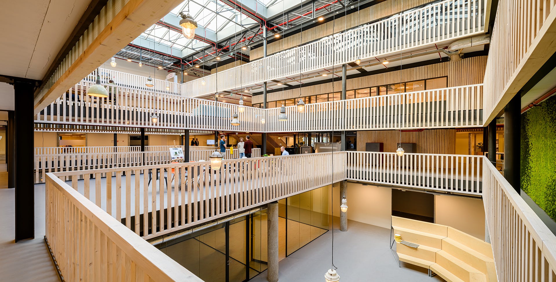 Er is in het hele gebouw gekozen voor een ingetogen, industriële en warme sfeer, met hout in de hoofdrol. Geoogst balkhout is verzaagd en gebruikt als de akoestische wandbekleding en de oorspronkelijke stalen binnenpuien - karakteristiek voor de bouwperiode - zijn eveneens opnieuw ingezet. Voor de publieke ruimten zijn hergebruikte lampen toegepast uit andere industriële gebouwen die passen bij de sfeer van de Titaan. Blikvanger is de grote, akoestische moswand van vier verdiepingen hoog.