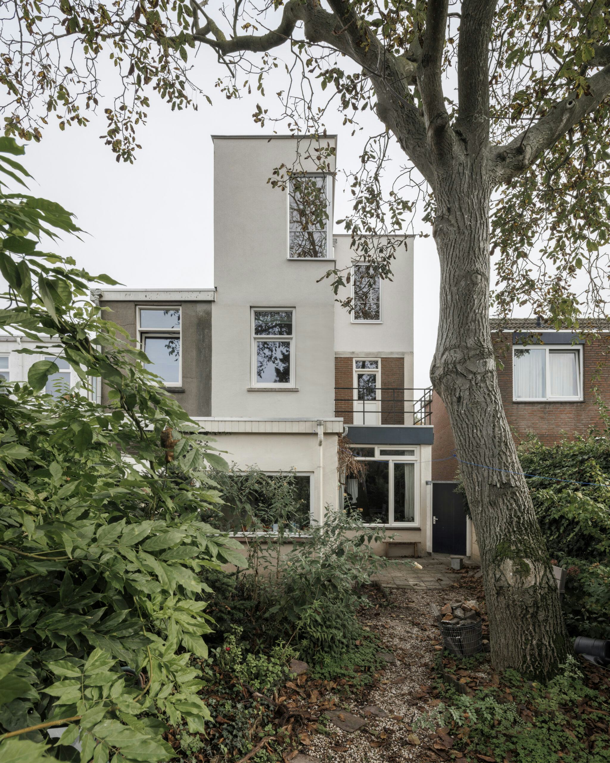 Om de tuin te sparen is het atelier op het dak van de woning geplaatst. Deze werkplek is te bereiken via een nieuwe trap boven de bestaande. Een hoog vertrek met een uitbouw, en in die uitbouw een hoekraam waar de blik kan ontsnappen.