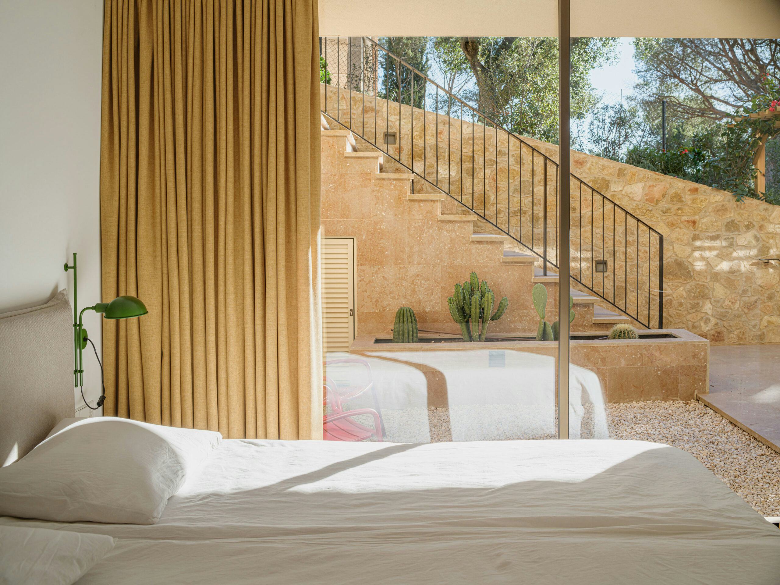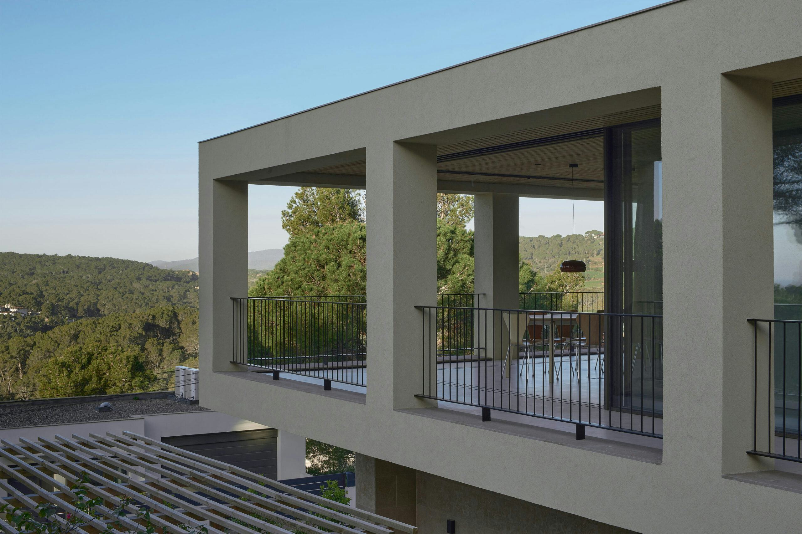 De villa staat als een stevige monoliet in een heuvelachtig landschap. De natuurlijke kleuren en materialen zorgen voor een optimale integratie in het Spaanse landschap. De basis wordt gevormd door een zandkleurige natuursteen uit een groeve bij Ulldecona, zo’n 300 kilometer zuidelijk aan de Spaanse kust ten opzichte van Tamariu. De terrassen en de gevel van de begane grond worden bekleed met natuursteen, door gelijke behandeling van alle vlakken lijkt het alsof de plint van de villa uit de rotsen gegutst is. De gevel van de uitkragende verdieping wordt geheel afgewerkt met een grof pleisterwerk, in gelijke kleurtoon als de zandkleurige natuursteen. Door verschillende materialen toe te passen ontstaat een subtiele overgang en lijkt de uitkraging nog meer te zweven. De lichte zandkleur wordt gecomplimenteerd door aluminium kozijnen met donker-bronzen tint en elementen van donkerbruin hout.