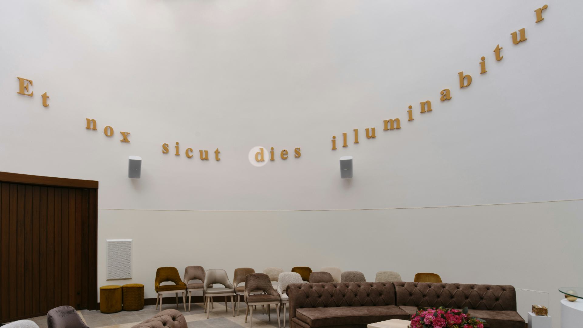Het rouwhof wordt gemarkeerd door een natuursteen arcade met de spreuk Laudato Si (Geprezen zij Gij). In dit hof zijn de 4 elementen verbeeld: hemel, water, vuur en aarde, respectievelijk door glasdaken, spuwer, oven en olijfboom. Op de dag van St. Barbara (4 dec) schijnt de zon door een speciaal geplaatst raam op de tekst Et nox sicut dies illuminabitur (En de nacht zal verlicht worden als de dag). Door het openen van de grote gebogen taatsdeuren staat men na het afscheid bij de oven.