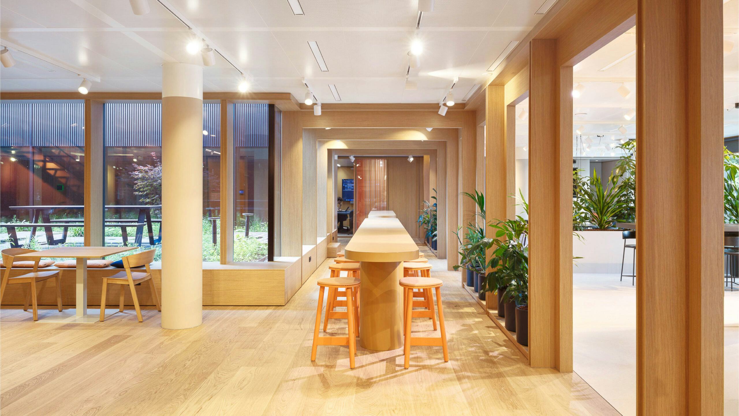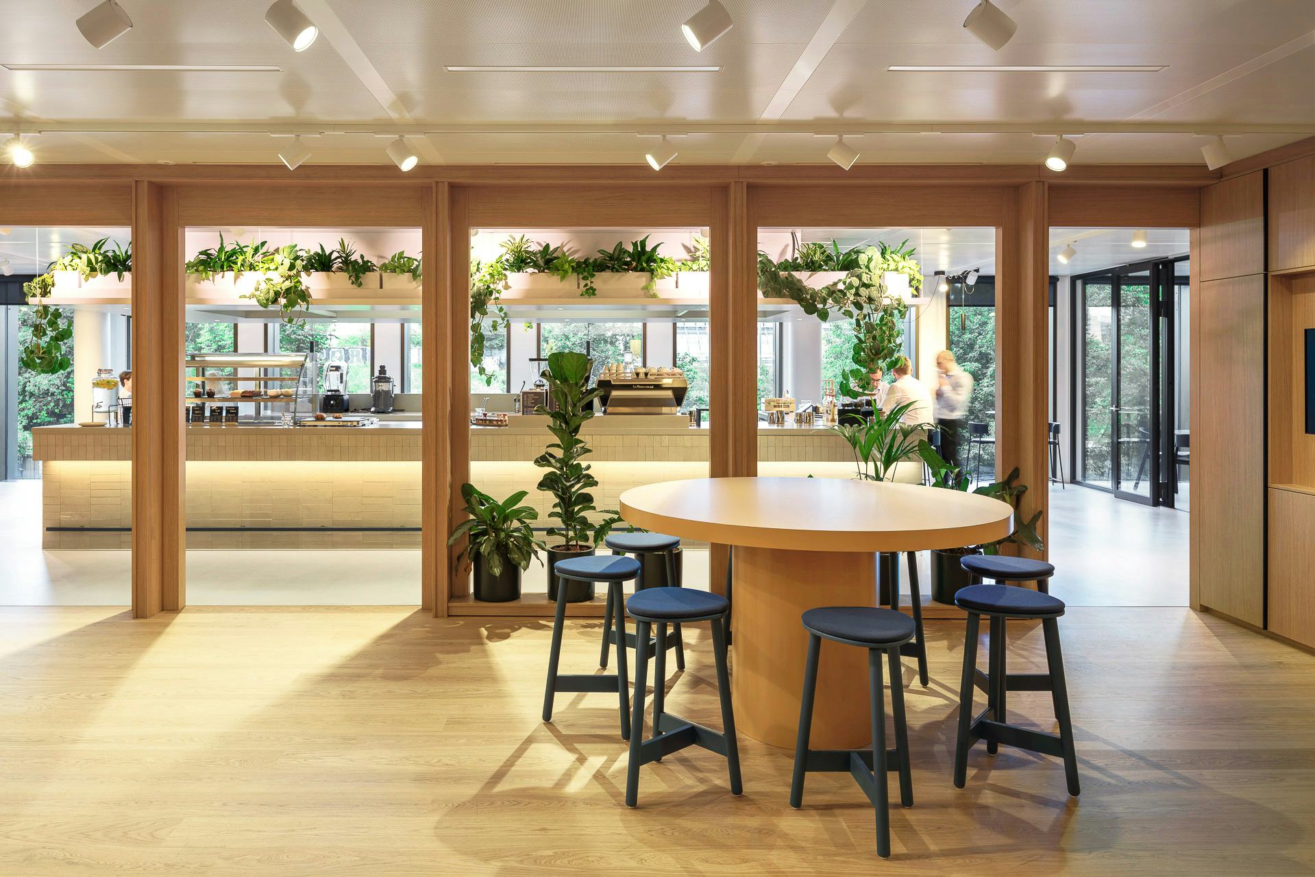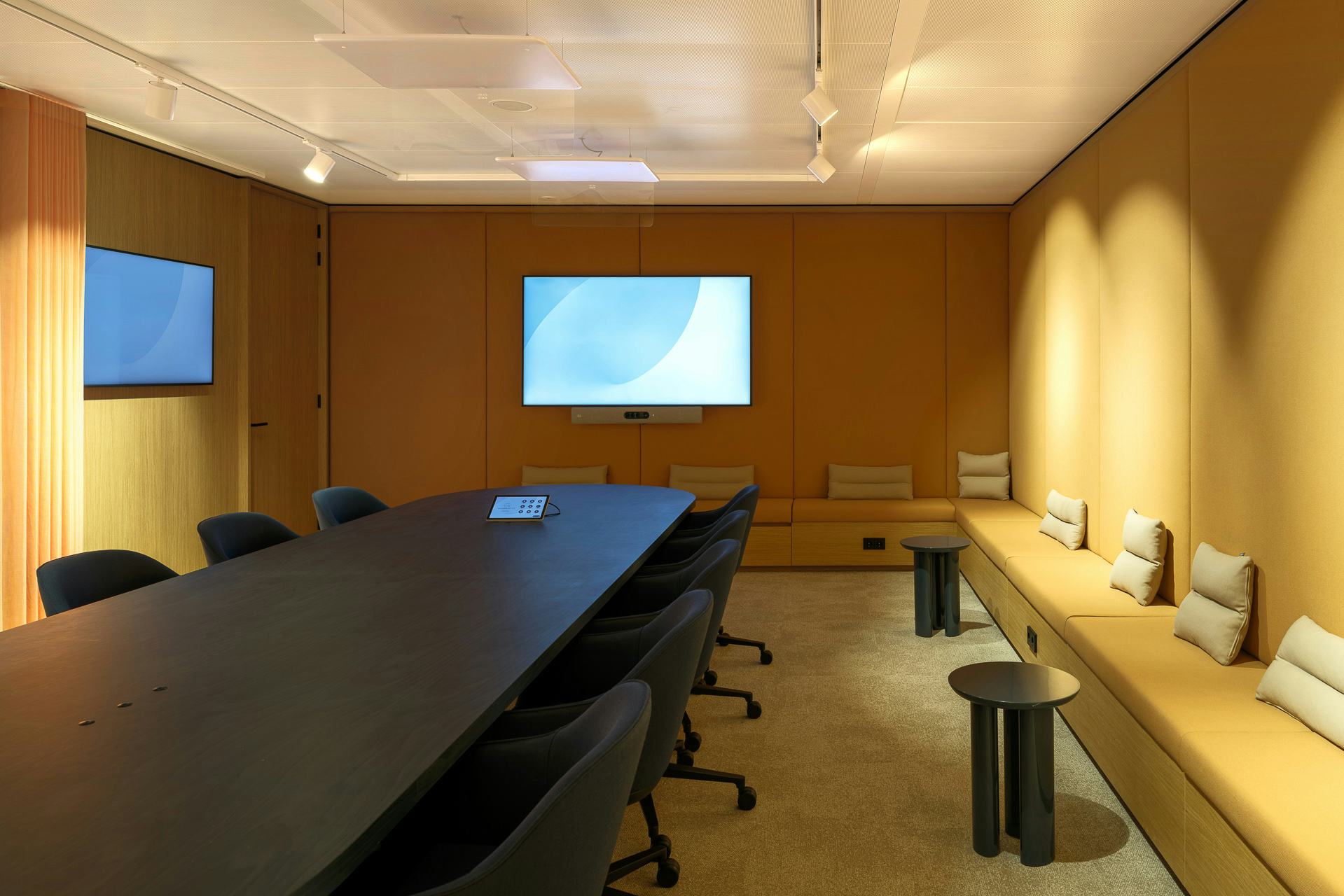 Een ander architectonisch element is herkenbaar aanwezig op iedere verdieping: een gesloten volume, in de kern van de verdiepingsvloer geplaatst. Deze volumes staan ruimtelijk en in materialisatie duidelijk in contrast tot de omliggende open en transparante werkomgeving. Waar neutrale en witte tinten de werkvloer tekenen, is het gesloten volume voorzien van warme eiken wandbekleding, kleurrijke akoestische fotoprints en een lichtgrijze vloerafwerking. Ruimtes om in alle rust en stilte te kunnen overleggen – voor een online meeting of een gesprek met collega’s of klanten – en informelere zitjes om elkaar kort te spreken zijn opgenomen in dit volume.