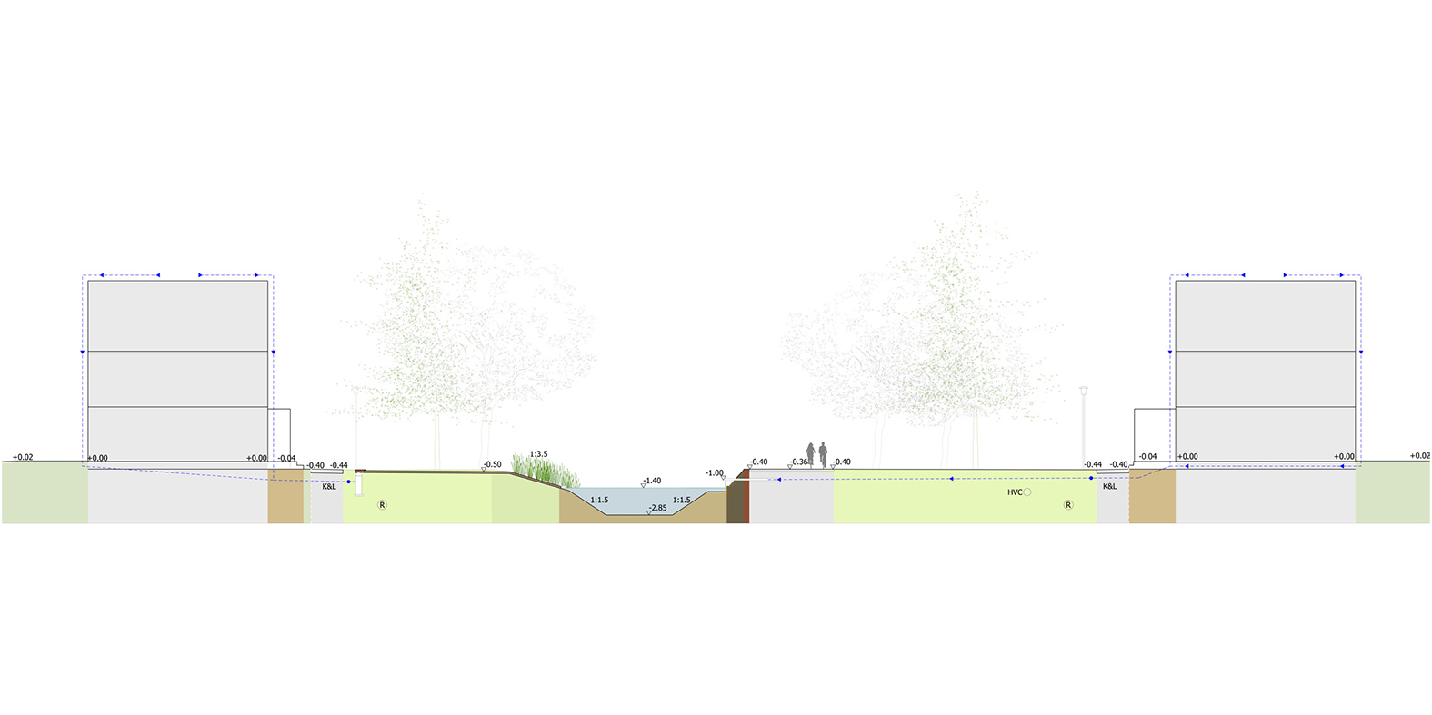 De keerconstructie ter hoogte van de waterpartij bij het centrale plein is gemaakt met geogrid. De geogridconstructie wordt bekleed met gestapelde Bioblocks en afgedekt met een Cortenstalen deksloof. Begroeid met varens zijn de Bioblocks nog goed zichtbaar en verhogen met dit natuurlijke beeld het contrast met de trappartijen aan het water.