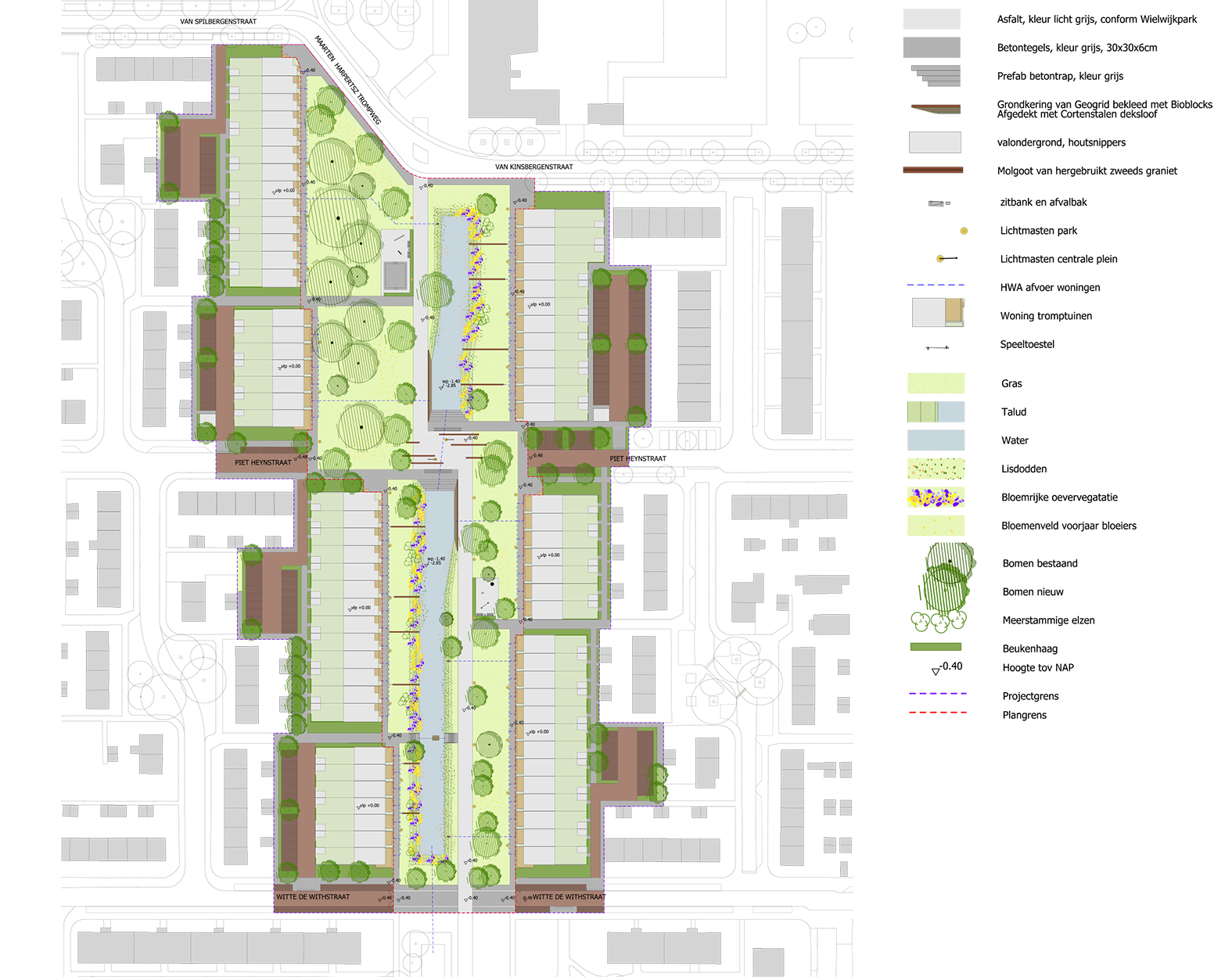 Op basis van het kralensnoermodel van het Wielwijkpark ontstaat langs het fietspad een reeks van bijzondere plekken. Het plein ter hoogte van de Piet Heynstraat is de centrale ontmoetingsplek met grote zitbanken. Via trappartijen aan de noord- en zuidkant is het waterniveau bereik- en beleefbaar.