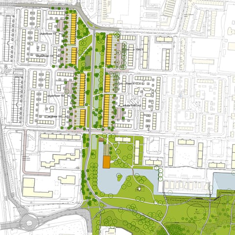 Om recht te doen aan de maat en schaal van de openbare ruimte zijn de woningen voorzien van hoge, drielaagse gevels in baksteen met een stevige ritmiek op blokniveau en pregnante koppen. De metselwerkpenanten en reliëf in het metselwerk van gevels en tuinmuren verrijken het beeld. De nieuwe woningen voegen zich naadloos in het stempelpatroon van de bestaande buurten en geven tegelijk op eigentijdse wijze vorm aan de nieuwe groene ruggengraat van de wijk.