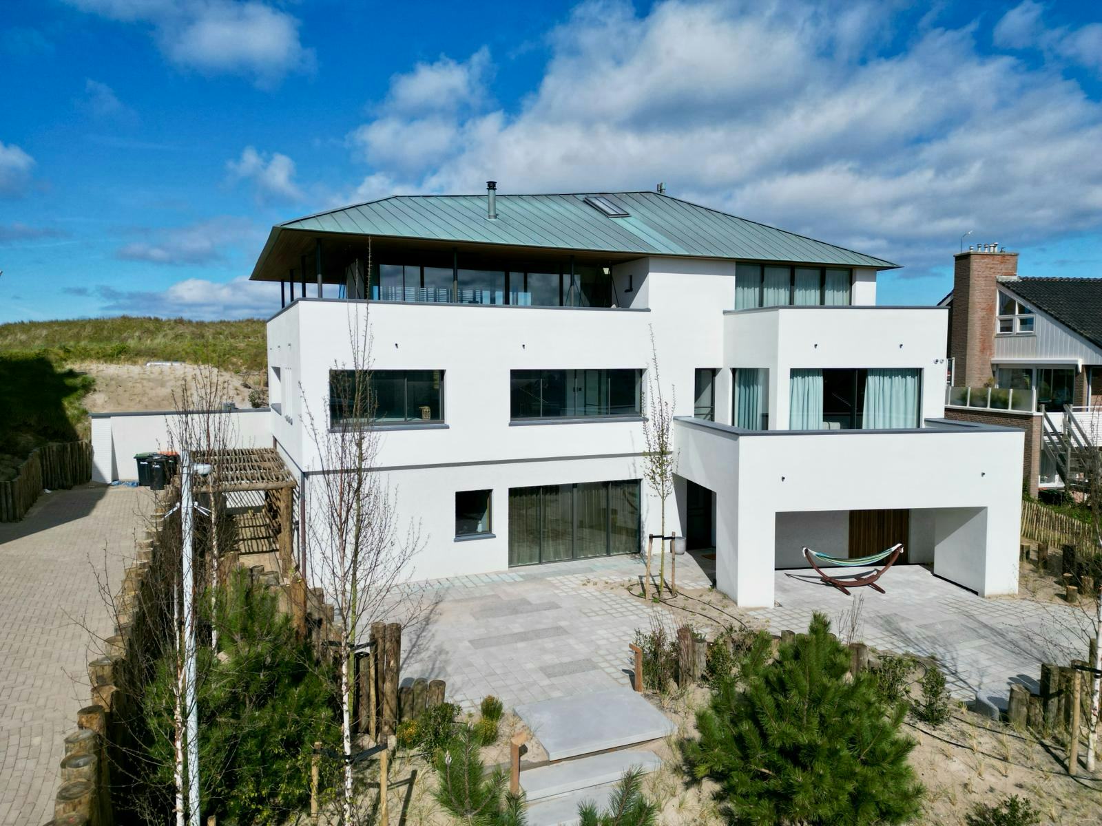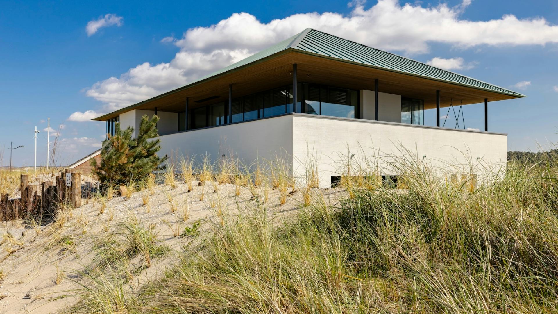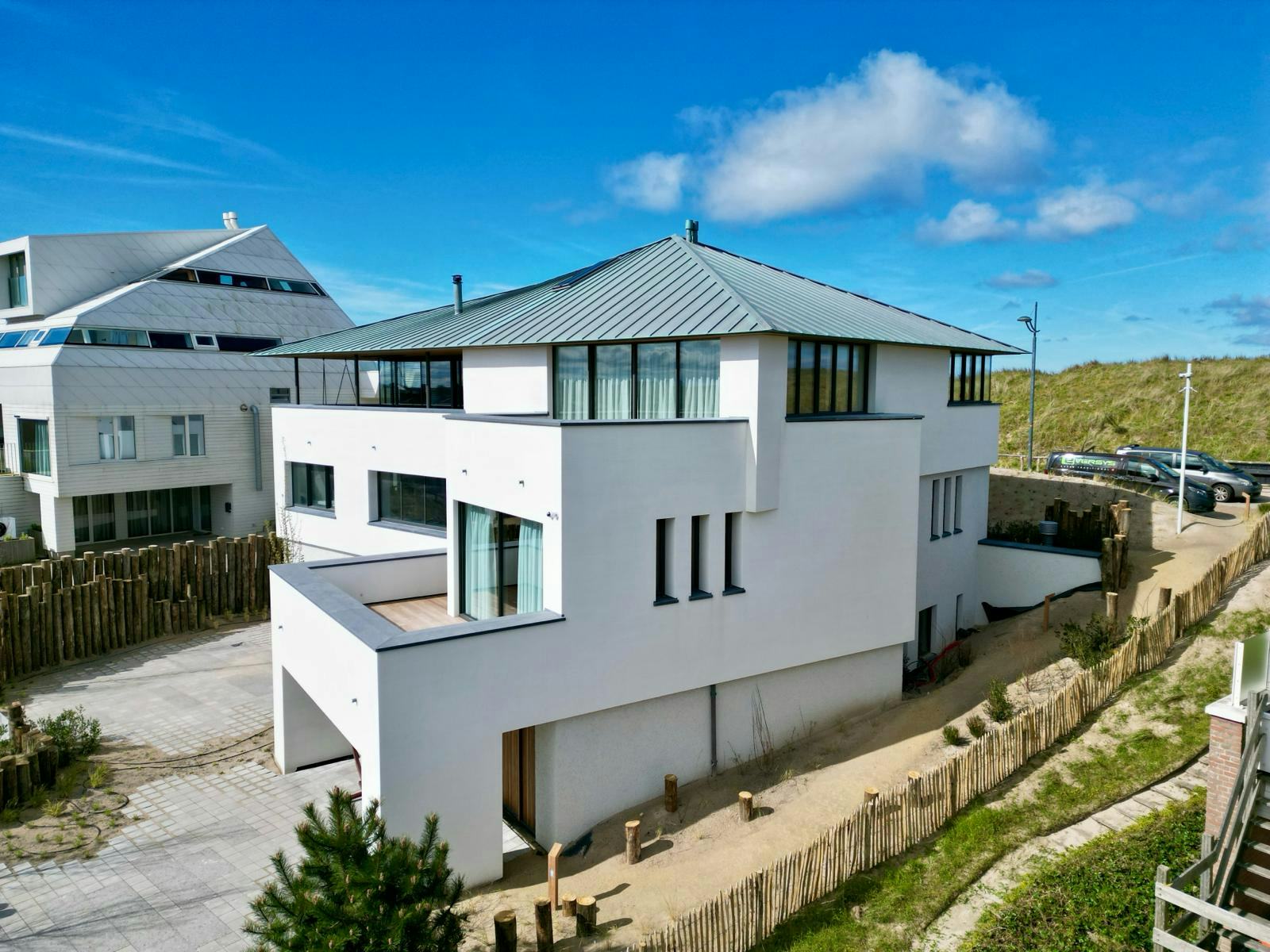 De gevels, bestaand en nieuw zijn gestuukt. Om een geleding aan te brengen in de gevels is er gekozen om het nieuwe deel te laten verspringen t.o.v. het bestaande. Beide delen zijn verschillend gestuukt en gekleurd. De plint is afgewerkt met grof stucwerk, als het natte zand op het strand. De nieuwbouw heeft een fijne bezemstructuur in het stucwerk en is lichter en refereert aan de fijne structuur van het zand van de duinen.