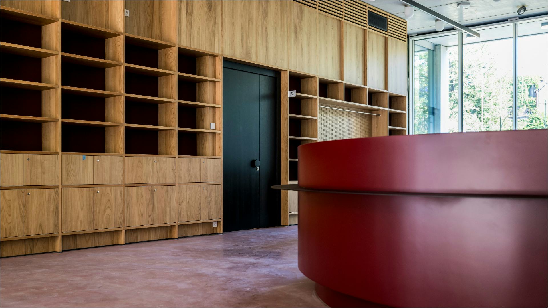 Binnenin zijn enorme diagonale wenteltrappen een symbolisch opstapje naar de beweging en dynamiek in de kunstenaar zijn werk. Ze trekken meteen de aandacht en laten de bezoeker letterlijk en figuurlijk opkijken. Het hedendaagse gebouw is nadrukkelijk aanwezig en toch discreet door de zijdelingse ligging ten opzichte van de kunstenaarswoning. Een doordachte aanpak, want zo blijft niet enkel het zicht op de portiek en de tuin, maar ook hun verbindende functie bewaard.