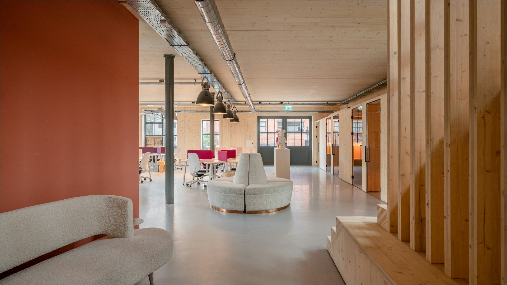 Om de nieuwe kantoorvloer en het dak te kunnen dragen, werd in drie dagen tijd een nieuwe houten constructie inclusief isolatie achter de karakteristieke metselwerkmuren geplaatst. Deze constructie en die van de nieuwe opbouw is uitgevoerd in kruislaaghout (CLT). Daarbij werd gebruik gemaakt van zogenoemde spiders (spinvormige stalen hulpconstructies) in combinatie met houten kolommen. De houten vloerdelen zijn met elkaar verbonden en vormen samen als het ware één grote plaat die aan de boven de kolommen geplaatste spiders hangt. Daardoor was het mogelijk om zonder balken en liggers een grote overspanning te maken wat resulteert in extra ruimtelijkheid en materiaalbesparing.