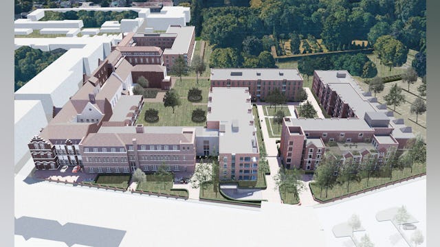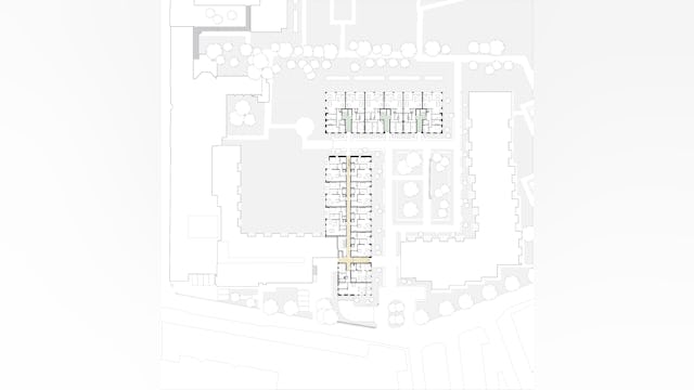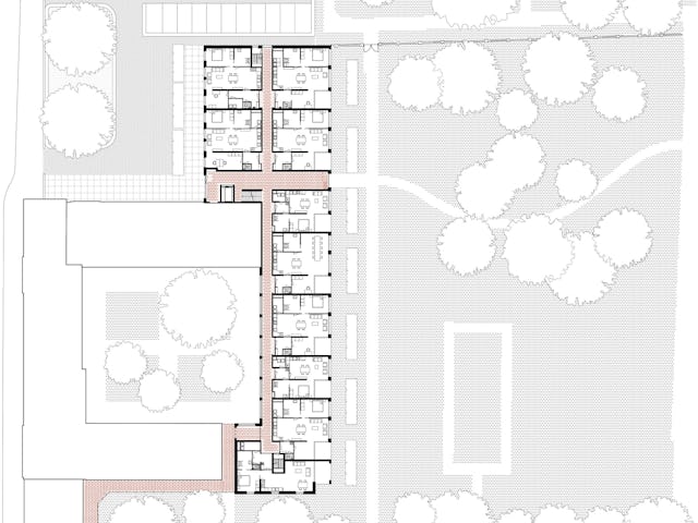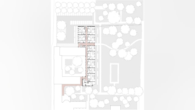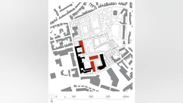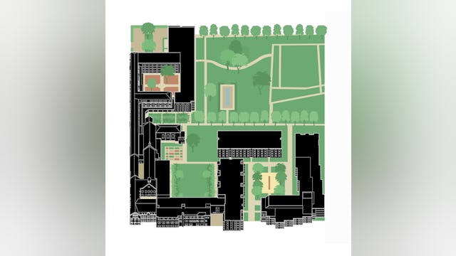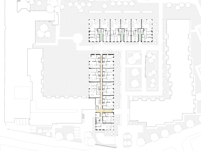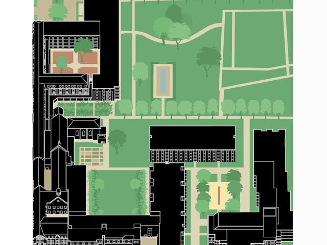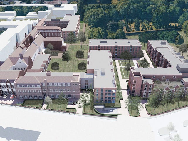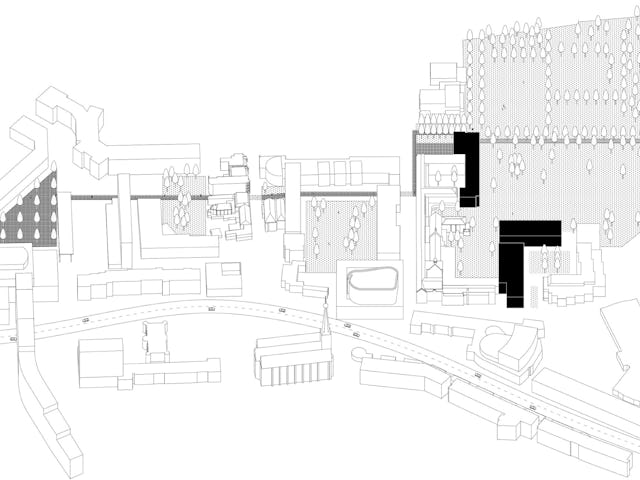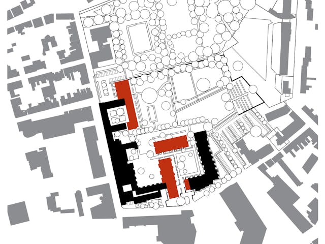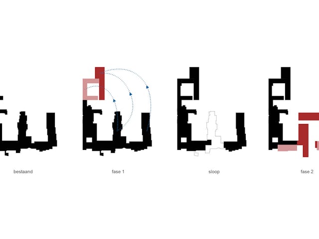 De nieuwe bouwvolumes nemen de hoogte en korrelgrootte van het bestaande complex over. De nieuwe stedenbouwkundige figuur die de nieuwe bouwvolumes samen met de bestaande bouwdelen maakt, geeft de heldere vorm van de hoven en tuinen voorrang boven die van de losse gebouwen. De gebouwen zijn dan ook niet zo zeer als solitaire bouwdelen vormgegeven, maar eerder als wanden die duidelijk herkenbare hoven en tuinkamers definiëren.
