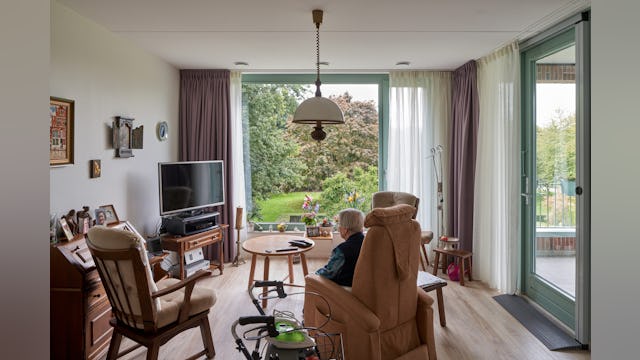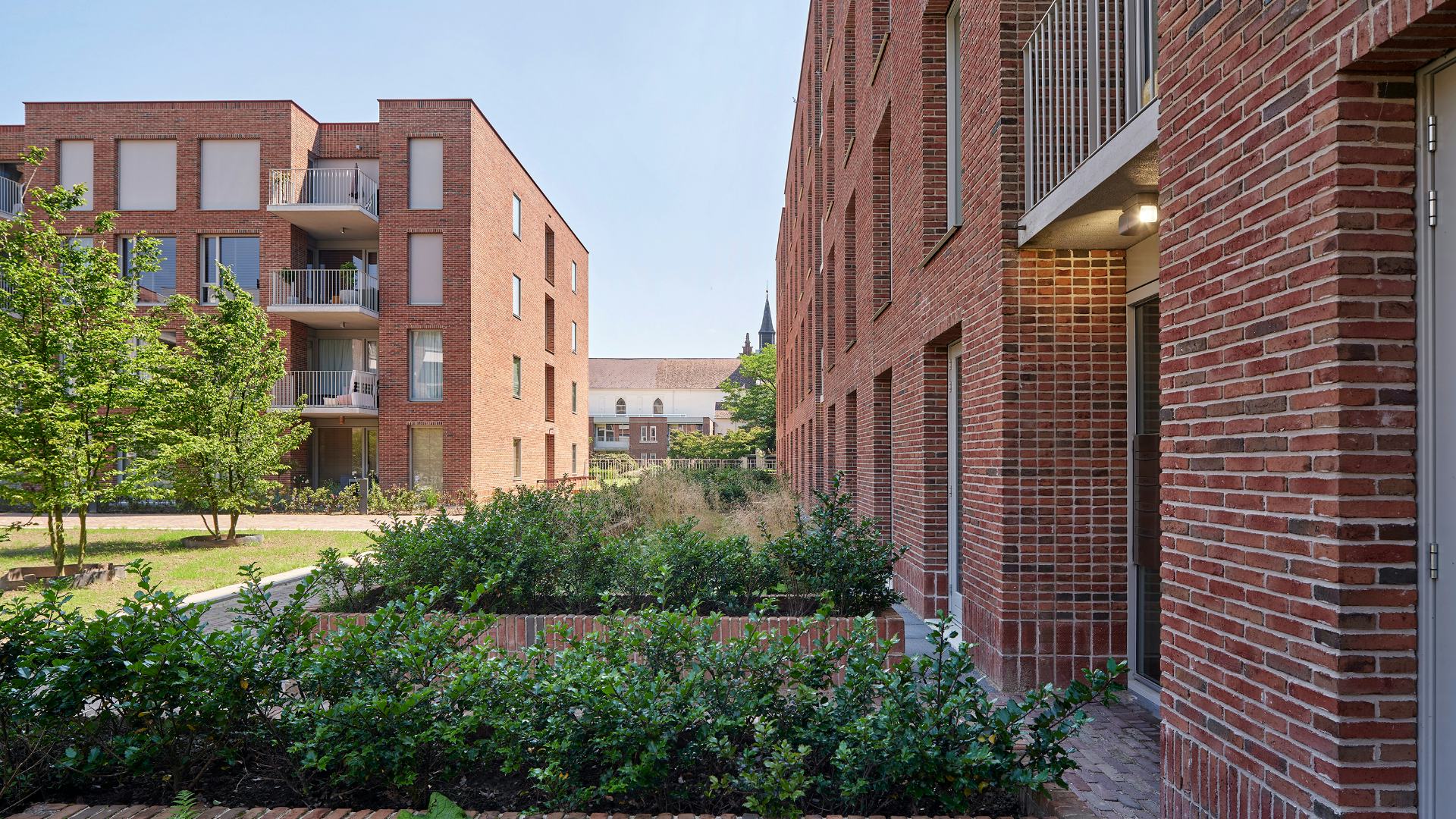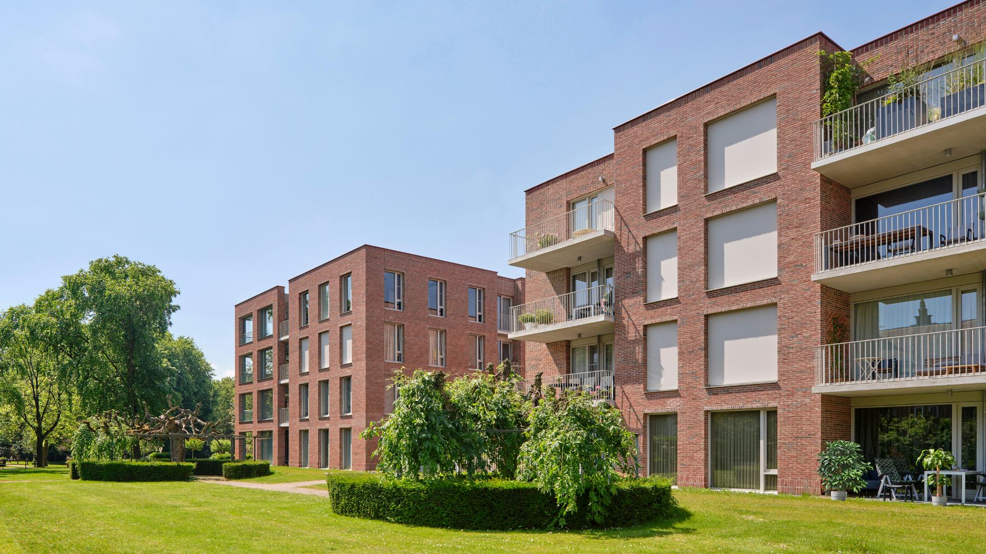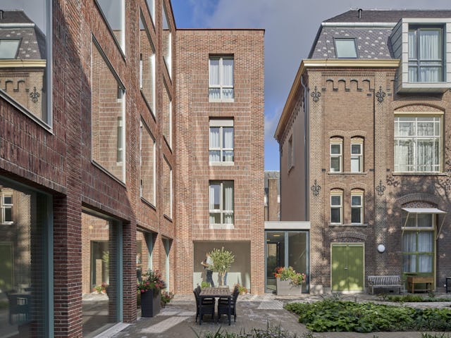 De op zuid georiënteerde tuingevel is vormgegeven als een bewoonde kloostermuur. Zij kennen een volledig beglaasde tweede gevel die verdiept ligt achter het metselwerk. Hierdoor wordt er volop genoten van de kloostertuin zonder dat deze wordt toegeëigend. Het wonen doet hier als het ware een stapje terug uit respect voor de meest dierbare plek van de zusters: de kloostertuin.