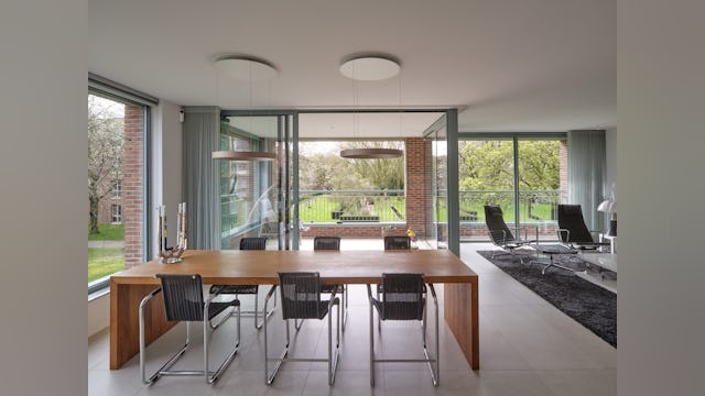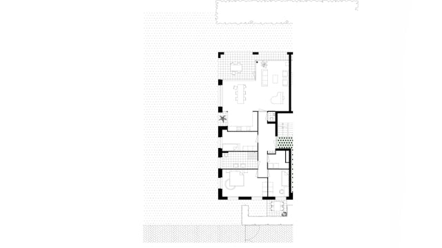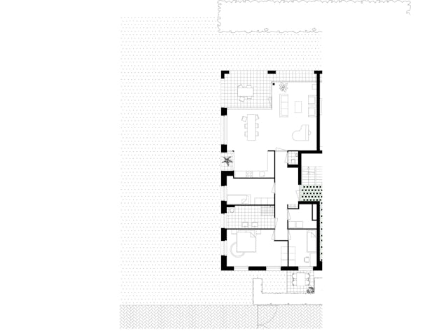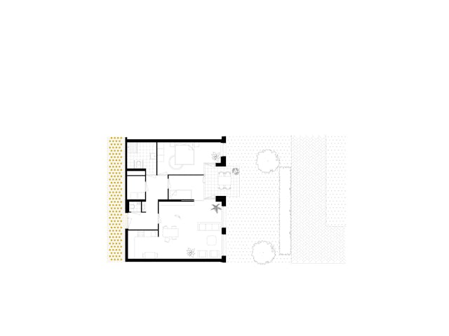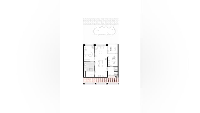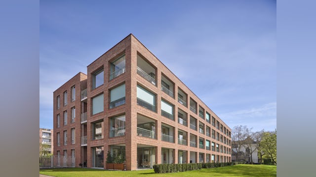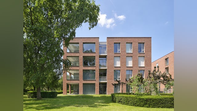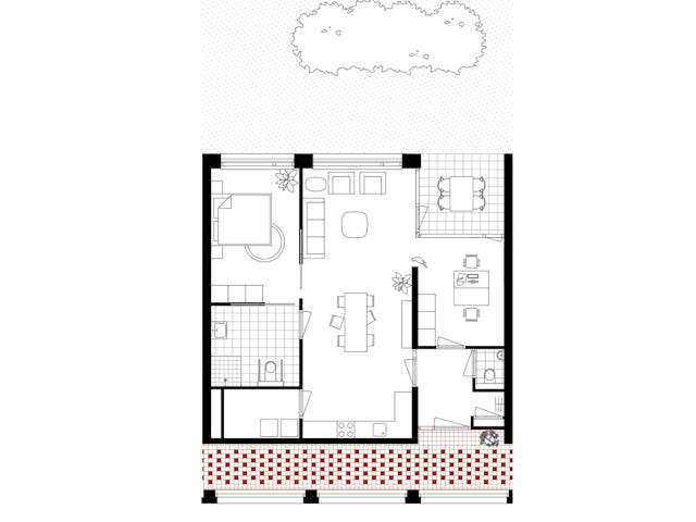 Het oost-west georiënteerde volume wordt ontsloten via een drietal portieken met daaraan twee royale appartementen per vloer, één met standaard vier kamers en één met standaard drie kamers. De voor woningbouw zeer forse beukmaat van 8,6m die in één keer wordt overspannen geeft de bewoners veel indelingsvrijheid. Dit heeft er in geresulteerd dat alle 24 appartementen een unieke plattegrond hebben in dit woongebouw.