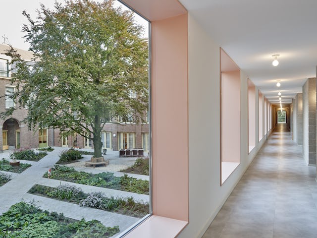 De tuingevel van fase 2 gaat een sterke formele relatie aan met de tuingevel van fase 1. Tesamen begrenzen zij de kloostertuin en waarborgen haar beslotenheid. Fase 1 werd in 2020 opgeleverd en bevat 40 zorgtoegankelijke appartementen voor de zusters. Dit langgerekte gebouw is verbonden met de stad, het monumentale moederhuis, de kapel, de kloostertuin én de naastgelegen zorgvoorziening. Zij creëert twee nieuwe hoven: een gesloten hof tussen het appartementengebouw en de woonzorgvoorziening en een open hof richting de stad. Het gesloten hof dient als veilige buitenruimte voor de zusters met een psychogeriatrische indicatie in de woonzorgvoorziening. Het open hof richting stad functioneert als entreegebied voor de woonzorgvoorziening en het appartementengebouw.