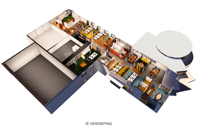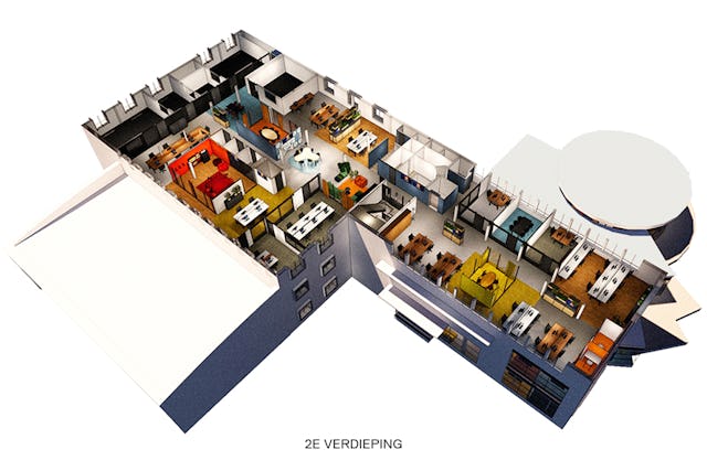 Aan de hand van verschillende thema’s is dit vertaald naar een basis met verschillende vloerafwerkingen en plafondvelden, daarbinnen bevinden zich als kleurige ‘landmarks’: de vergaderruimten en concentratiecellen. Tussen deze verschillende plekken lopen informele routes en afwisselende paadjes.