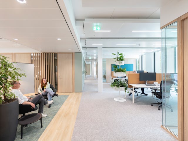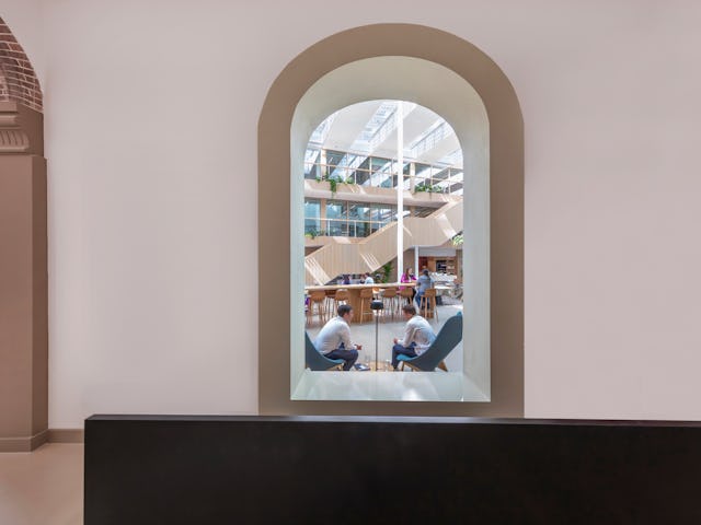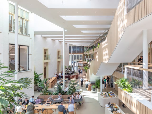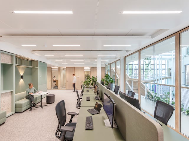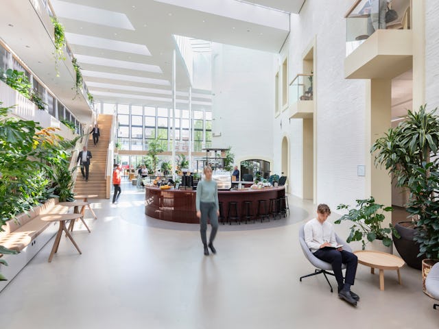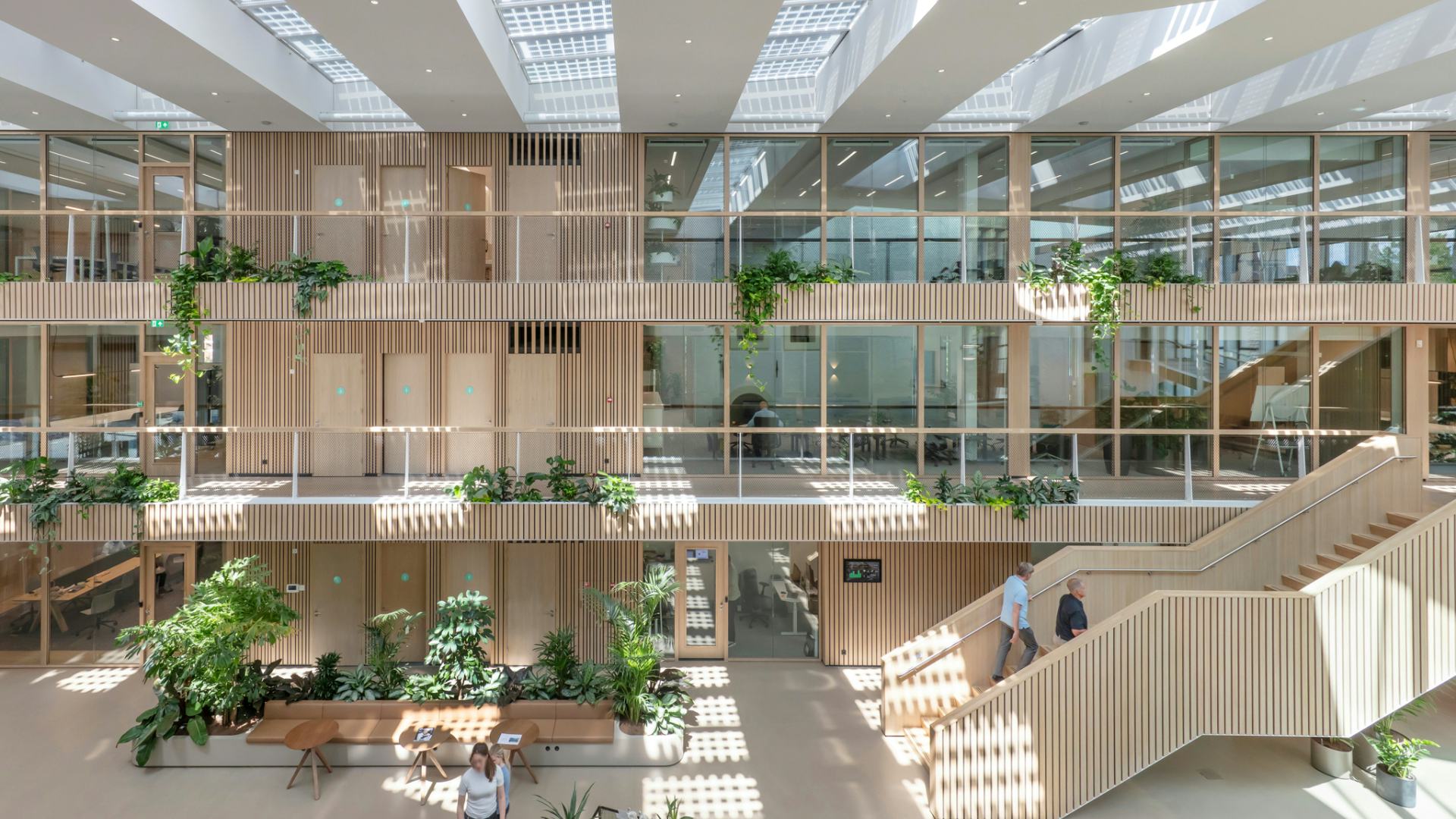 Het atrium heeft een laagdrempelige grand-café-achtige sfeer. Door gebruik te maken van ronde vormen, warme en natuurlijke materialen vinden de elementen aansluiting bij en versterken ze het casco-ontwerp. Als duurzaam aspect is het meubilair zoveel als mogelijk hergebruikt en geoogst. Er zijn emissie-vrije materialen gebruikt volgens de Well Platinum-norm en de verwerking van het maatwerk is modulair en demontabel. Op de werkvloeren heerst een huiskamerachtige sfeer, waarbij elke verdieping een unieke kleursamenstelling heeft, wat de oriëntatie voor de gebruiker overzichtelijk maakt.