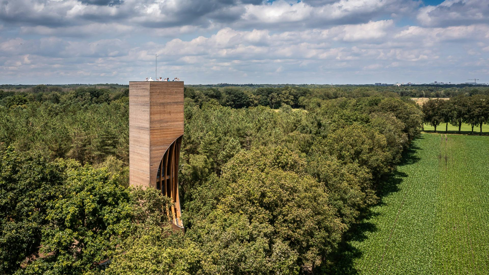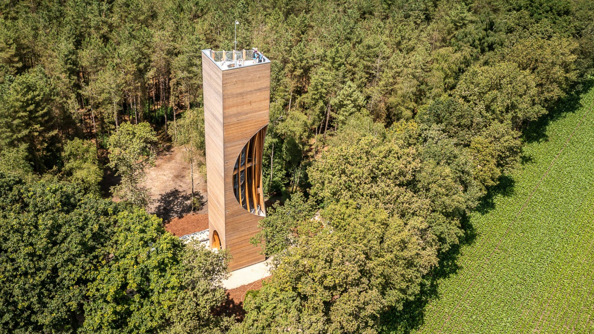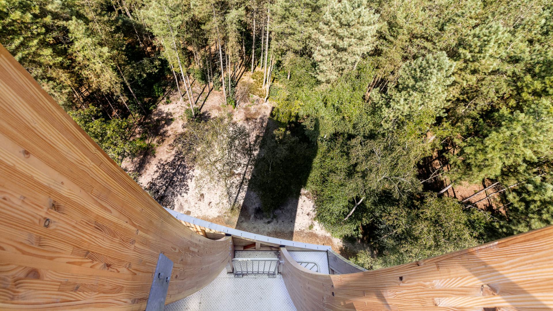Naast de uitkijkfunctie vanaf het dak, biedt de toren ook onderweg naar boven al verrassende perspectieven; inkepingen, op verschillende hoogtes en aan verschillende zijden van het ontwerp, geven een doorkijkje tijdens de klim. Zowel tussen de bomen door als over het bos heen geeft de door zijn opvallende vorm van ver herkenbare toren een bijzonder uitzicht.