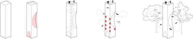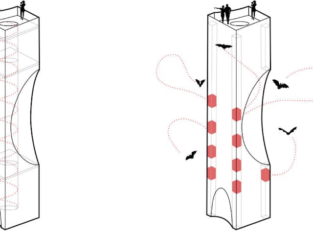 De gevel van het ontwerp bestaat uit gelamineerde Lariks kolommen, bekleed met thermisch verduurzaamd grenen. De ruwheid van het materiaal geeft de vleermuizen grip om te kunnen aanlanden en wegkruipen.