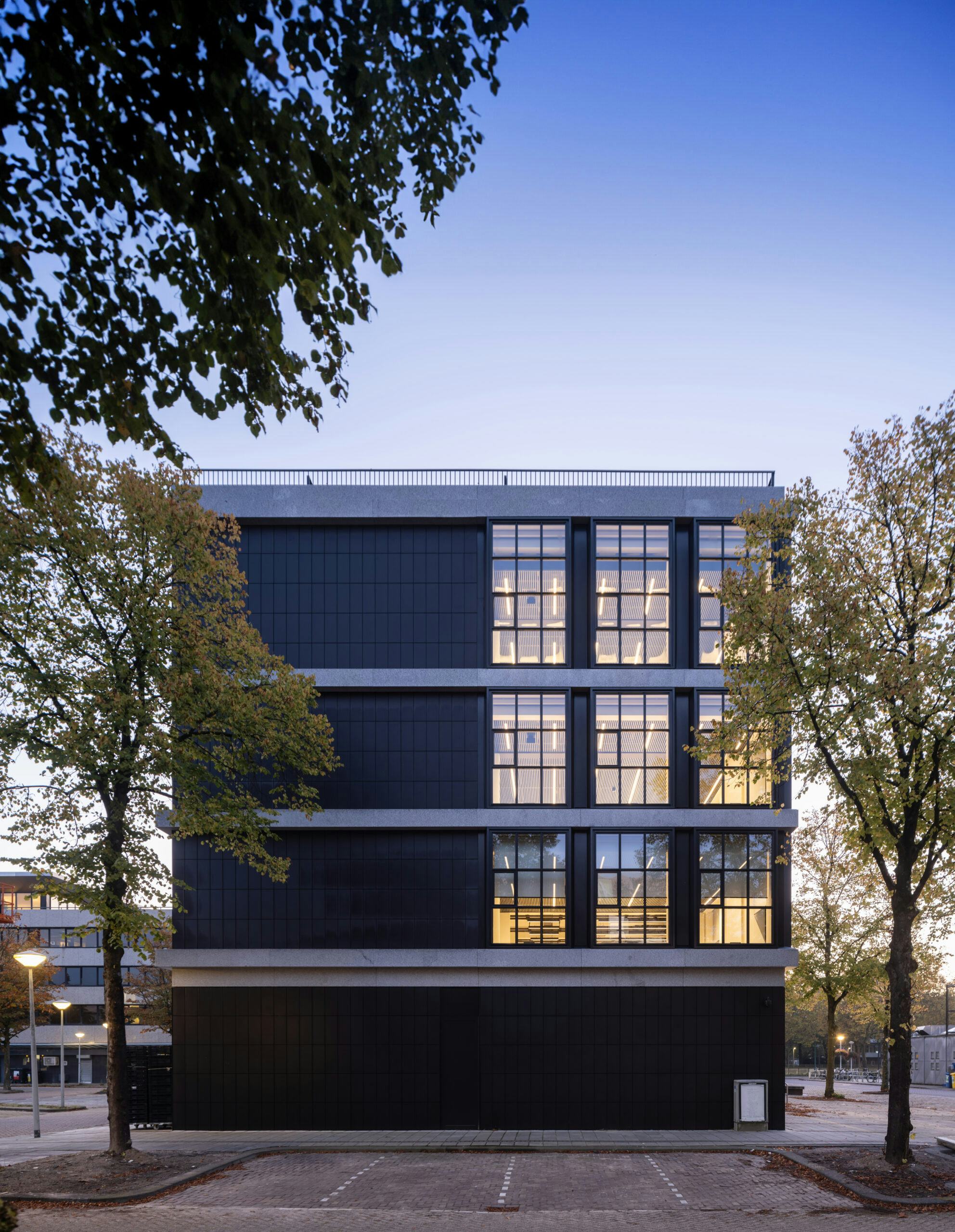 Het oorspronkelijke betonnen gebouw is aangepast met een lichtere en modernere uitstraling. Rechthoekige glazen erkers met zwarte aluminium kaders en natuursteen geven het gebouw een open karakter. Grote glaspanelen op de begane grond en een vernieuwde entree zorgen voor een uitnodigende binnenkomst. Antracietkleurige keramische tegels zorgen voor een visuele verbinding met de omliggende gebouwen. Het gebouw is uitgebreid met een optopping en een dakterras, dat de open uitstraling versterkt. Het nieuwe volume is teruggelegd ten opzichte van de hoofdmassa.