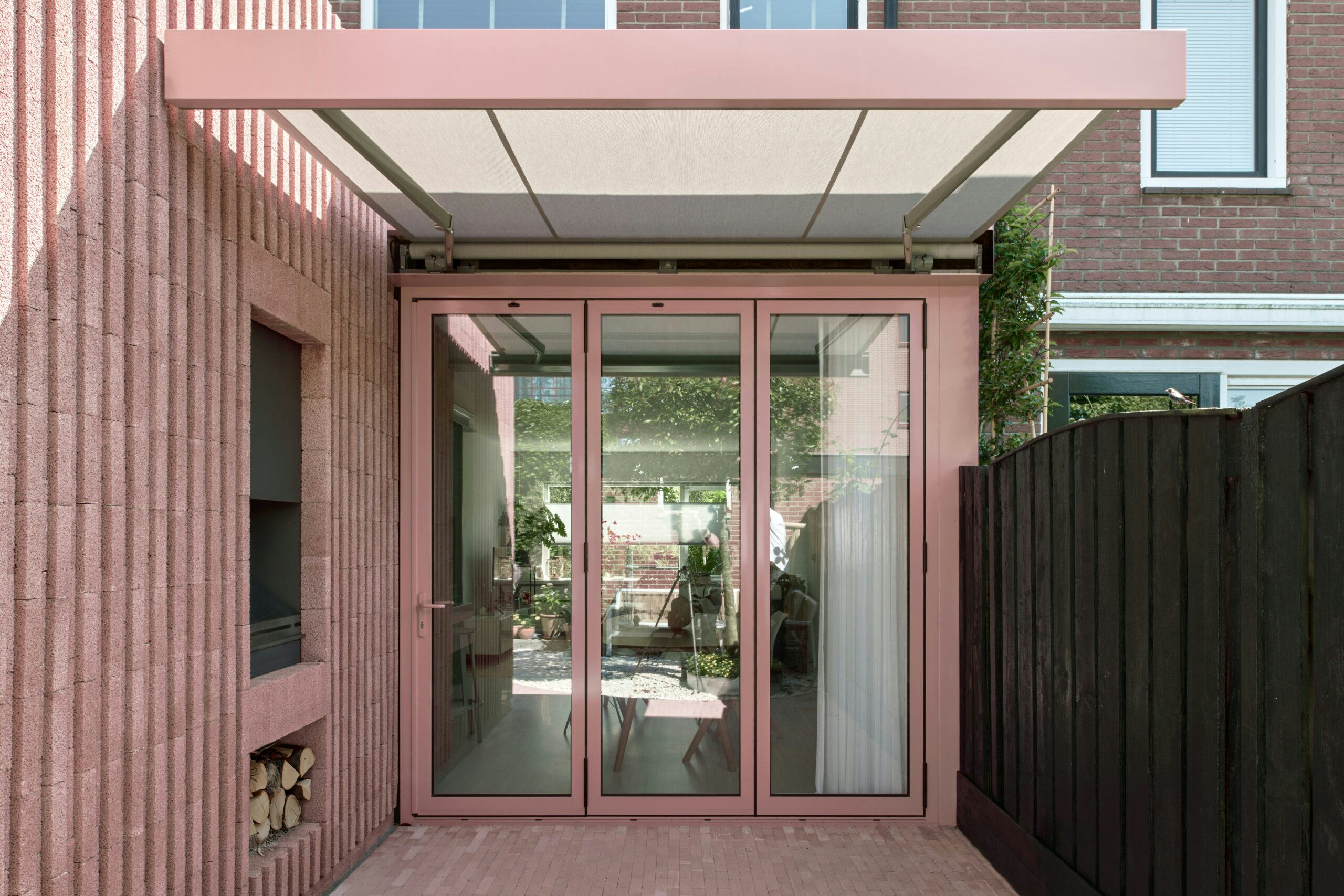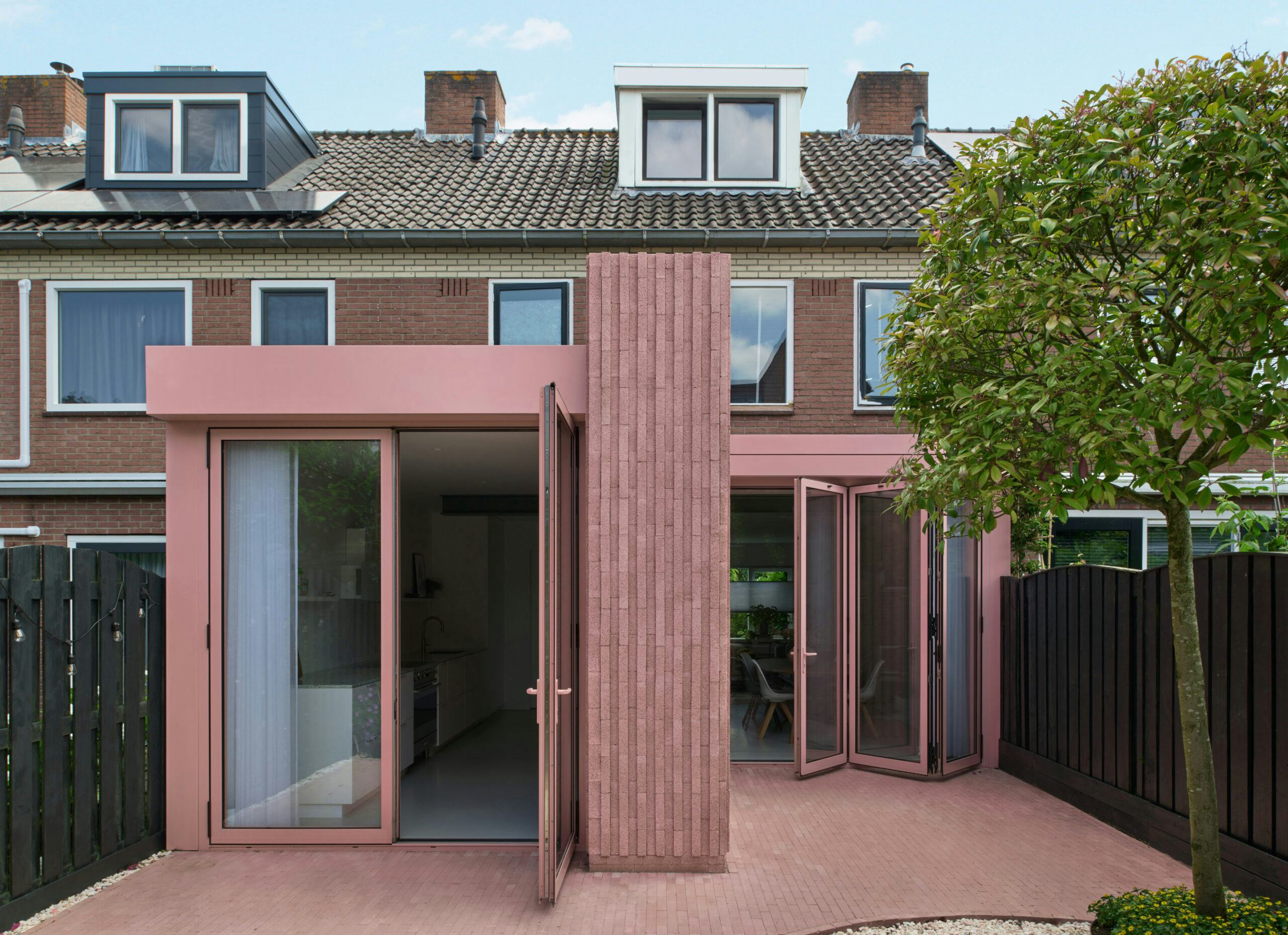 Het terras, afgewerkt met bijpassende roze betonstenen, verbindt huis en tuin, terwijl aluminium kozijnen in dezelfde tint voor continuïteit zorgen. Grote harmonicadeuren vervagen de grens tussen binnen en buiten en versterken de verbinding met de tuin.