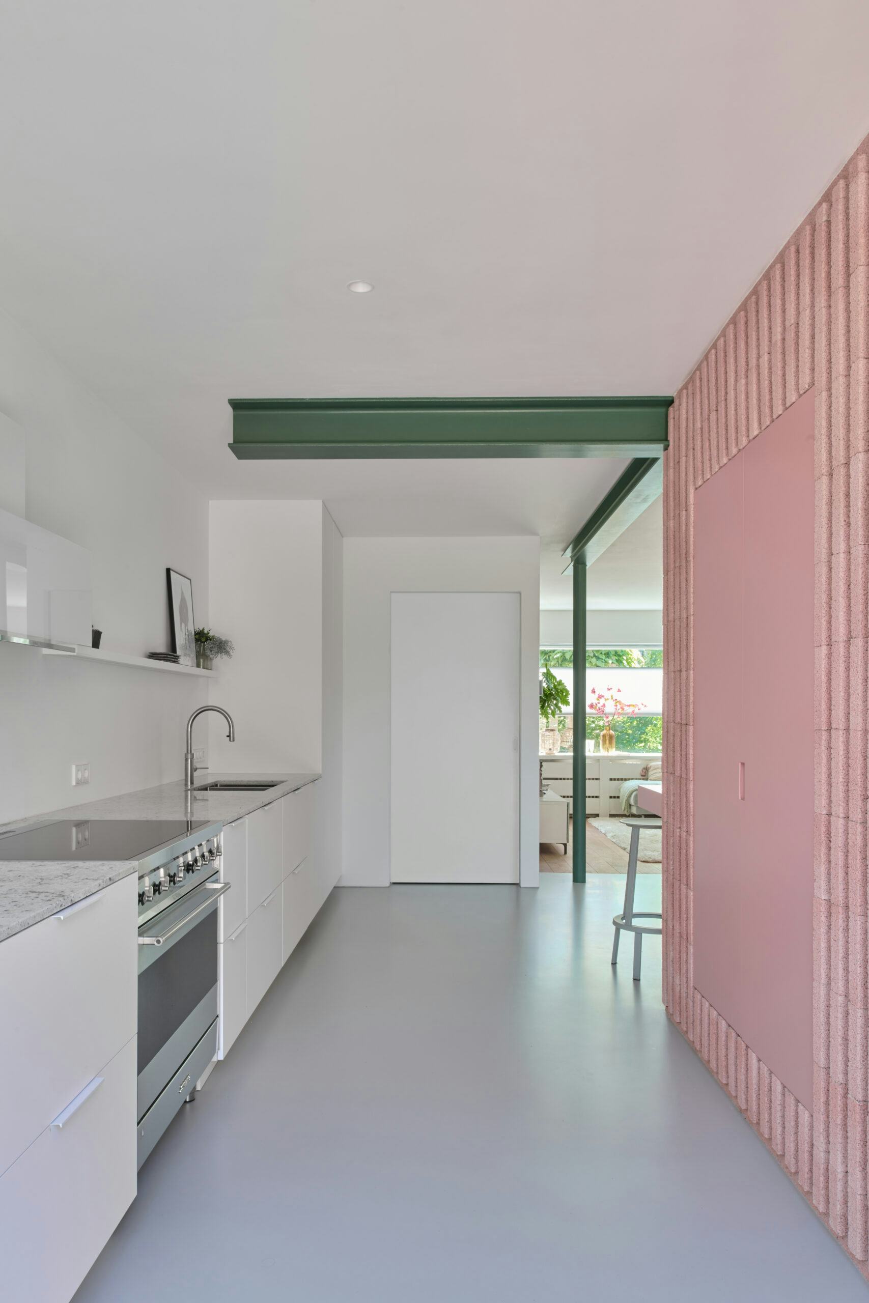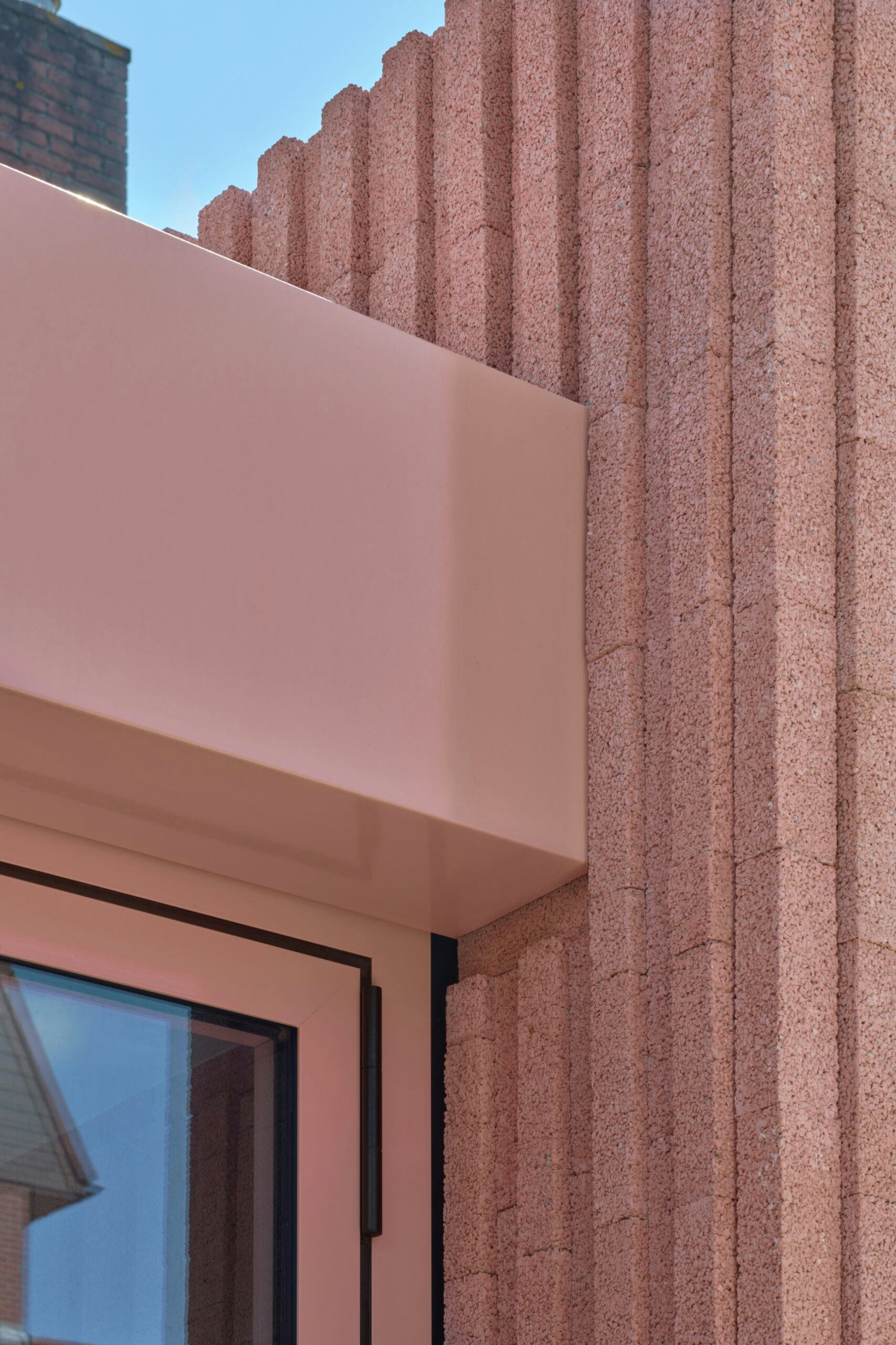 Centraal in de uitbreiding staat een opvallend roze betonnen metselwerkblok, dat als esthetisch en multifunctioneel element dient. Dit blok bevat kasten en een buitenhaard en is opgebouwd uit verticaal geplaatste betonnen stenen, wat zorgt voor een moderne, samenhangende uitstraling. De uitbreiding vergroot de keuken en eetruimte, en creëert nieuwe buitenruimtes die verbonden zijn met de tuin.