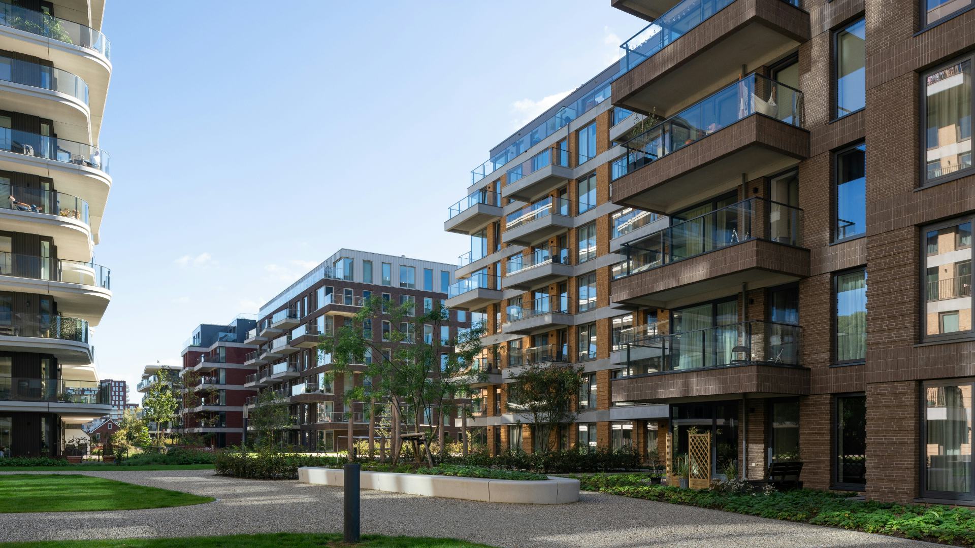 Het hoogteverschil met het straatniveau is zorgvuldig vormgegeven, met groene taluds, trappen en rolstoeltoegankelijke hellingen. De hoofdingangen van de woongebouwen bevinden zich ook in het binnengebied, wat samen met de ruime privéterrassen en balkons bijdraagt aan de levendigheid van deze groene ruimte. De Urban Villa’s beschikken over doorlopende balkons die de architectonische uitstraling van het geheel versterken.
