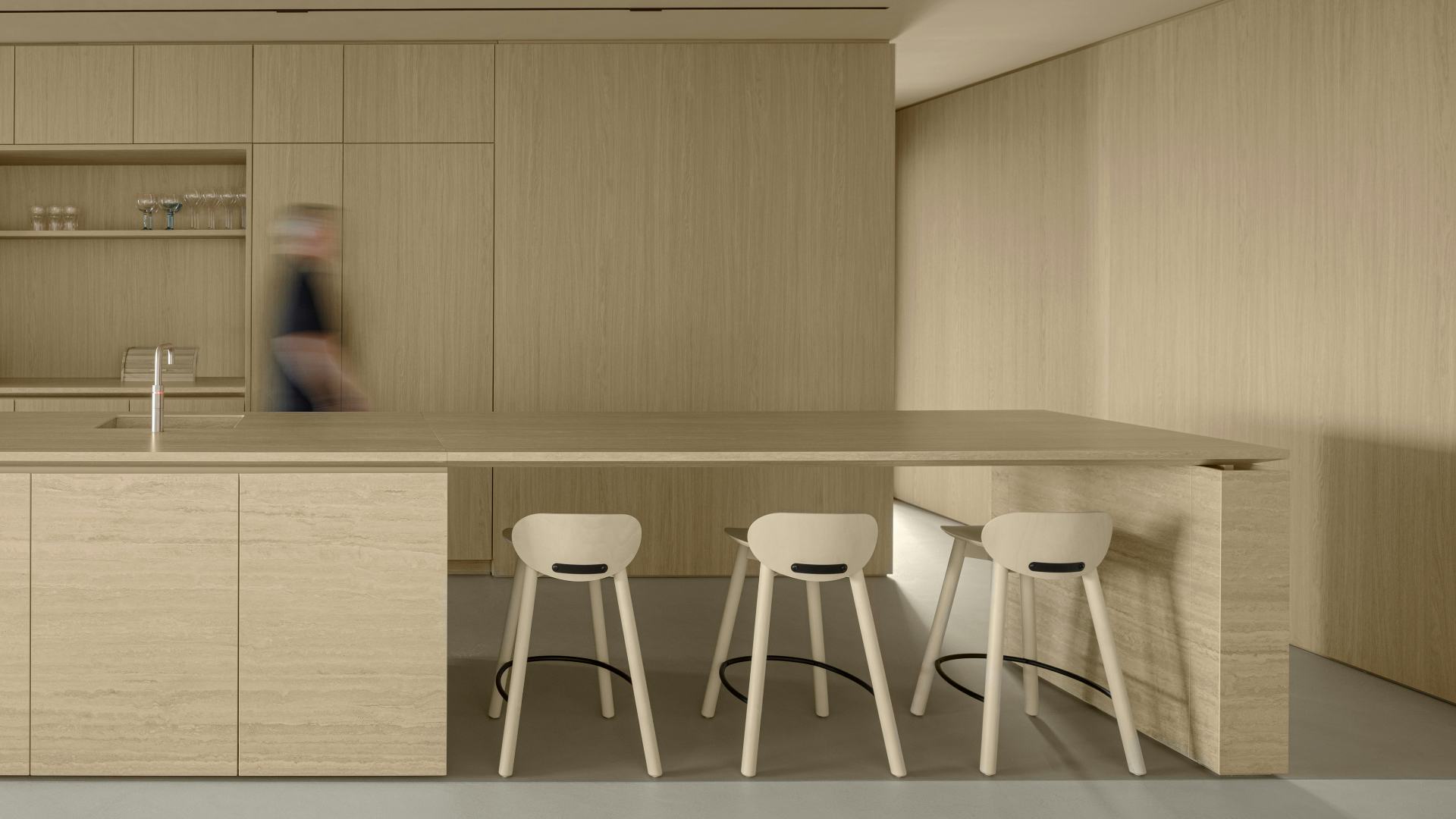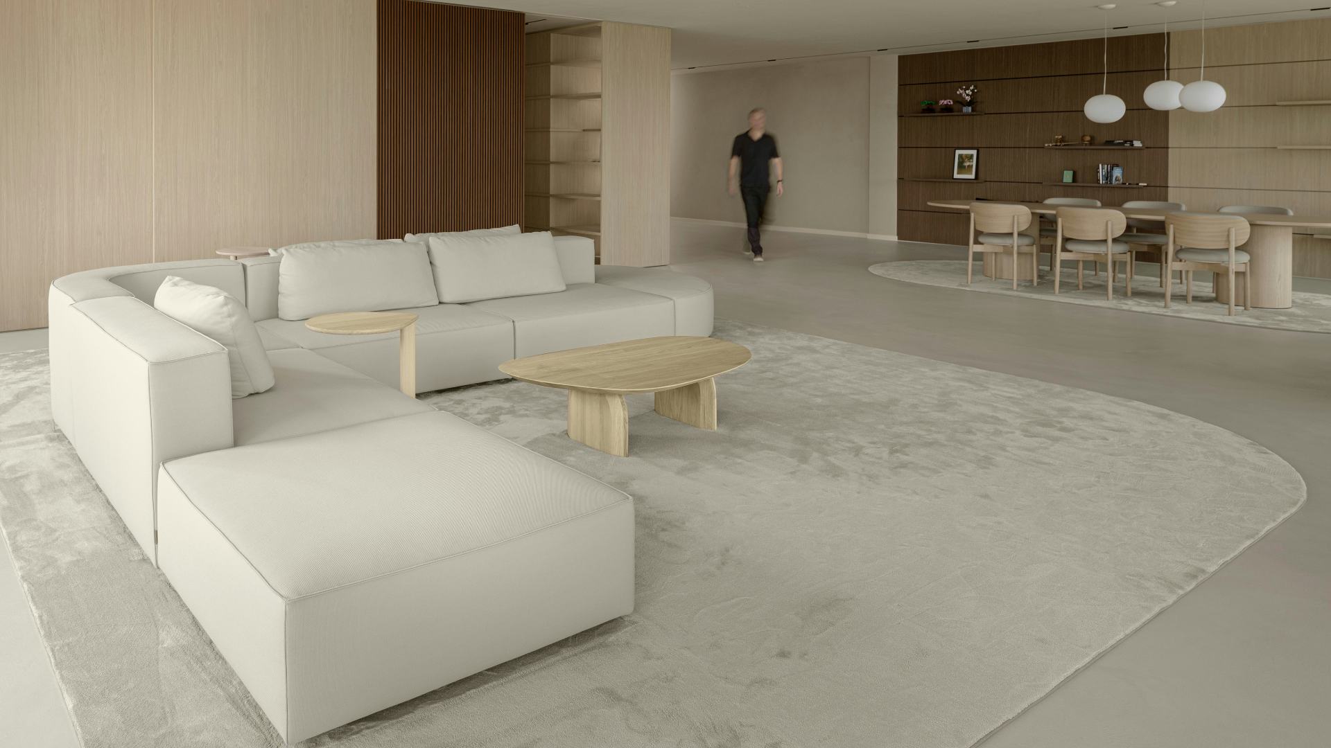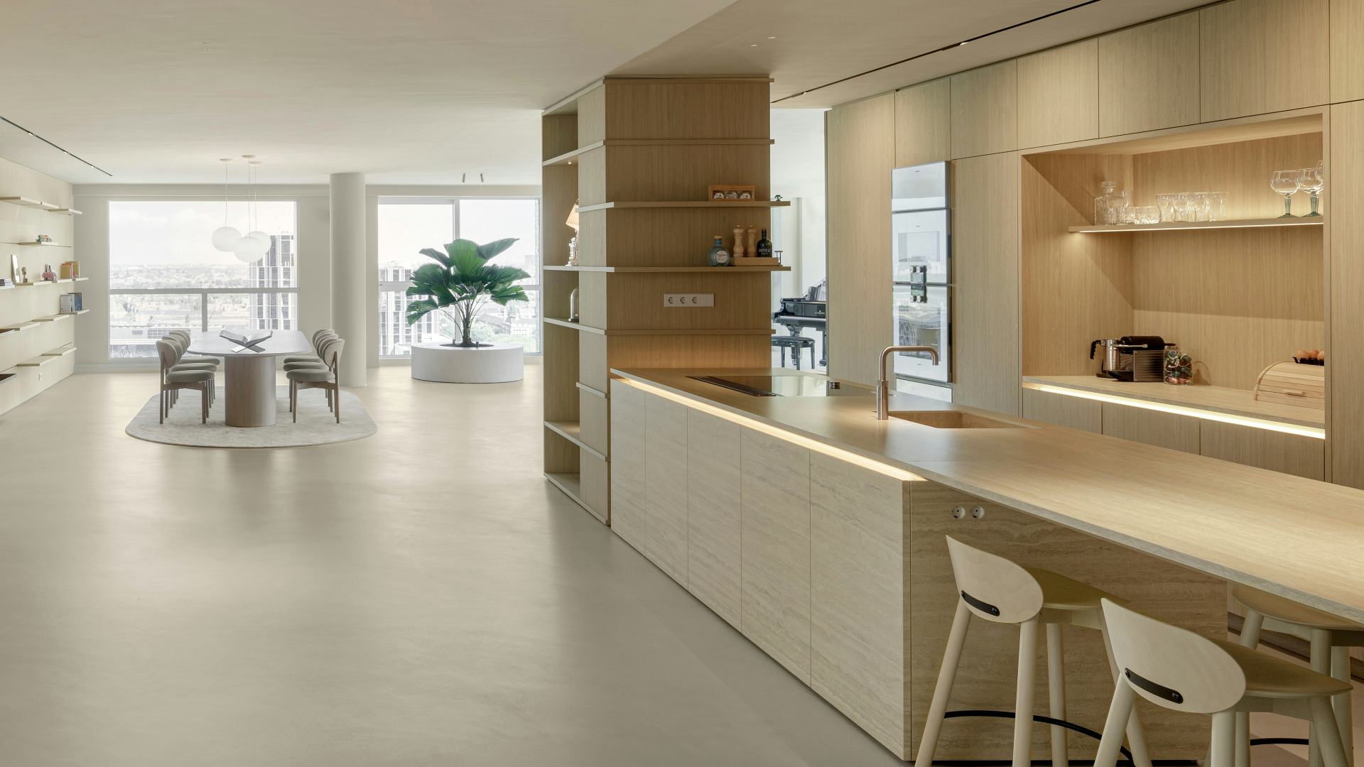 De open indeling is zorgvuldig samengesteld, met op maat ontworpen elementen die verschillende woonruimtes definiëren, terwijl een luchtige, samenhangende stroom behouden blijft. Het appartement beslaat 300 vierkante meter en beschikt over uitgestrekte houten oppervlakken en rijke texturen die een luxe, eigentijdse sfeer uitstralen.
