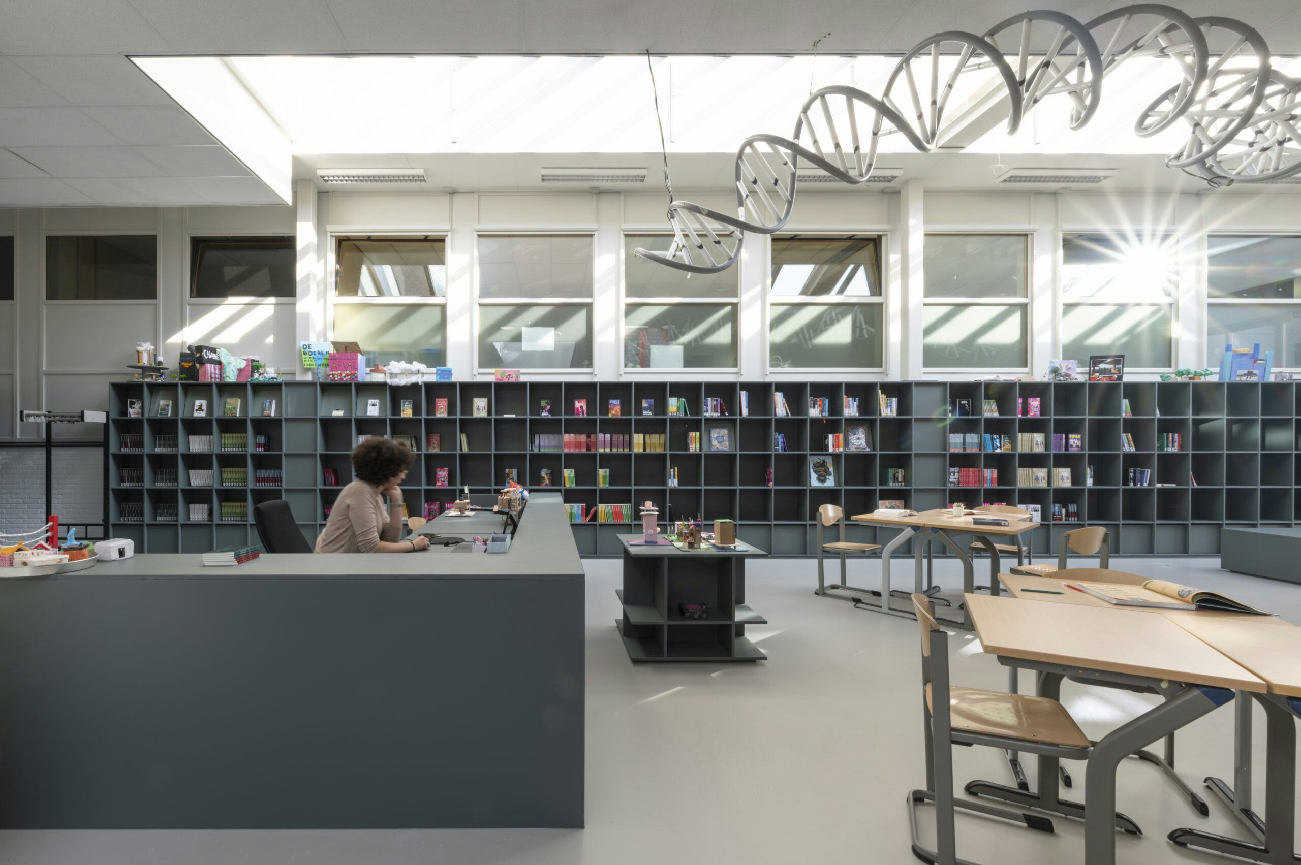 Als voorbeeld en eerste stap werd de inrichting van een aantal ruimtes vernieuwd, waaronder de mediatheek, een essentieel onderdeel van modern onderwijs dat eerder ontbrak. De mediatheek kreeg een uitnodigende uitstraling, met hoge, open kasten, goed licht en diverse studieplekken. Dit ontwerp ondersteunt verschillende manieren van werken en leren, terwijl het tegelijkertijd een rustige en inspirerende omgeving biedt. Ook de aula, de entree en de centrale trap werden aangepakt, met een focus op helderheid, openheid en een moderne uitstraling.