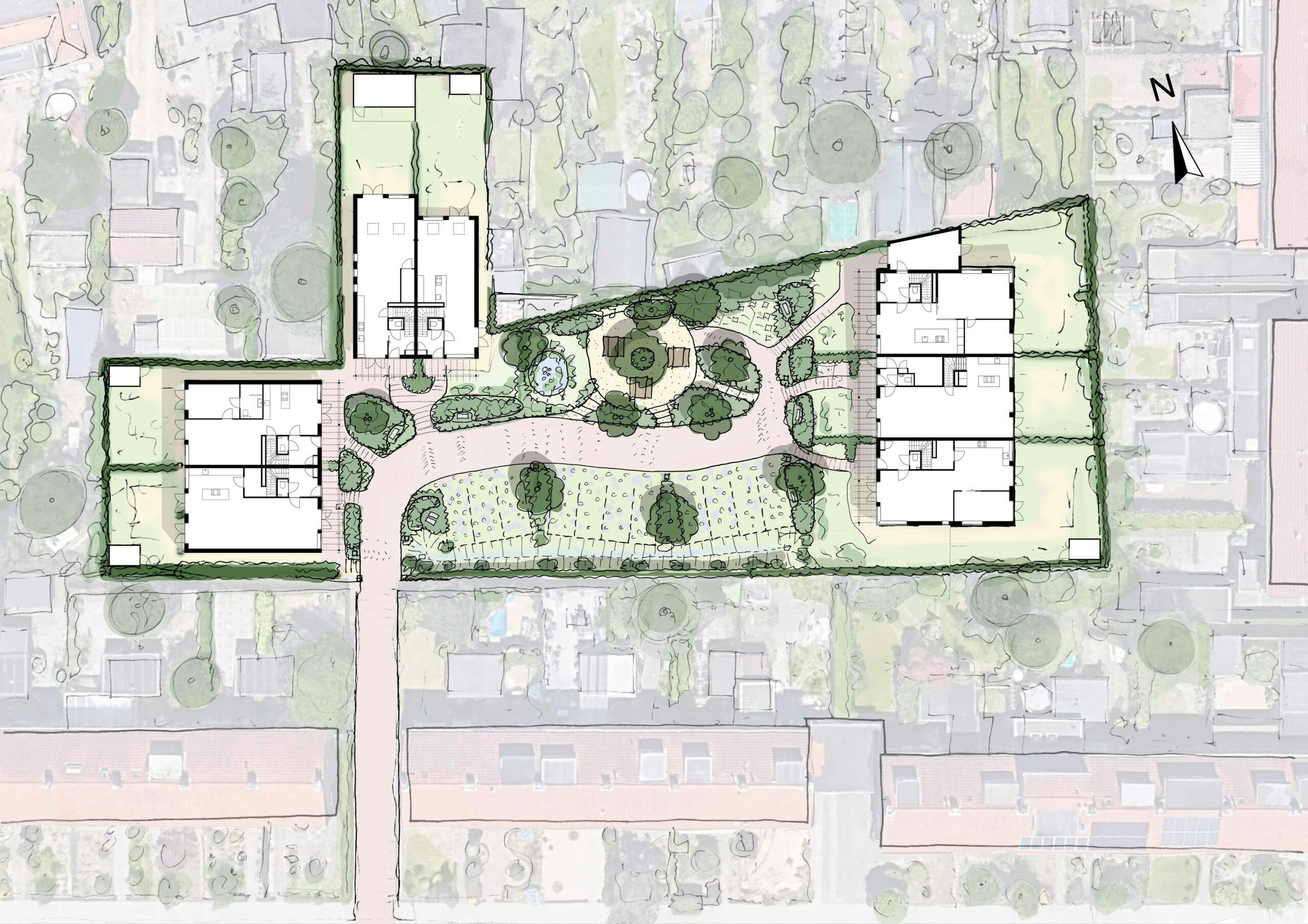 De zeven woningen delen een gemeenschappelijke binnentuin, ontworpen door landschapsarchitect Willem Jakobs. De tuin bevat onder andere bloembakken van betonklinkers die een natuurlijke grens vormen tussen privé en openbaar. Ook is er een grote notenboom geplant als middelpunt van de tuin, waar bankjes rondom komen te staan. De bewoners waren nauw betrokken bij het ontwerp van hun woningen en de tuin.