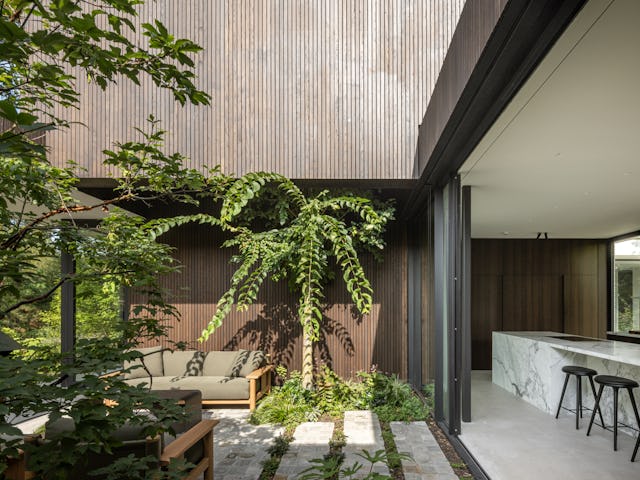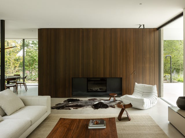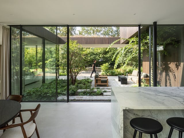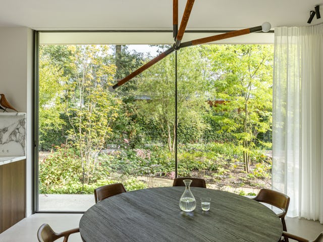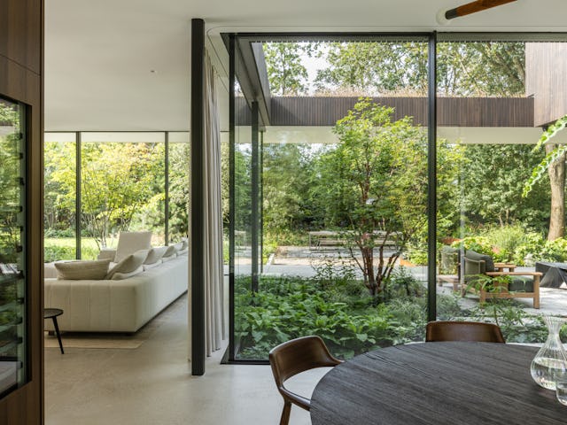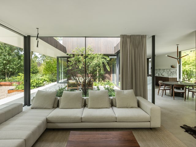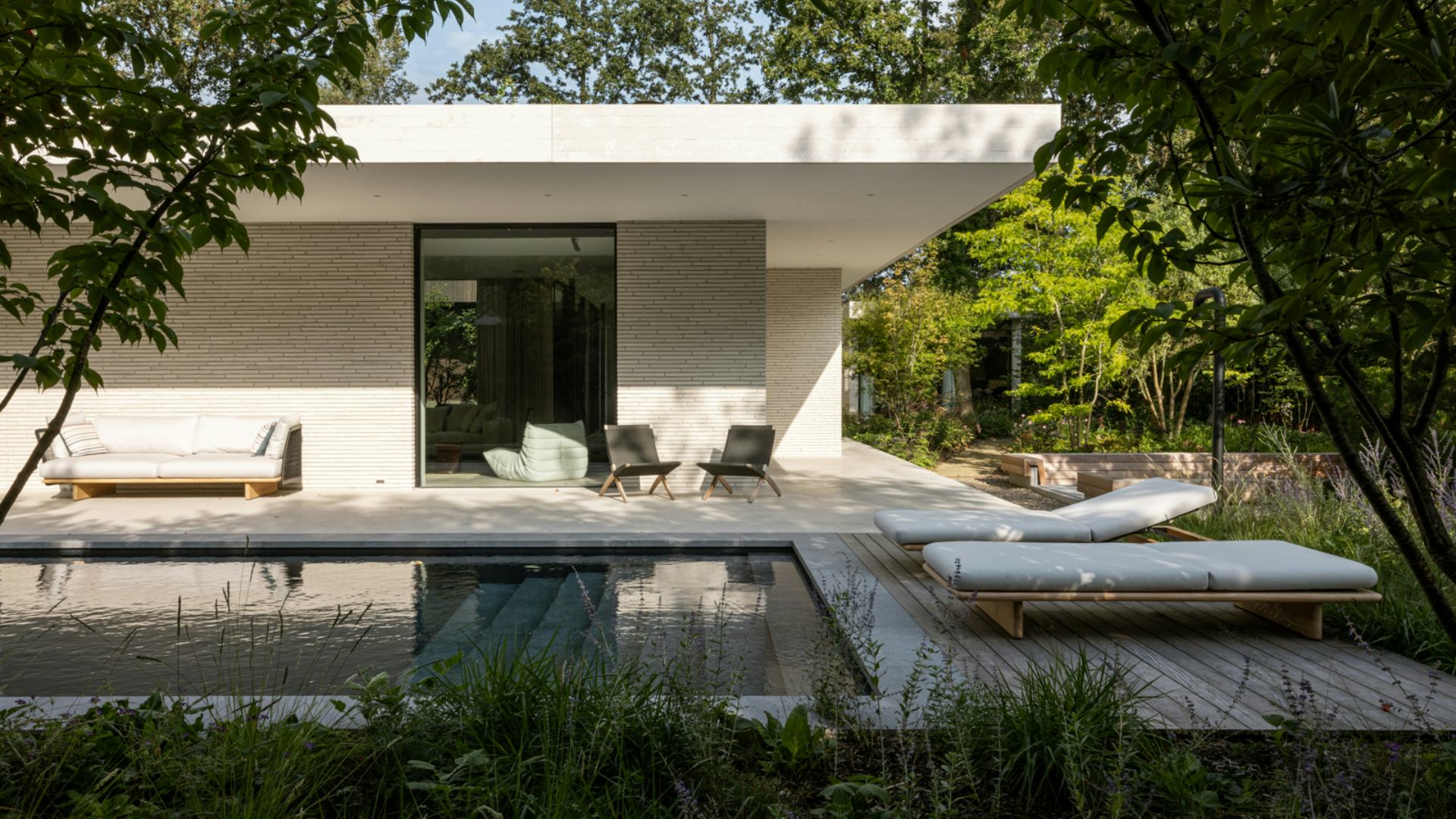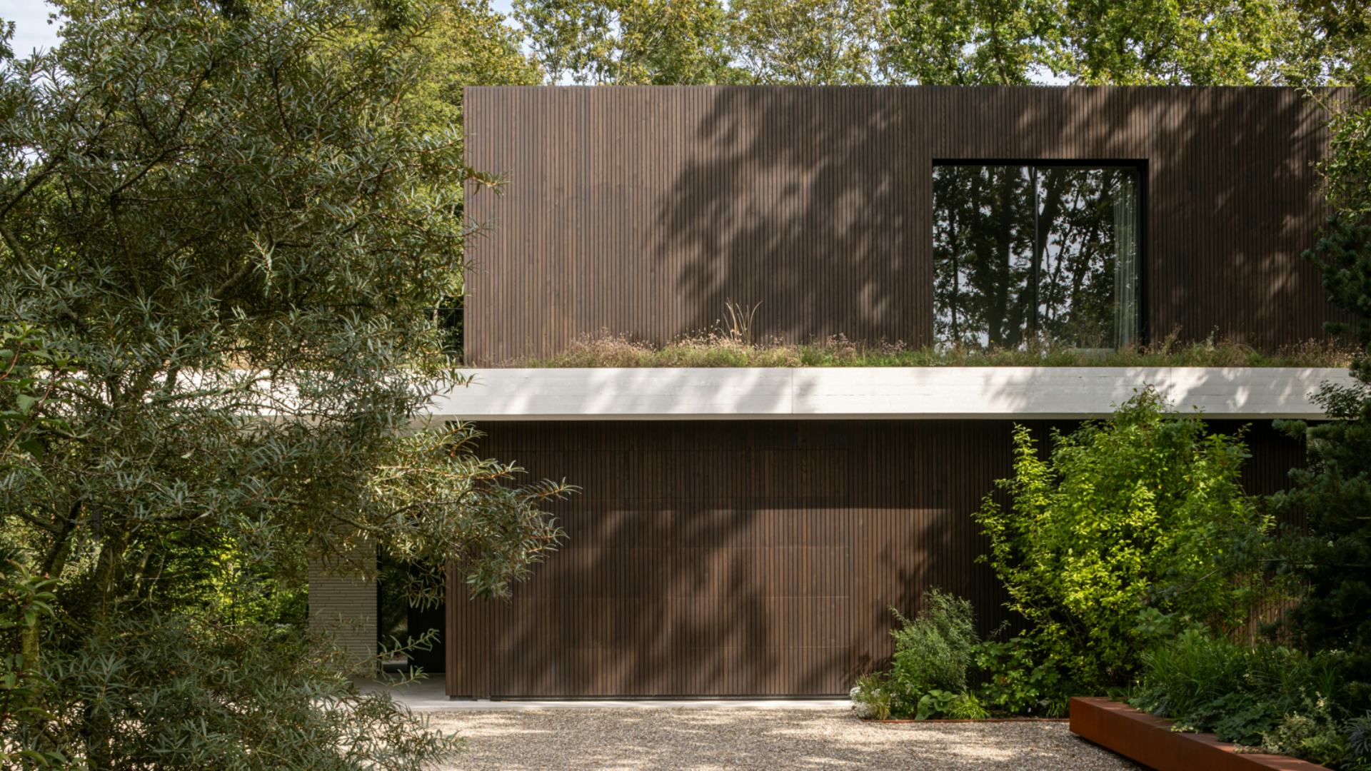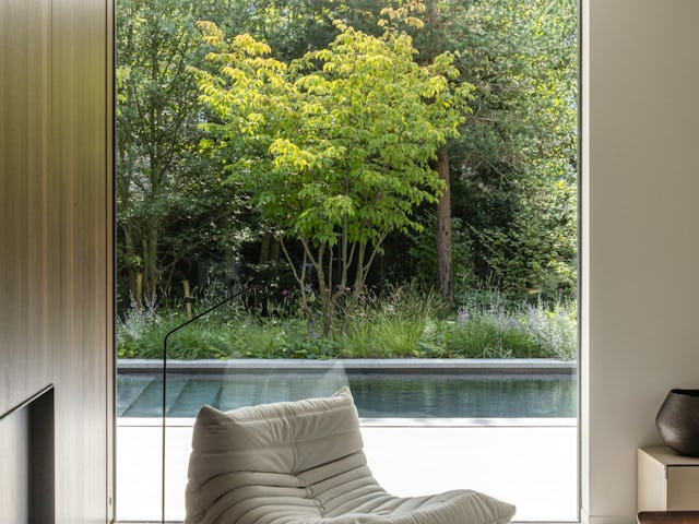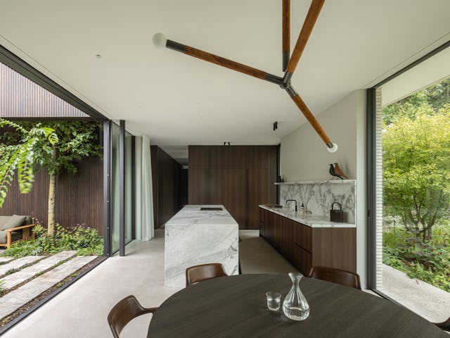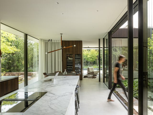 Binnenin zijn op maat gemaakt meubilair en ingebouwde kasten geïntegreerd in het ontwerp, met hoogwaardige materialen zoals donkergeoliede eiken panelen en natuurstenen keukenbladen. De verlichting is afgestemd op de verschillende ruimtes en stemmingen. De tuin omvat een zwembad, vuurplaats en een buitenkeuken, met beschutte terrassen die uitnodigen tot ontspanning. Het groen omarmt de villa en verbindt de architectuur met de natuurlijke omgeving, resulterend in een harmonieuze integratie van landschap en interieur.