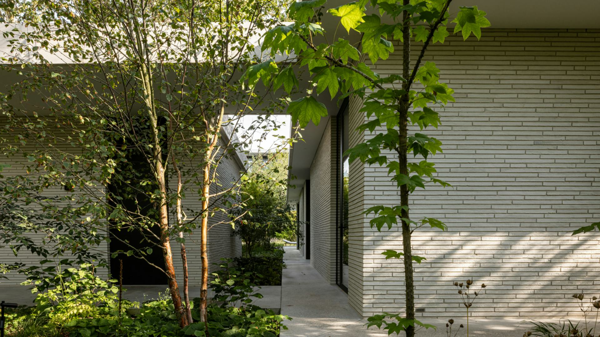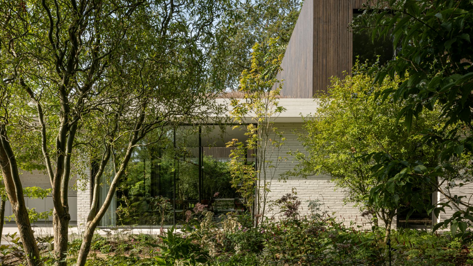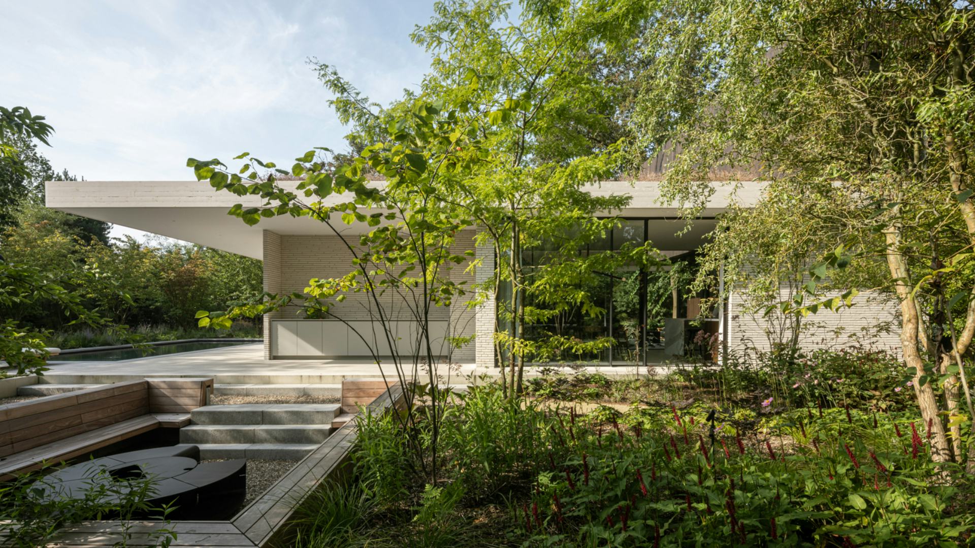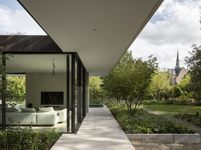 De villa is omgeven door een weelderige tuin die privacy biedt en de invloed van de omgeving minimaliseert. Bij het betreden van het kavel ervaren bewoners een nieuwe wereld, waarbij het tuinontwerp nieuwe zichtlijnen en verschillende zones creëert die vanuit de villa beleefd kunnen worden. De integratie van binnen- en buitenruimtes bevordert de connectie met de natuuromgeving.