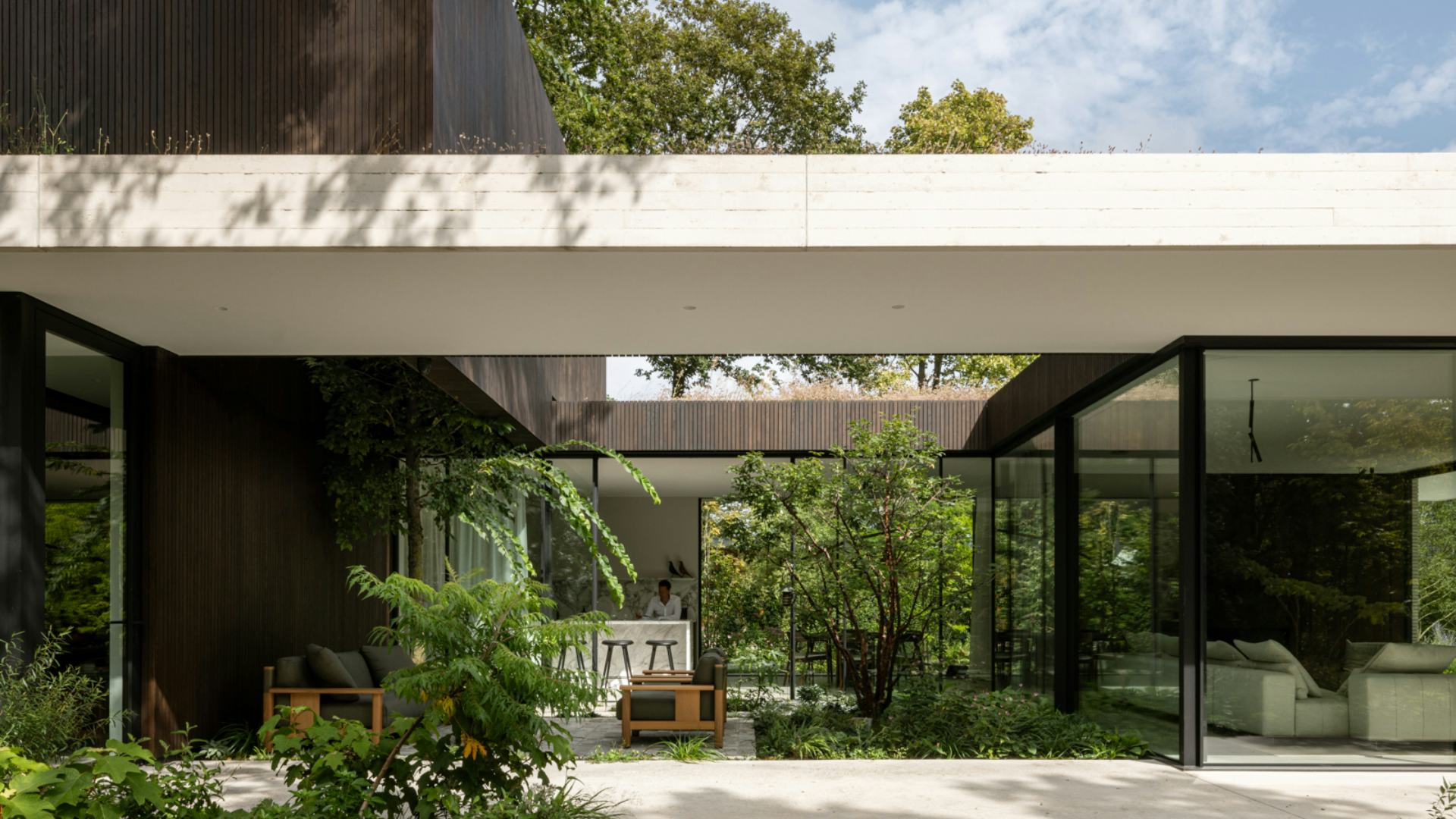 De binnenruimtes van de villa zijn ontworpen met lange zichtlijnen en doorkijkjes die transparantie bevorderen. Dubbelhoge patio’s dragen bij aan de ruimtelijkheid en verbinden de leefruimtes op de eerste verdieping met de buitenomgeving. Grote overkappingen zorgen voor bewegingsvrijheid rond de villa en beschermen tegen oververhitting, ondanks het gebruik van veel glas in de gevels.
