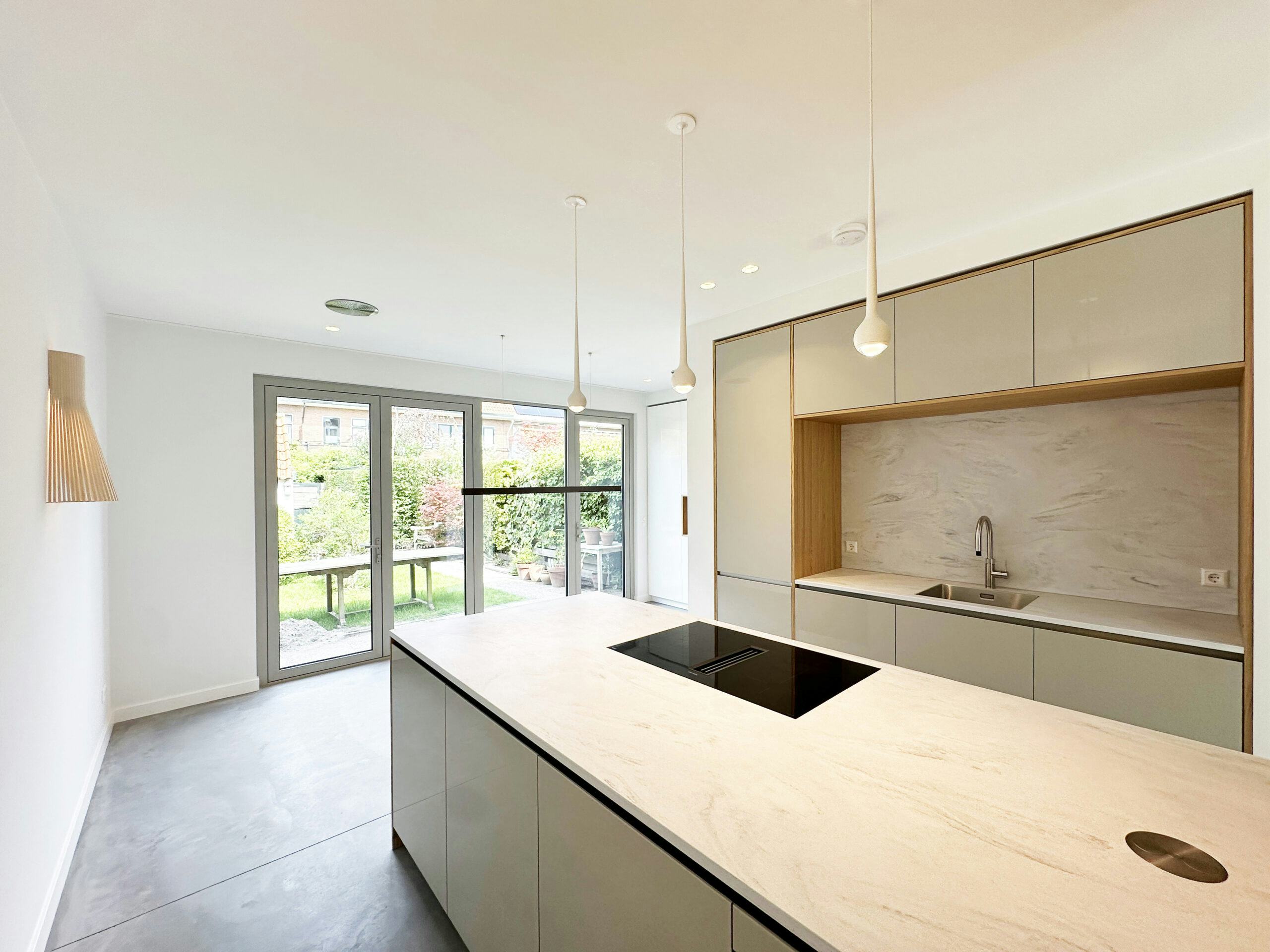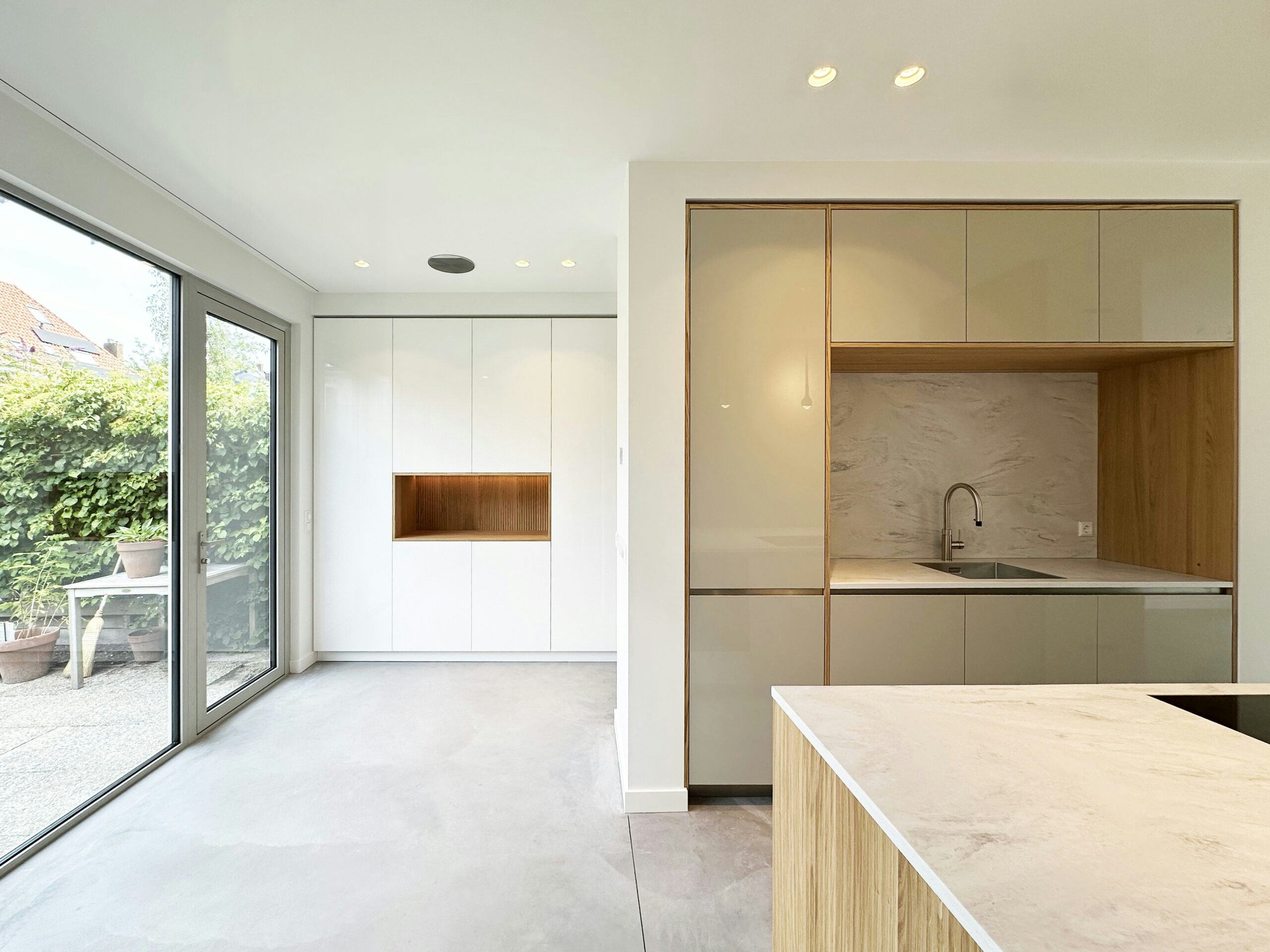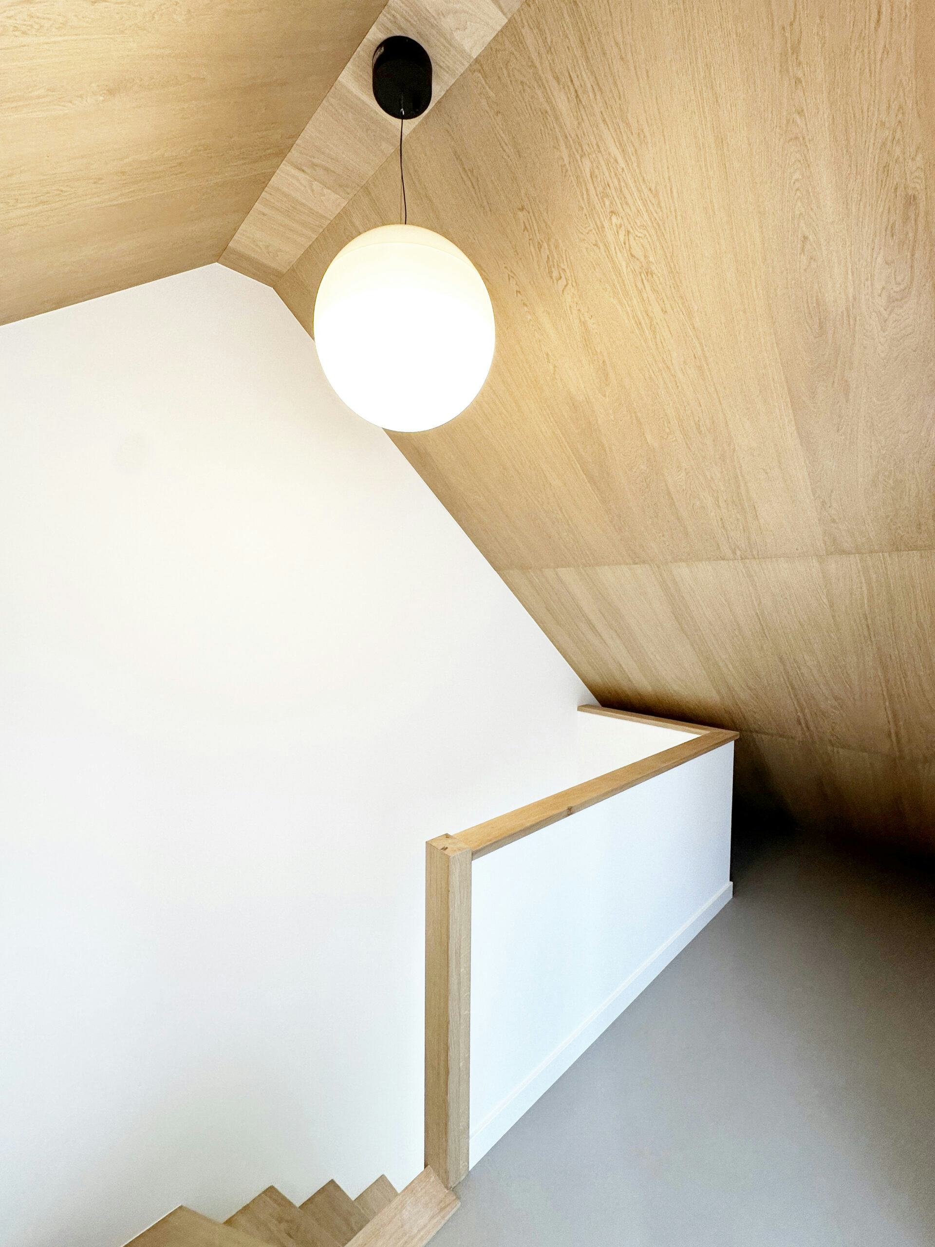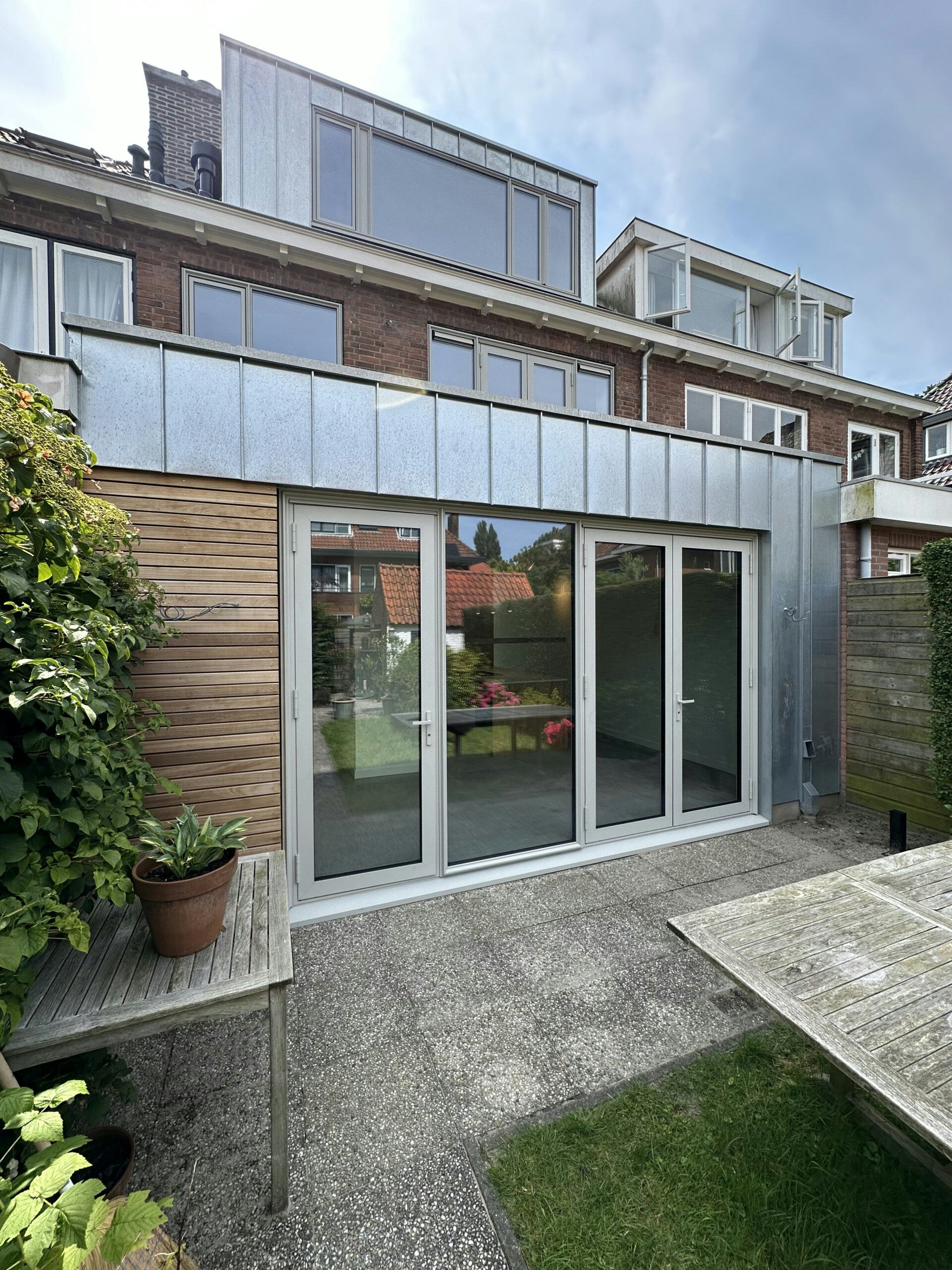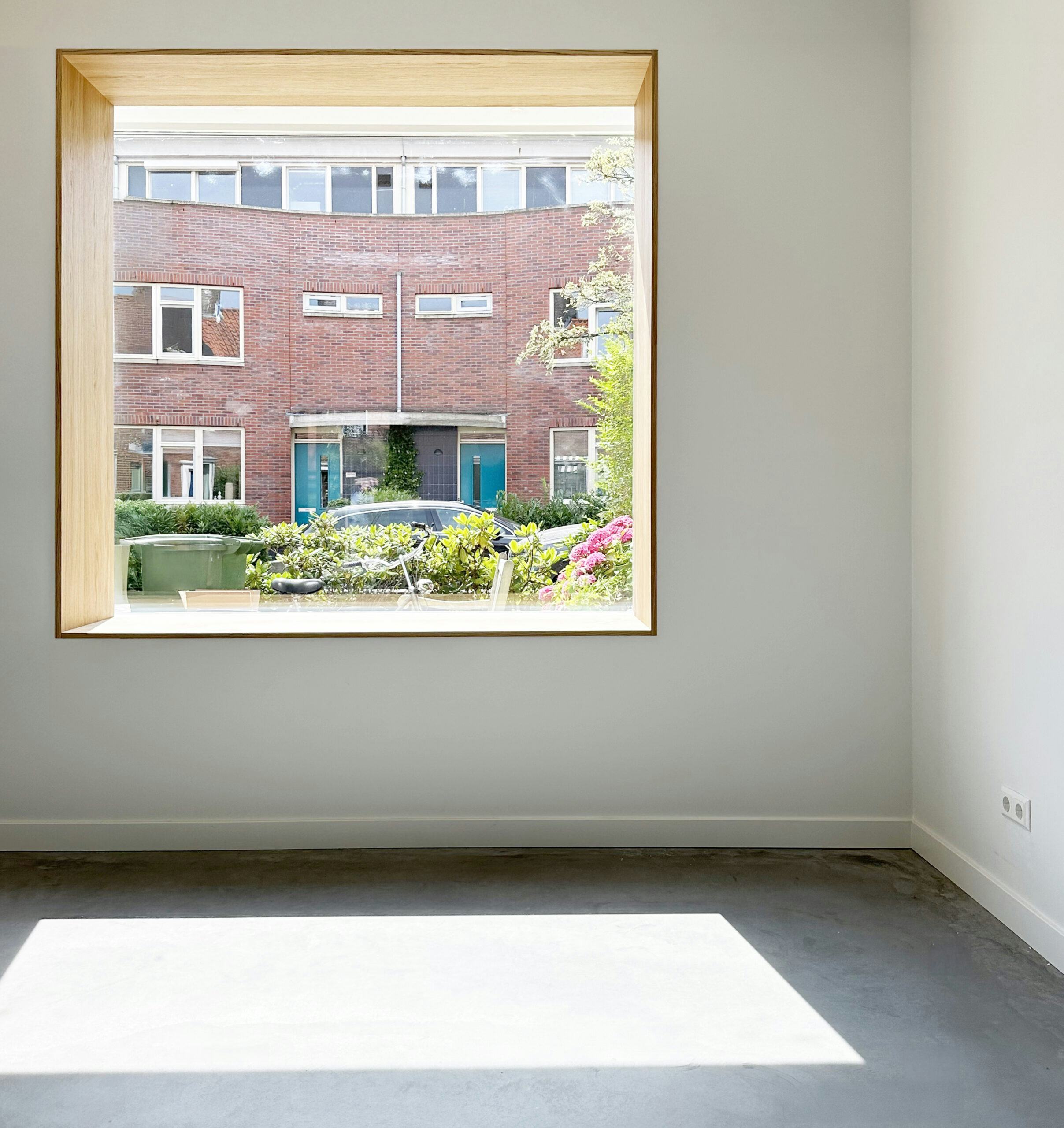 In contrast met de donkerrode baksteen zijn de uitbouw en dakkapel bekleed met zinkbanen, aangevuld met een houten gevelaccent op de begane grond. De oude houten kozijnen maakten plaats voor slanke aluminium kozijnen. Het interieur wordt gekenmerkt door een moderne, strak gestucte afwerking rondom de kastenwanden. Eikenhout vormt een tegenwicht in de vorm van trappen, nissen en de afwerking van het plafond van de zolderverdieping.