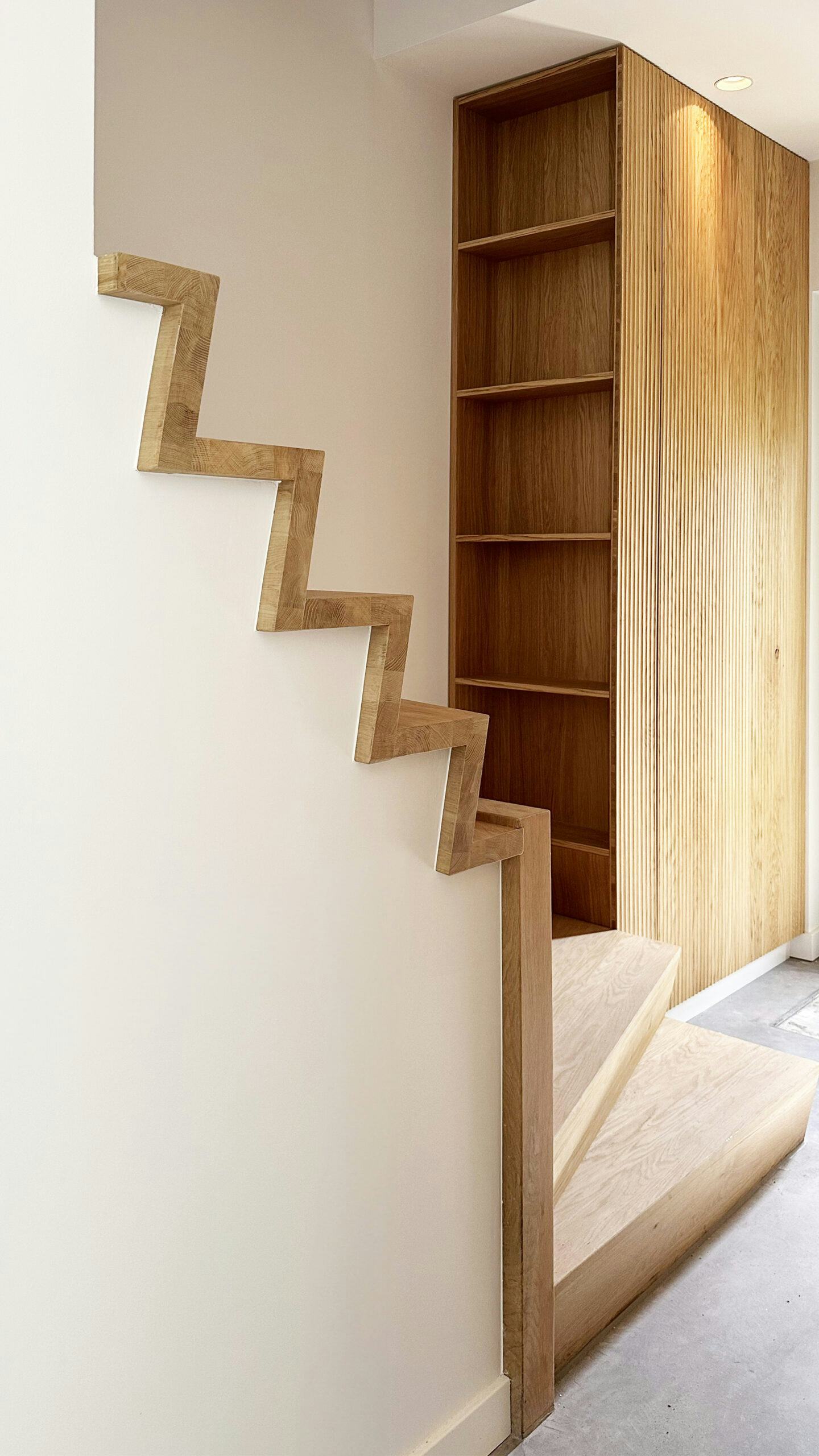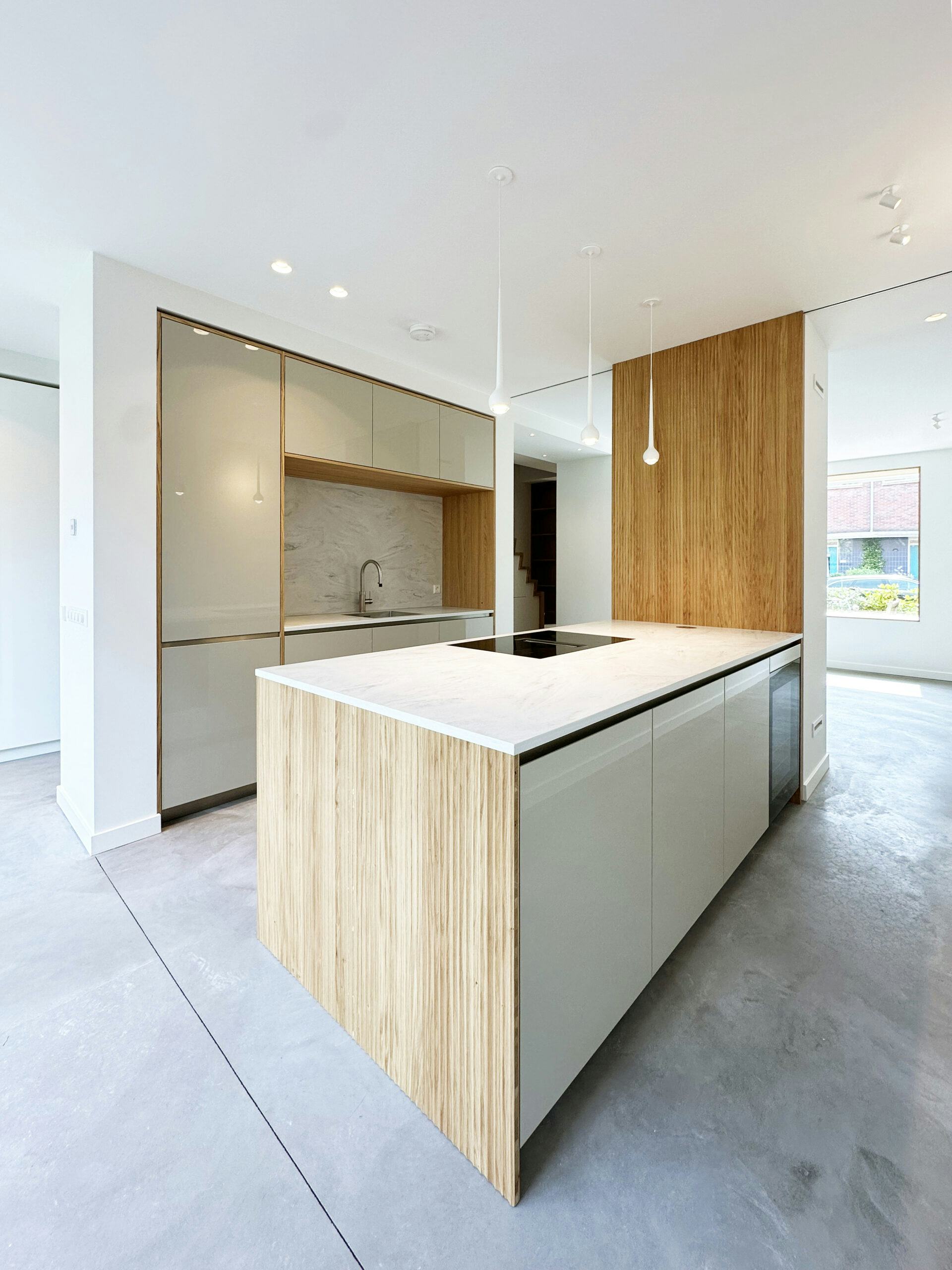 Op de bestaande bakstenen gevels, het dak en de vloerbalken van de verdieping na, is de gehele woning gestript en opnieuw opgebouwd. Een uitbreiding aan de achterzijde zorgt voor extra woonoppervlak. De expliciete wens voor een overmaat aan bergruimte werd een instrument voor de zonering en routing in de woning. Kastelementen spelen hierbij een sturende rol, vormen doorkijkjes en creëren ruimten met een hoog afwerkingsniveau.
