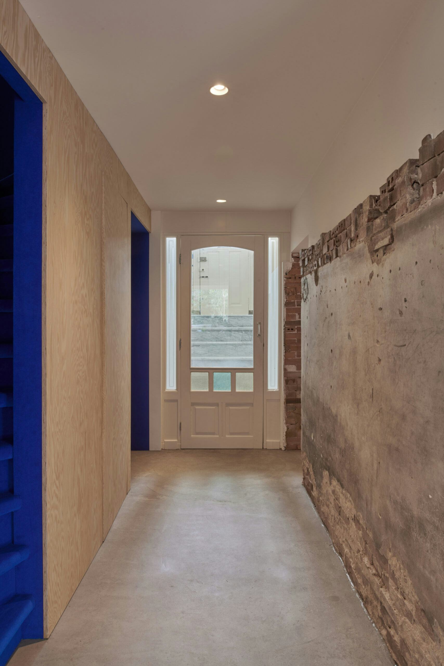 De verdiepingsvloer is plaatselijk verhoogd en het balkon aan de achtergevel is verwijderd om ruimte te maken voor een 5m hoge vide. Het interieur kenmerkt zich door contrasten, de open trap van Radiplex vormt een visuele verbinding, terwijl een intieme trap met blauw vilt naar private ruimtes leidt. De oude doorgezaagde balken van de verdiepingsvloer zijn zichtbaar gelaten. Daarnaast is het ruwe casco op diverse plekken blootgelegd, zoals bij de betonnen kelderwanden en het ruwe metselwerk.