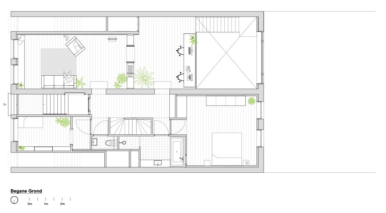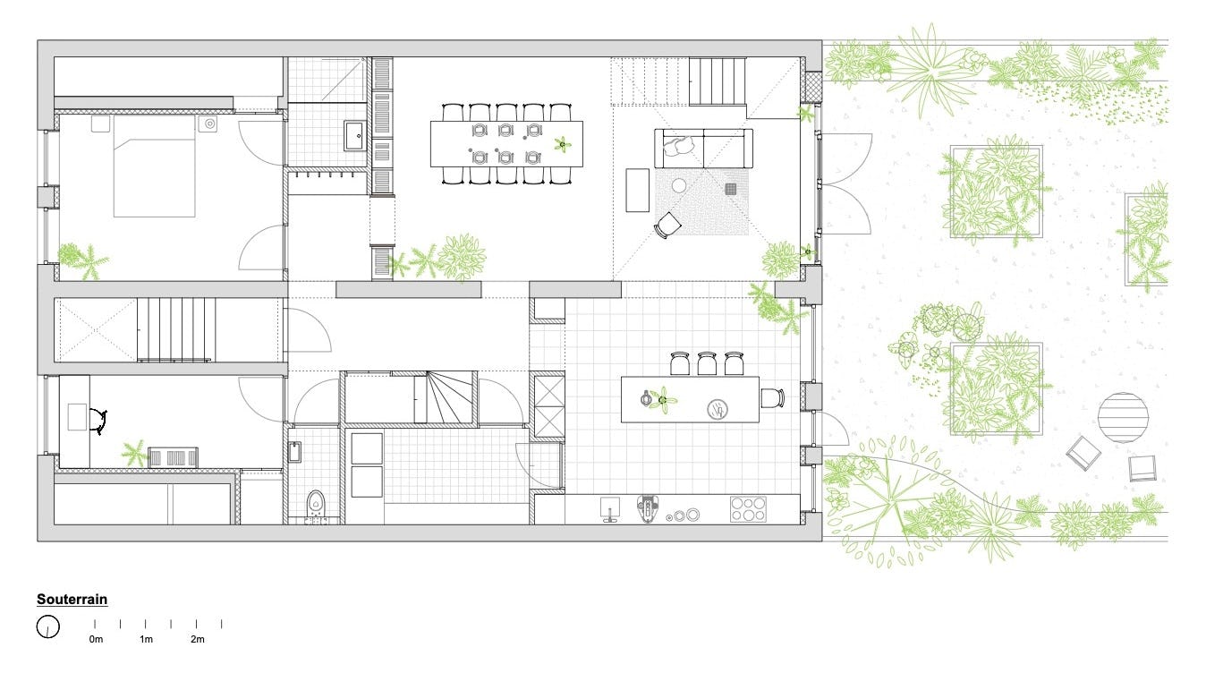 De stadswoning bestond uit twee geschakelde woningen. De entreetrap leidde omhoog, met daaronder een nauwelijks begaanbare kelderruimte. De eerste ingreep was het omdraaien van de traprichting. Het resultaat is dat bij binnenkomst en de daaropvolgende afdaling een connectie met de tuin wordt gemaakt. De belangrijkste leefruimtes zijn verplaatst naar het souterrain. De tweede ingreep had als doel alle ruimtes tot volwaardige leefverdiepingen te transformeren. Zo is de funderingsvloer vernieuwd, d
