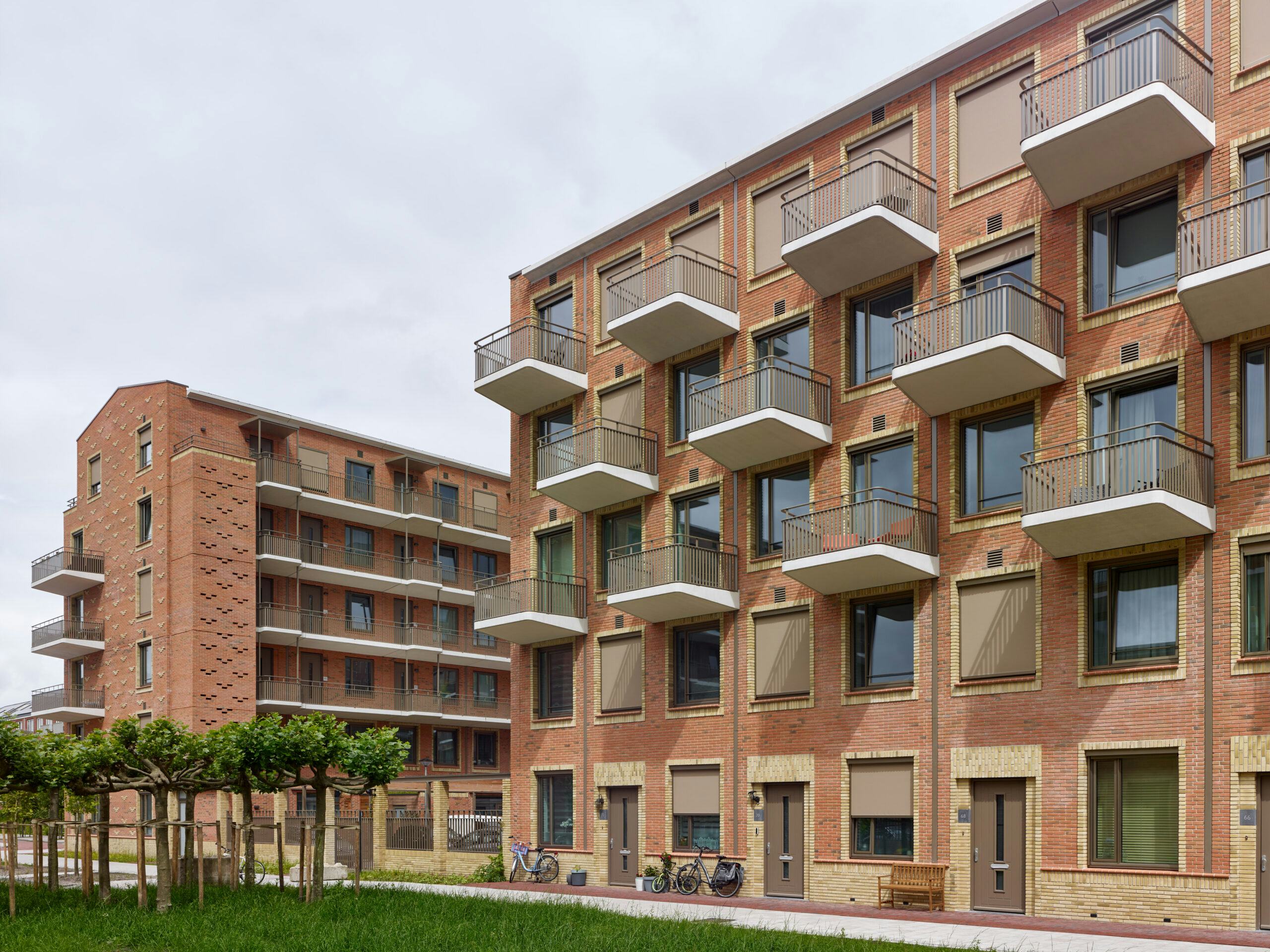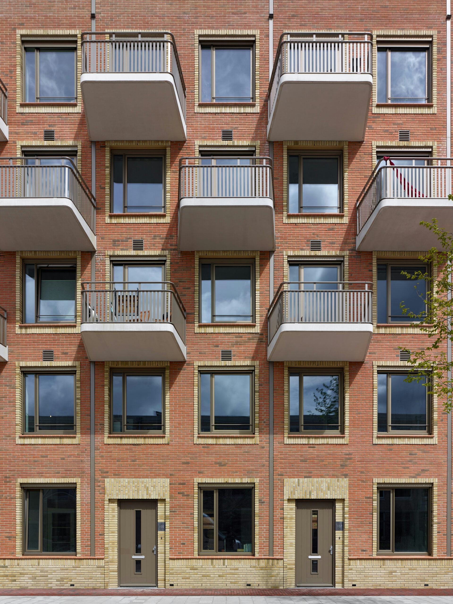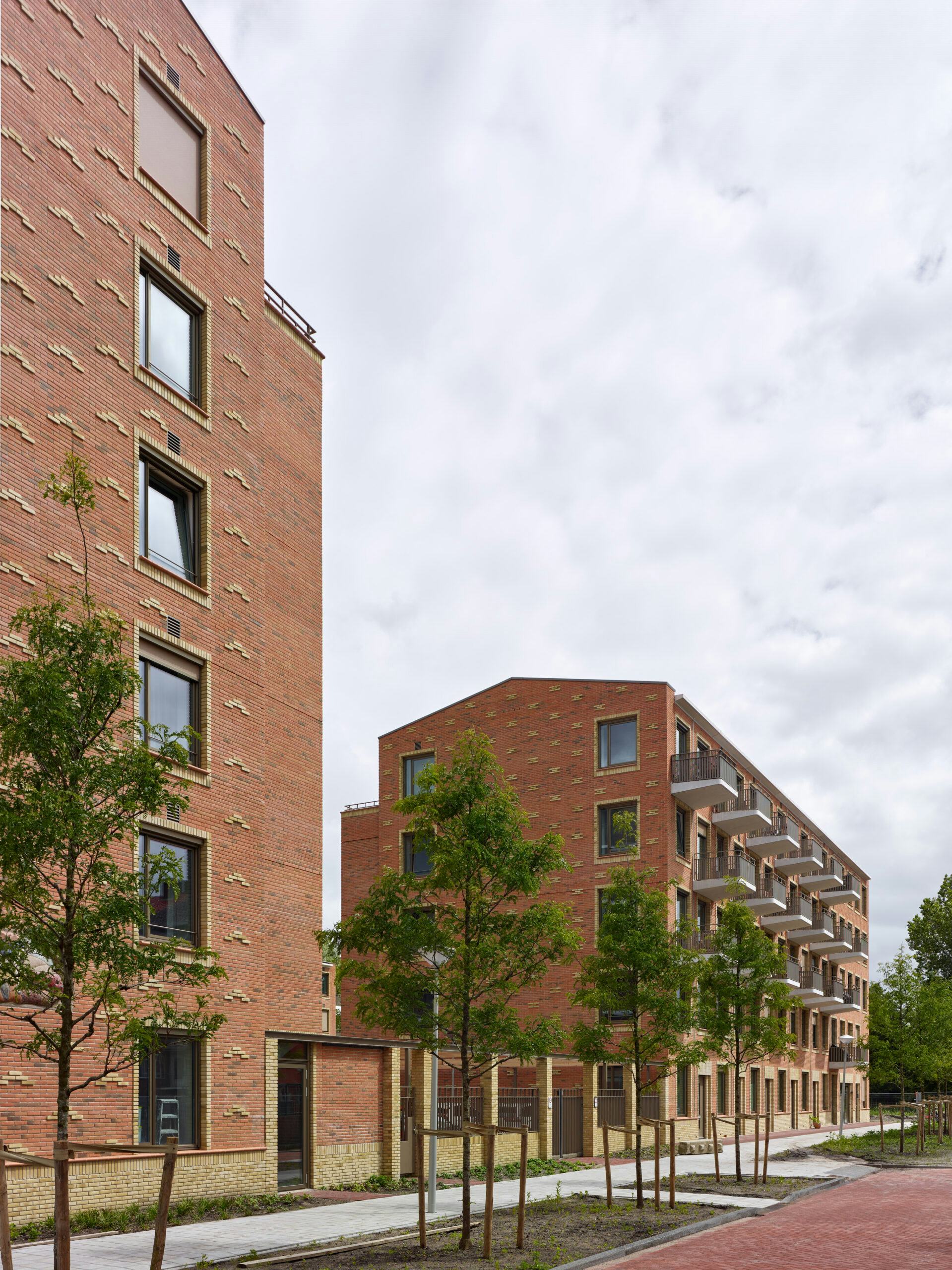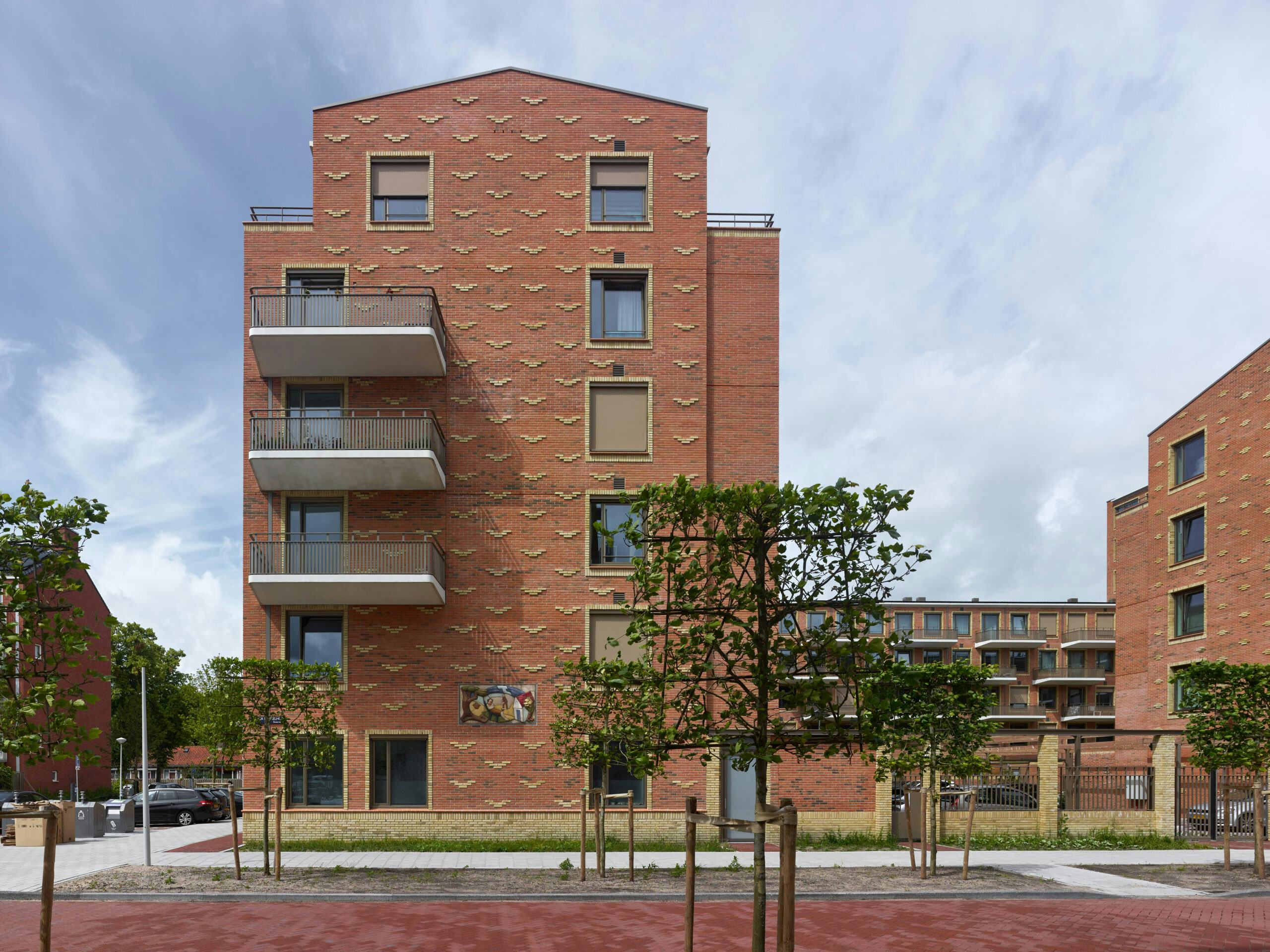 Baksteen speelt een sleutelrol in het project. Het metselwerk geeft de gebouwen zowel een eigentijds als tijdloos karakter. De gevels bestaan uit rood bakstenen metselwerk, met gele bakstenen kozijnen die de ramen en ingangen markeren. De kopgevels bevatten speelse patronen van gele baksteen, waarmee de blokken zich van elkaar onderscheiden. De balkons liggen buiten het gevelvlak. Ze zijn aan de onderzijde afgeschuind en hebben afgeronde hoeken.