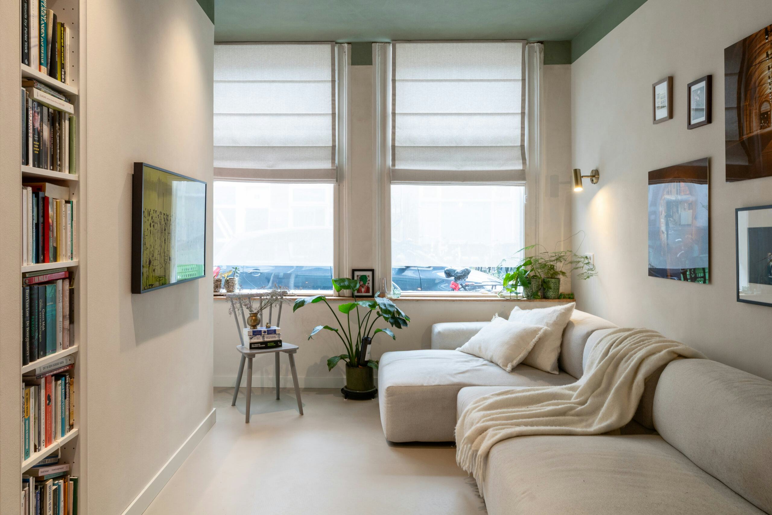 De oorspronkelijke structuur van de benedenwoning is door het ontwerp teruggebracht. De voorkamer is nu geen slaapkamer meer, maar de leefruimte, zoals het oorspronkelijk ook is gebouwd. Deze voorkamer en achterruimte zijn samengetrokken, waarin nu gekookt en gewerkt kan worden. De zithoek kijkt weer uit op de straat. De nieuwe pui zorgt voor een kwalitatieve verbinding met de stadstuin. Het resultaat is een lichte, open woning met een moderne twist op de oorspronkelijke indeling.