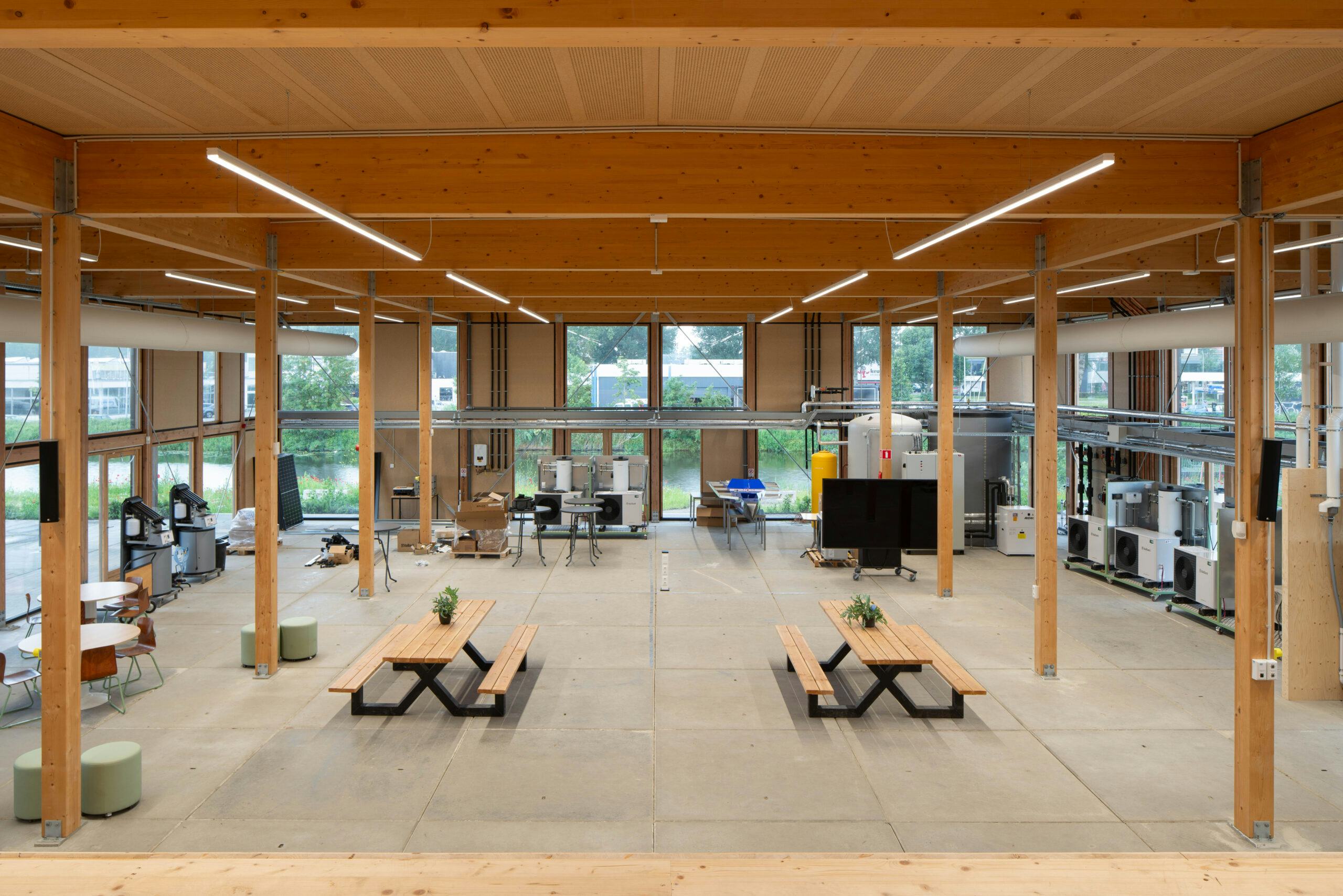 De Energiehub 050 is gerealiseerd door een intensief co-creatieproces met architect, onderwijsvakgroep en aannemer. Middels een circulaire ontwerpaanpak hebben we gelijktijdig gewerkt aan het ontwerpen van een flexibel bouwconcept met maximale herbruikbaarheid binnen een beperkt budget, het oogsten van materialen en het creëren van een stimulerende leeromgeving op maat. Deze samenwerking resulteerde in een circulair en natuurinclusief onderwijspaviljoen.